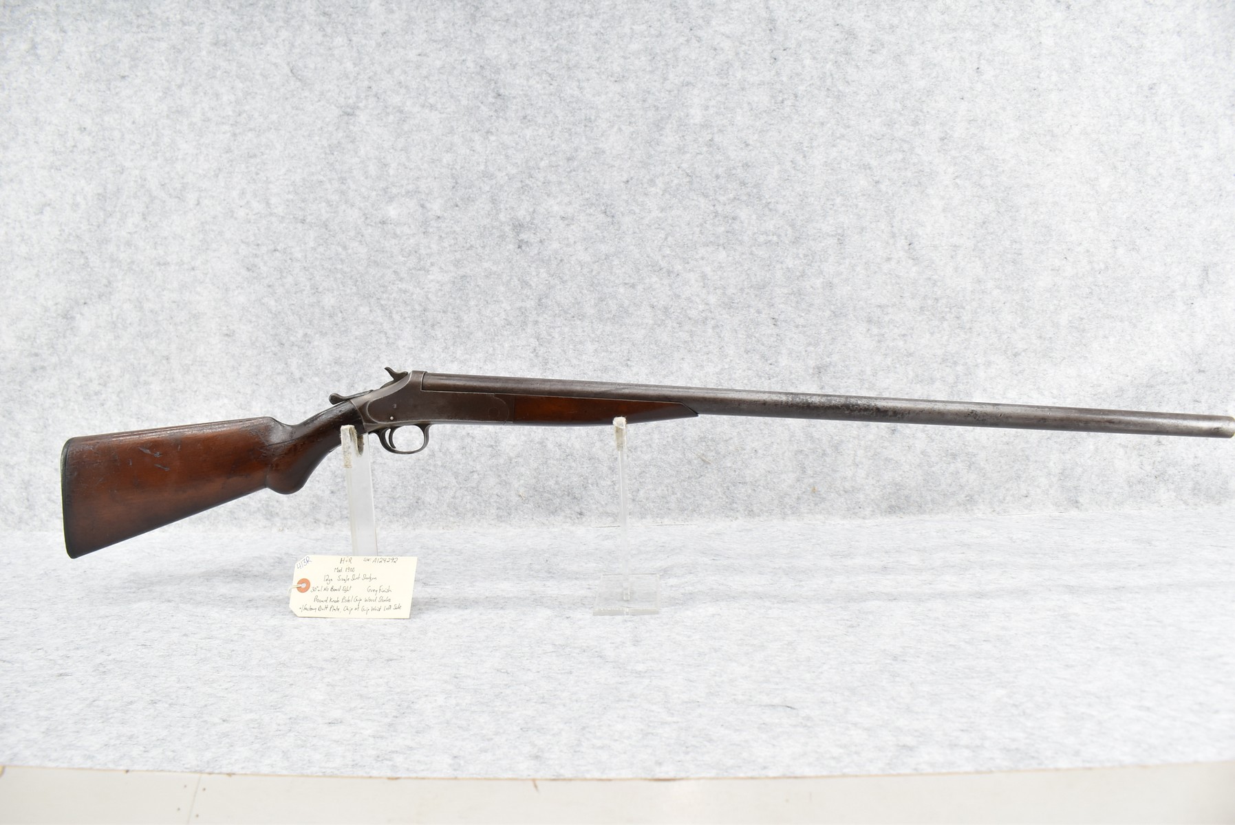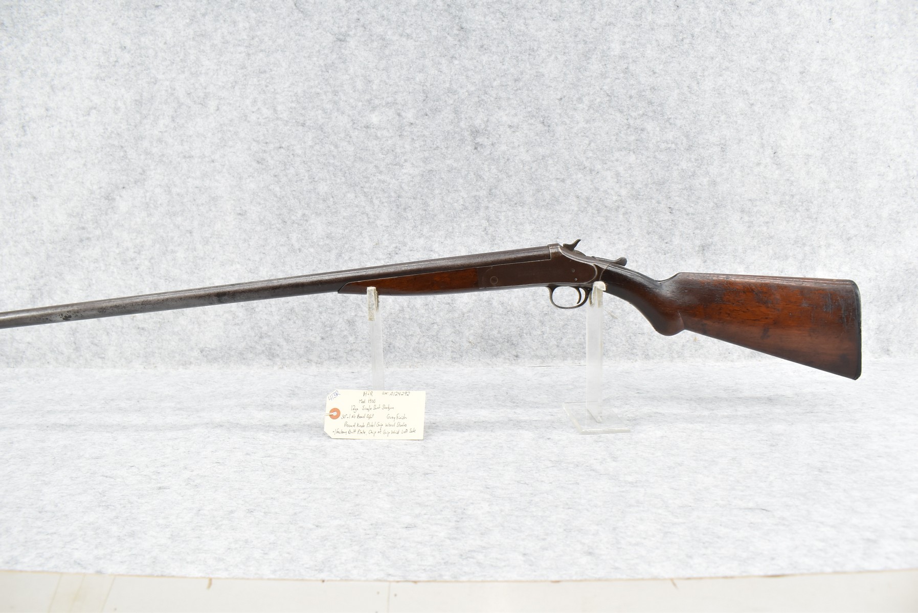 413R. H. & R. – Mod. 1900 – 12ga. Single Shot Shotgun – w/30” Barrel (No Bead Sight) – Gray Finish – w/Round Knob Pistol Grip Wood Stocks w/Factory Butt Plate – Note: Chip at Grip Wrist on Left Side