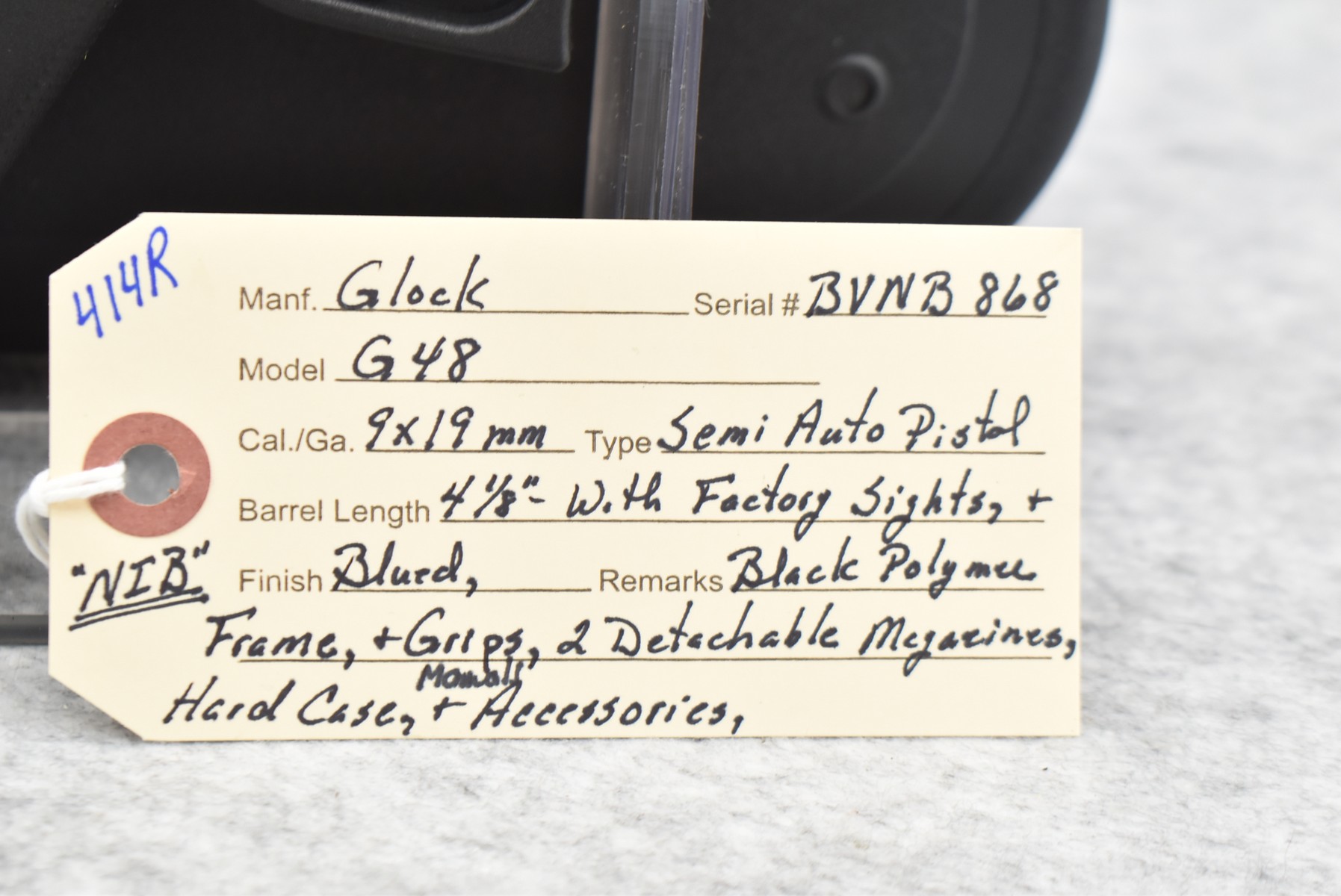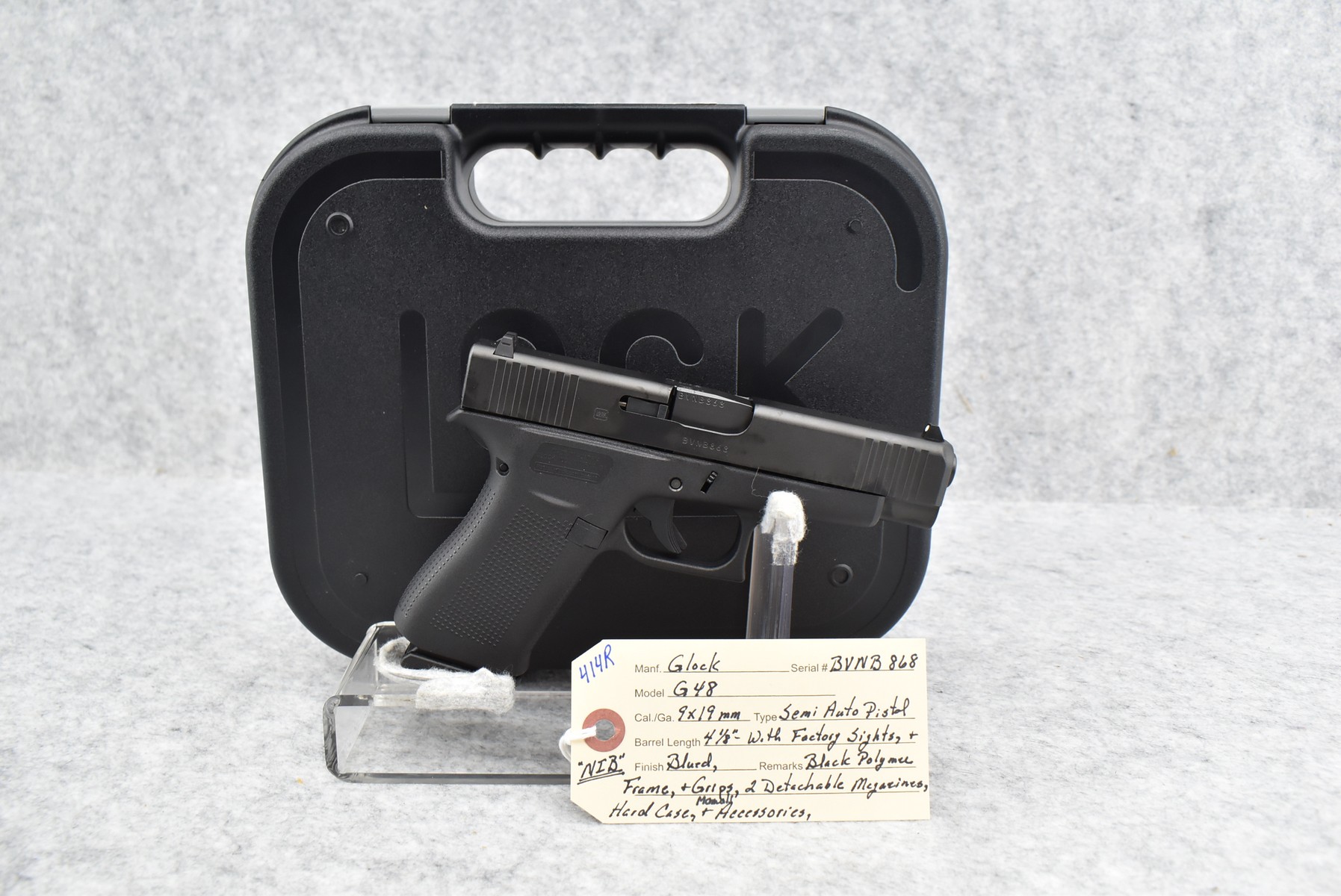 414R.     Glock – Mod. G48 – 9x19mm Cal. Semi-Auto Pistol – w/4 1/8” Barrel w/Factory Sights – Blued Finish – w/Black Polymer Frame & Grips – w/2 Detachable Magazines – New w/Hard Case, Manuals & Accessories