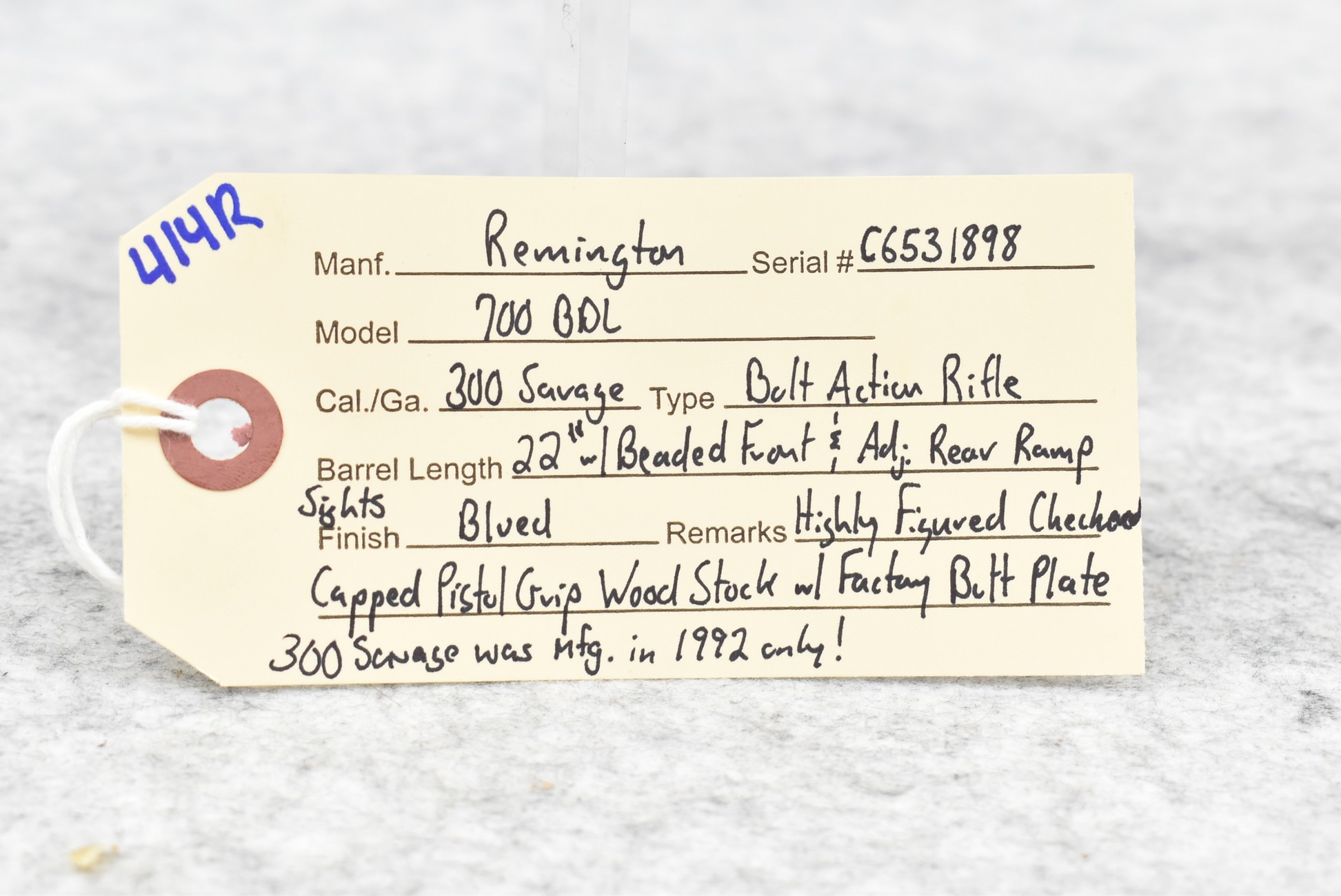 414R Remington – Mod. 700 BDL – 300 Sav. Cal. Bolt Action Rifle – w/22” Barrel w/Beaded Front & Adj. Rear Ramp Sights – Blued Finish – w/Highly Figured Checkered Capped Pistol Grip Wood Stock w/Factory Butt Plate