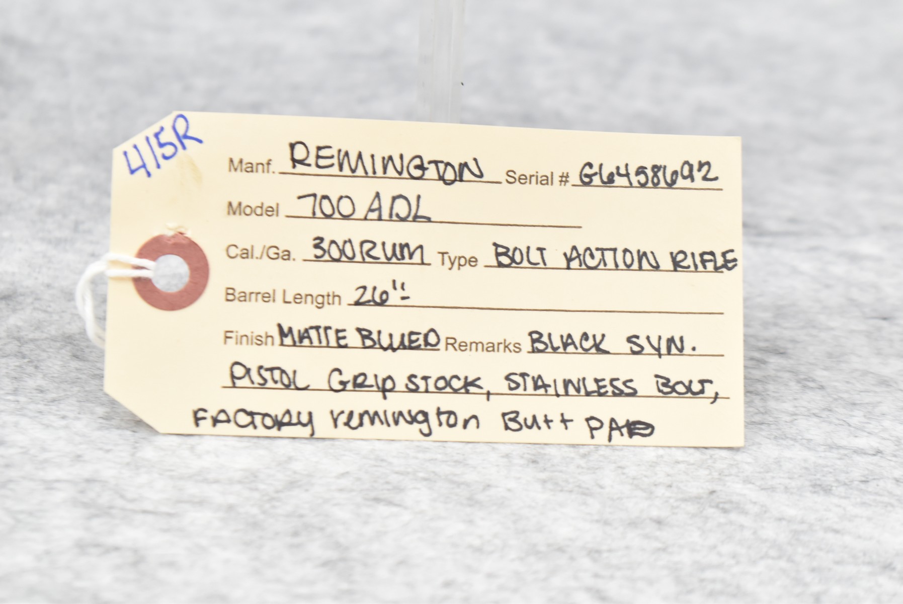 415R. Remington – Mod. 700 ADL – 300 RUM Cal. Bolt Action Rifle – w/26” Barrel – Matte Blued Finish – w/Black Synthetic Pistol Grip Stock w/Factory Butt Pad – w/Stainless Bolt