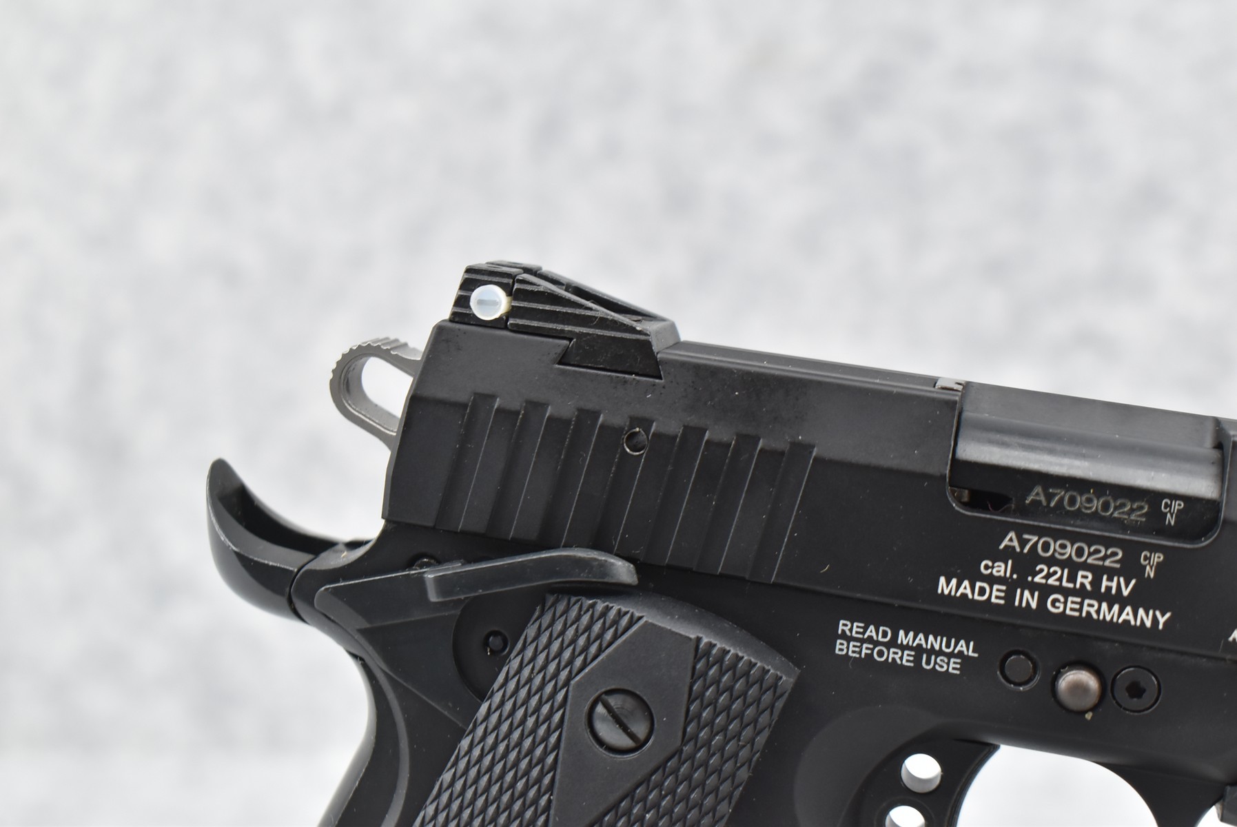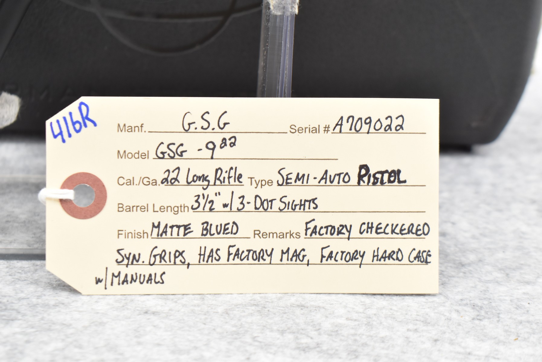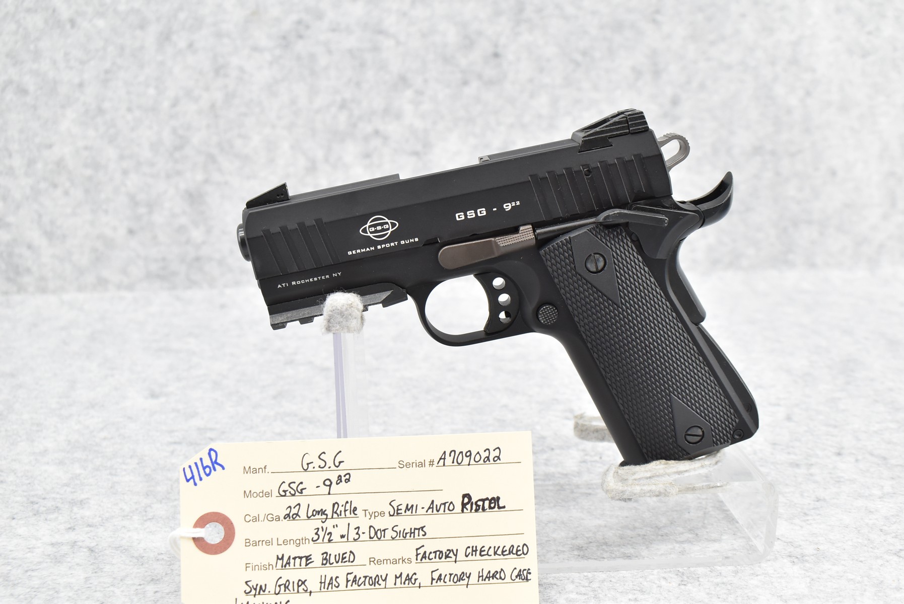 416R. G.S.G. – Mod. GSG-922 – 22LR Cal. Semi-Auto Pistol – w/3½” Barrel w/3-Dot Sights – Matte Blued Finish – w/Factory Checkered Synthetic Grips – w/Factory Magazine – w/Factory Hard Case and Manuals