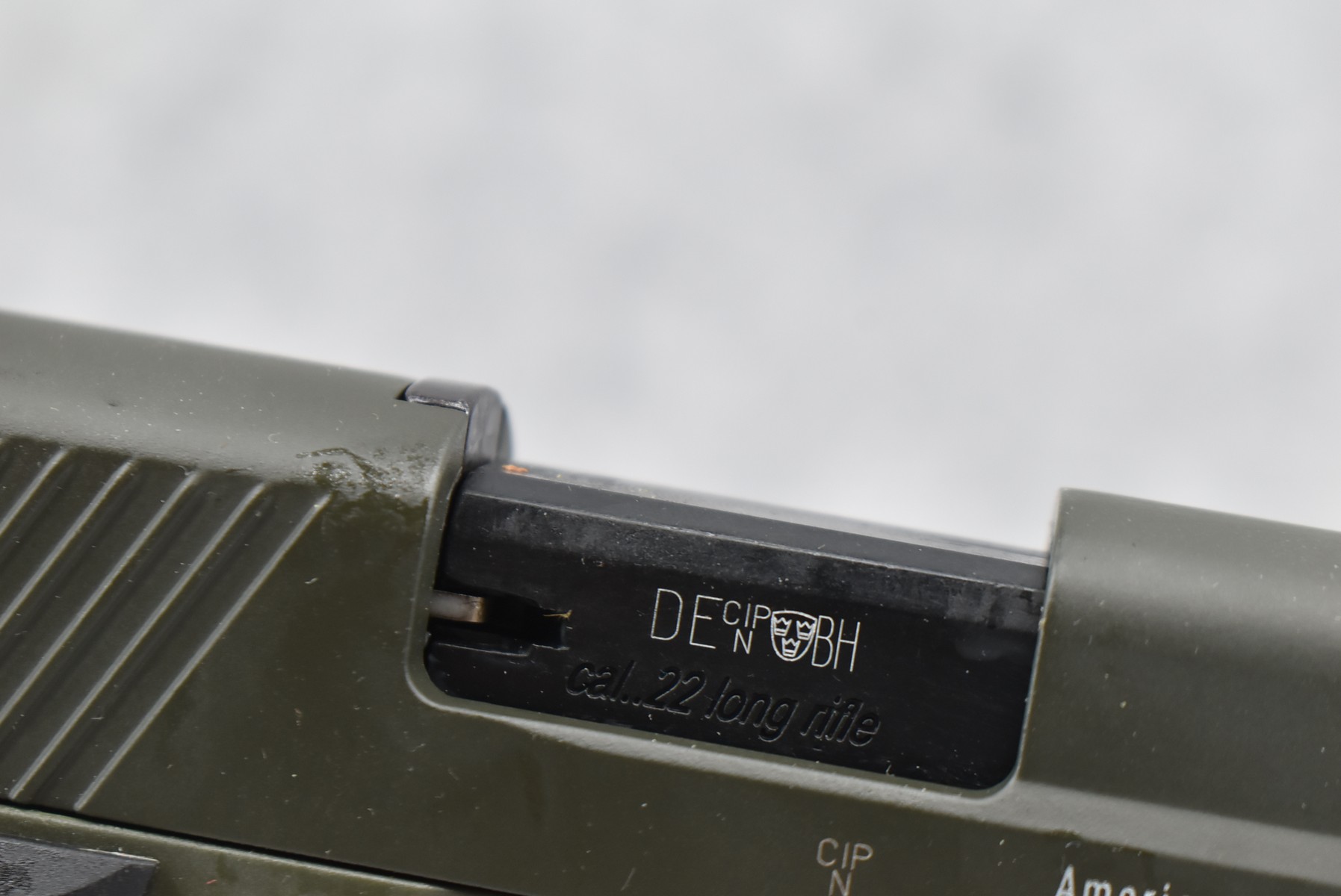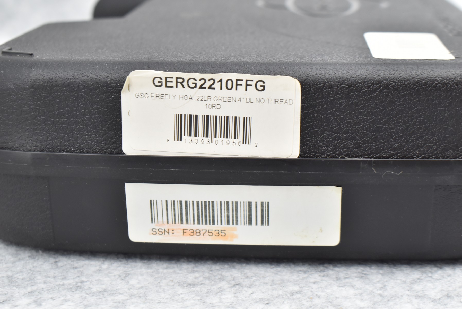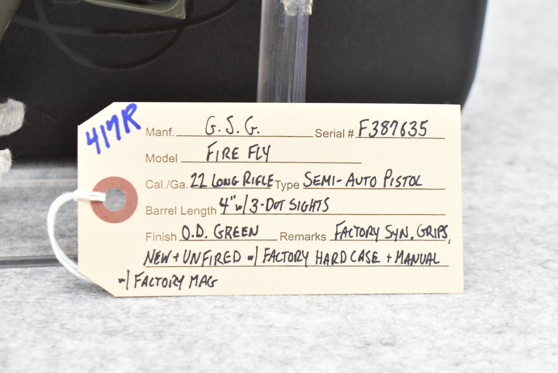 417R. G.S.G. – Mod. Fire Fly – 22LR Cal. Semi-Auto Pistol – w/4” Barrel w/3-Dot Sights – O.D. Green Finish – w/Factory Synthetic Grips – New and Unfired w/Factory Hard Case, Manual, and Factory Magazine