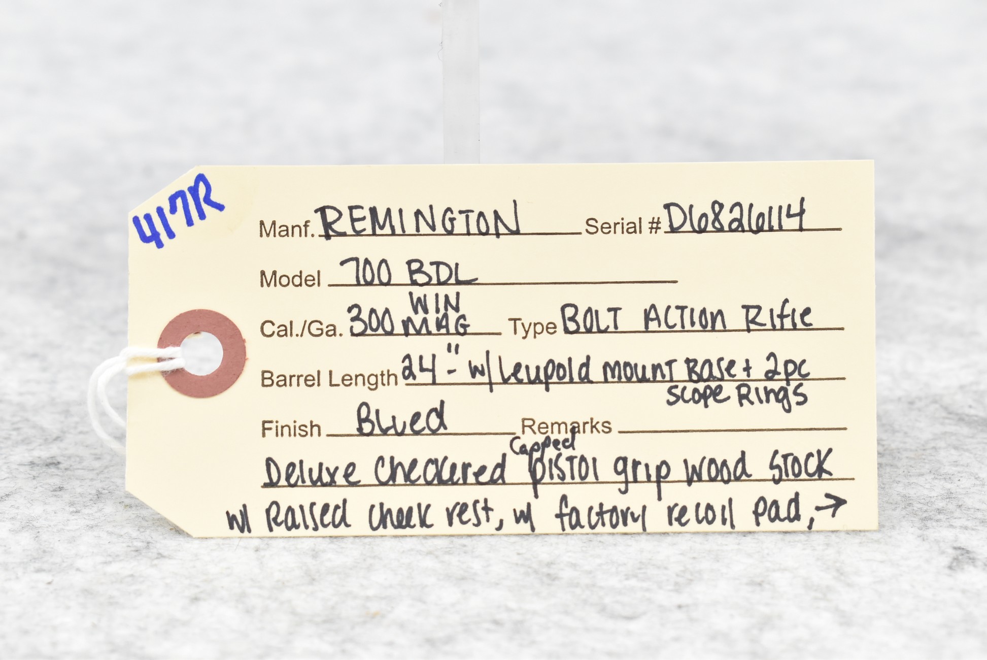 417R. Remington – Mod. 700 BDL – 300 Win. Mag. Cal. Bolt Action Rifle – w/24” Barrel – Blued Finish – w/Deluxe Checkered Capped Pistol Grip Wood Stock w/Raised Cheek Piece w/Factory Recoil Pad – w/Leupold Mount Base & 2pc. Scope Rings – Discontinued in 2007