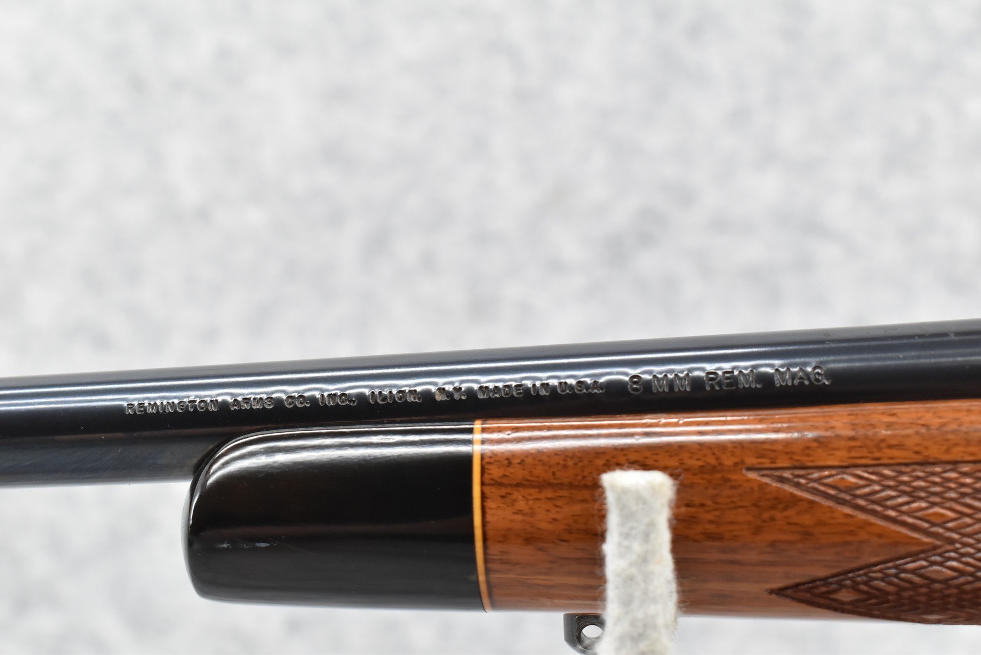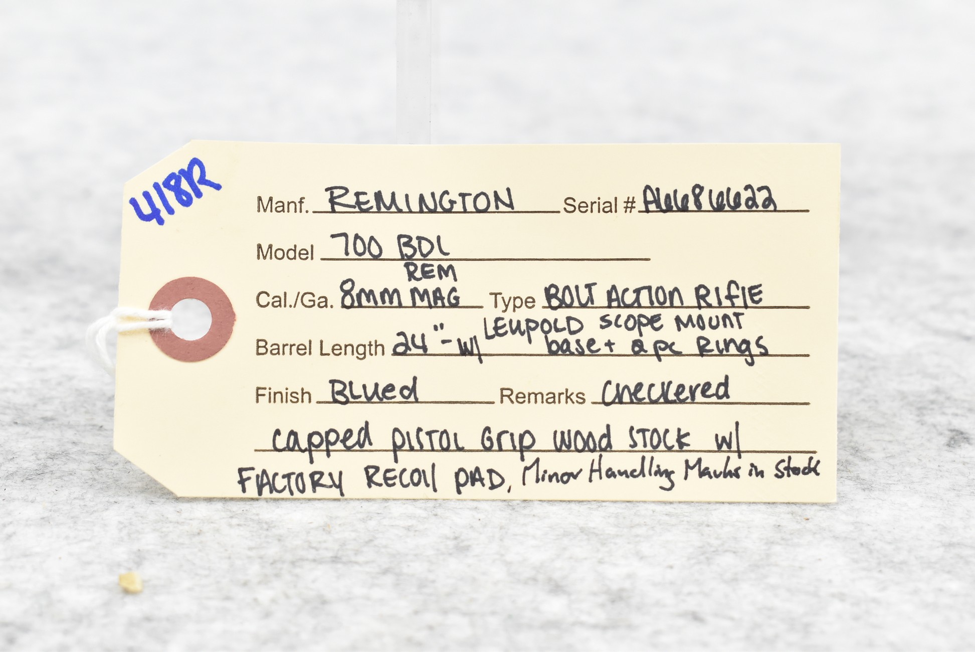 418R. Remington – Mod. 700 BDL – 8mm Rem. Mag. Cal. Bolt Action Rifle – w/24” Barrel – Blued Finish – w/Checkered Capped Pistol Grip Wood Stock w/Factory Recoil Pad – w/Leupold Scope Mount Base & 2pc. Rings – Note: Minor Handling Marks in Stock