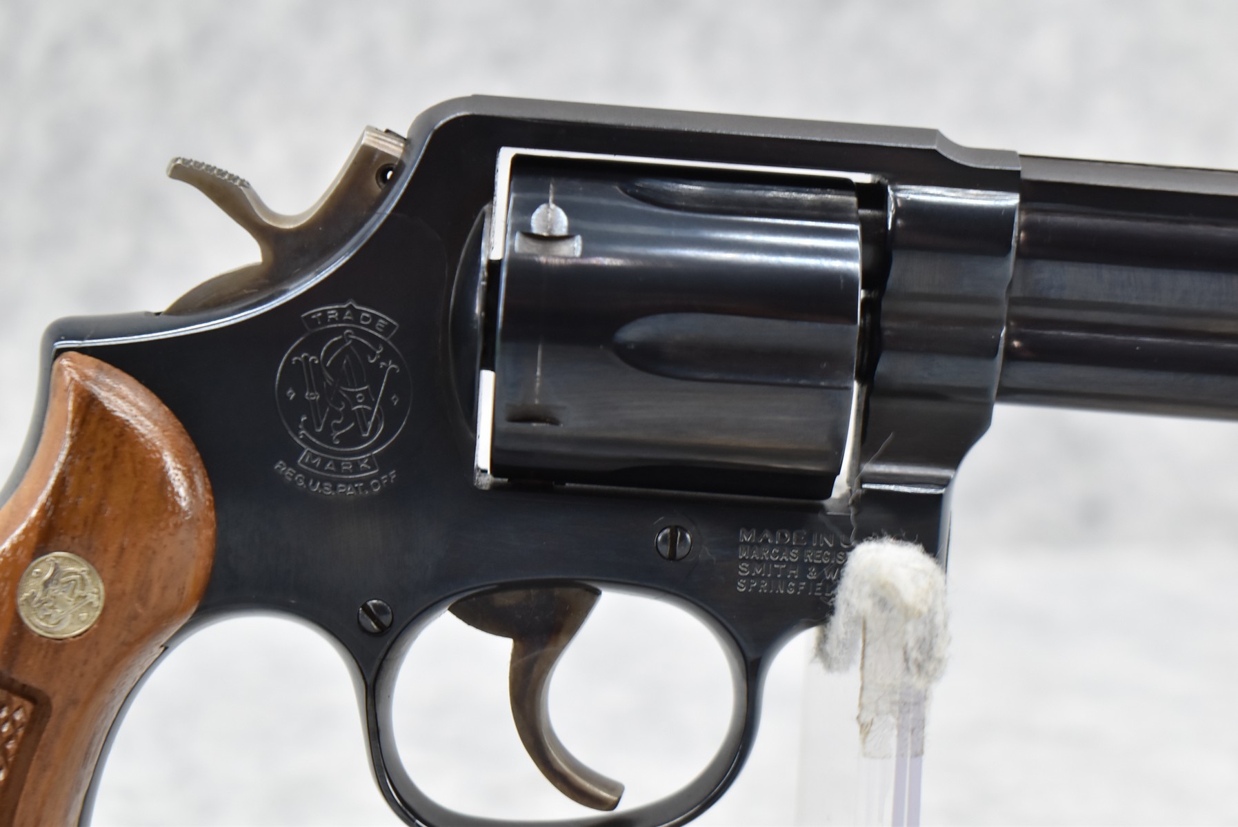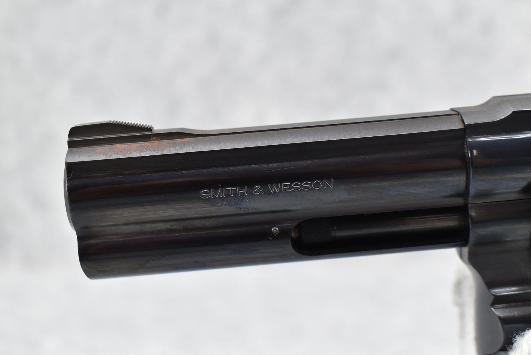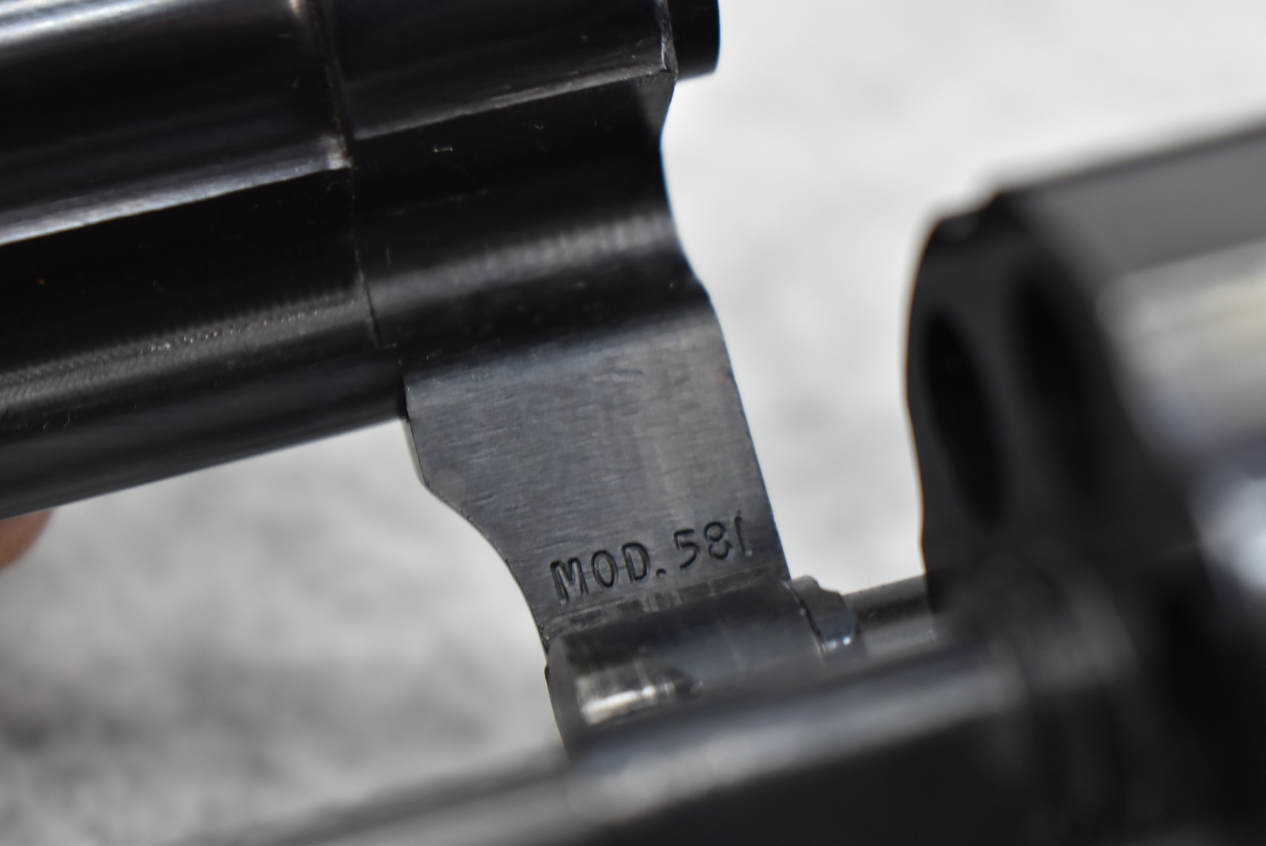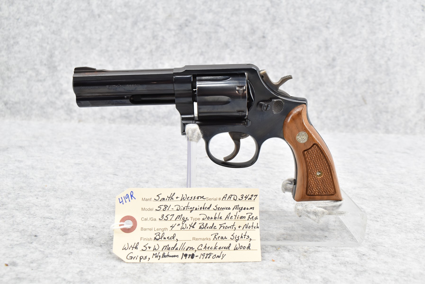 419R. Smith & Wesson – Mod. 581 Distinguished Service Magnum – 357 Mag. Cal. Double Action Revolver – w/4” Barrel w/Blade Front & Notch Rear Sights – Blued Finish – w/S&W Medallion Checkered Wood Grips – Mfg. Between 1980-1988 Only