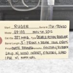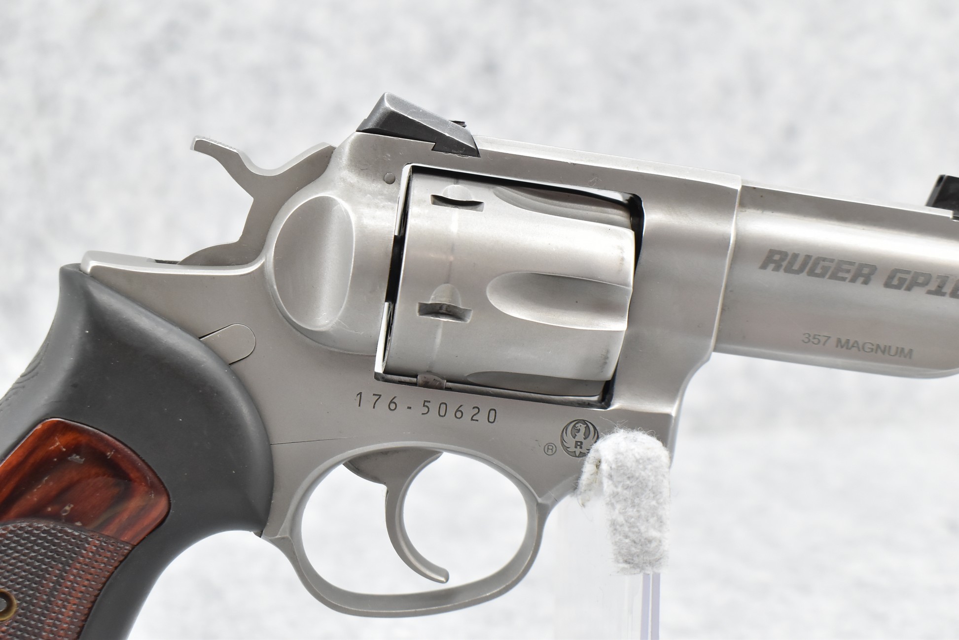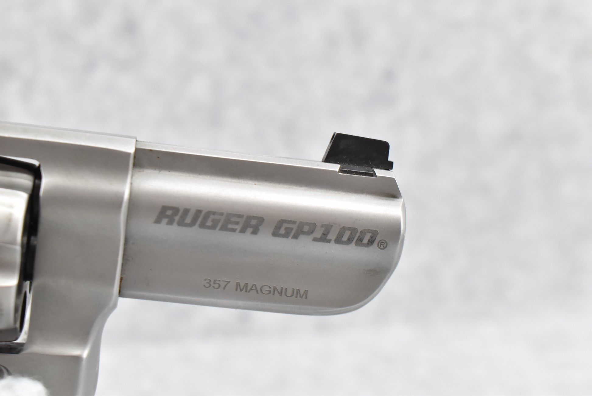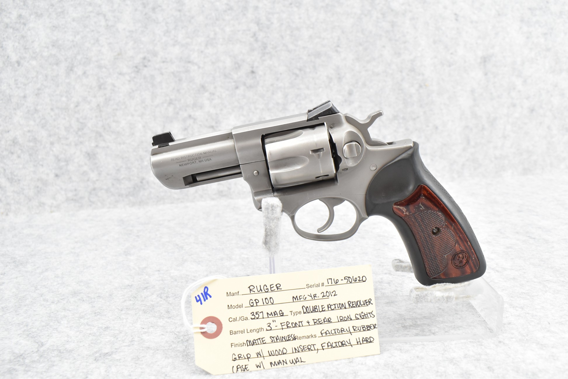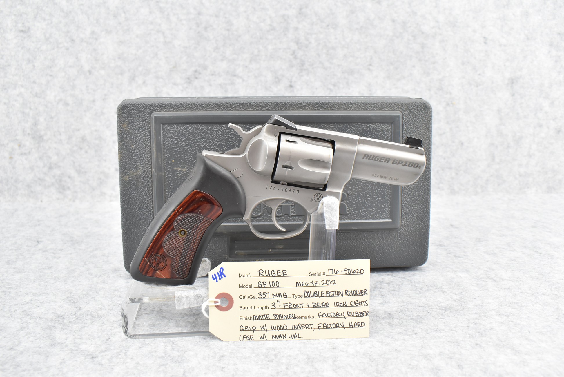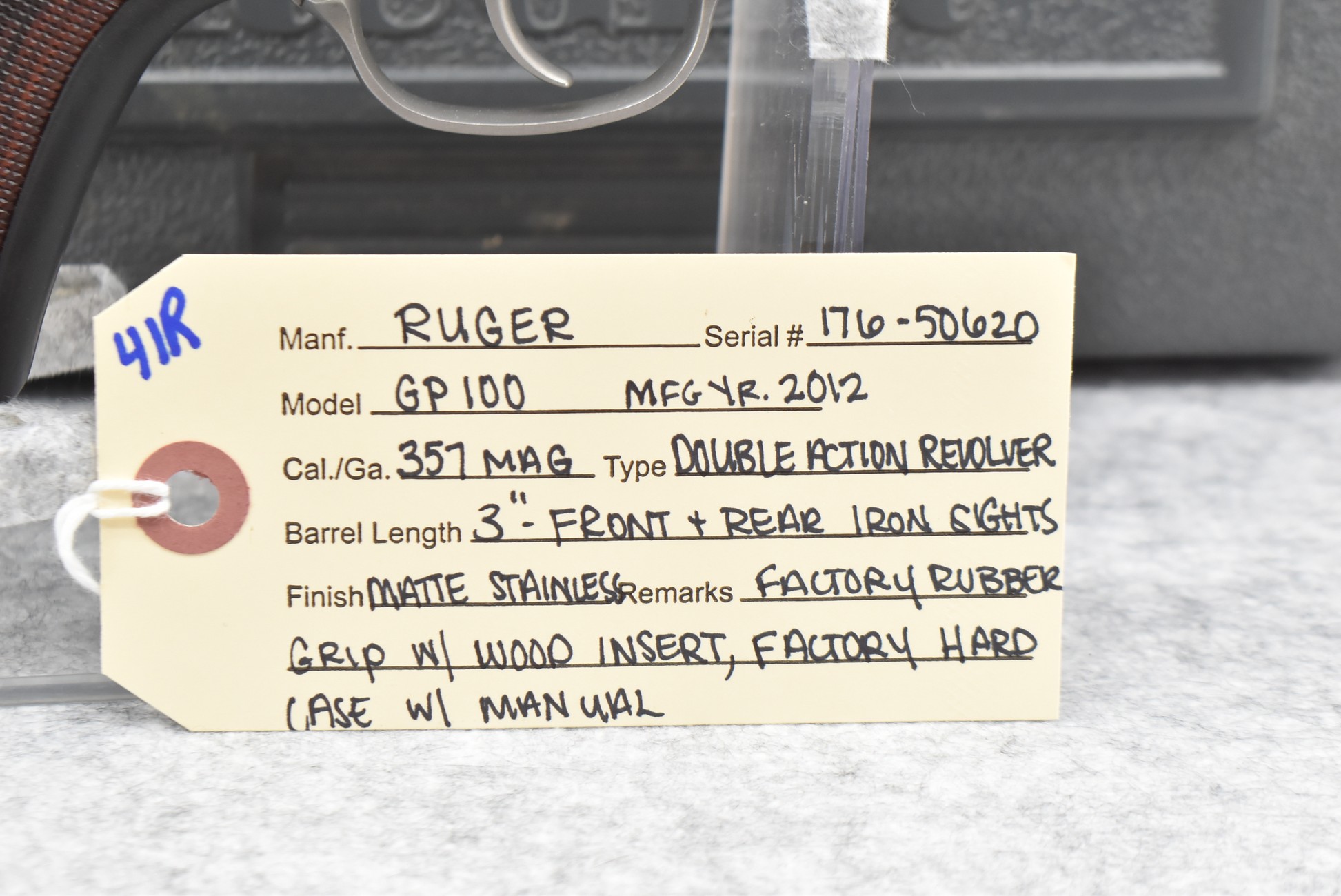 41R. Ruger – Mod. GP100 – 357 Mag. Cal. Double Action Revolver – w/3” Barrel w/Front and Rear Iron Sights – Matte Stainless Finish – w/Factory Rubber Grip w/Wood Insert – Manufactured 2012 – w/Factory Hard Case and Manual