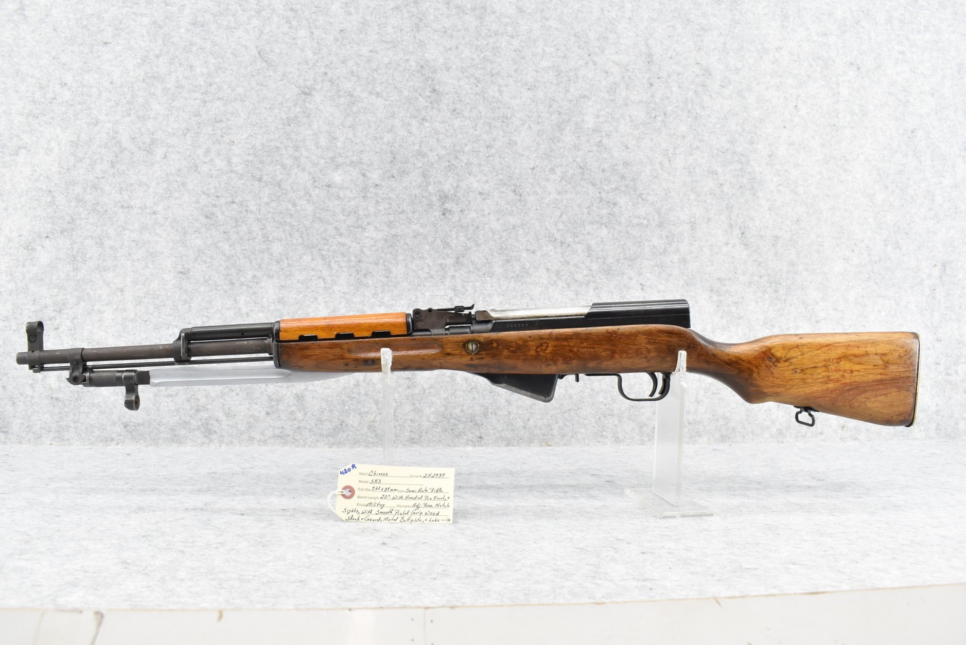 420R. Chinese – Mod. SKS – 7.62x39mm Cal. Semi-Auto Rifle – w/20” Barrel w/Hooded Pin Front & Adj. Rear Notch Sights – Military Finish – w/Smooth Pistol Grip Wood Stocks w/Metal Butt Plate – w/Lube Kit & Cleaning Rod – w/Folding Knife Bayonet