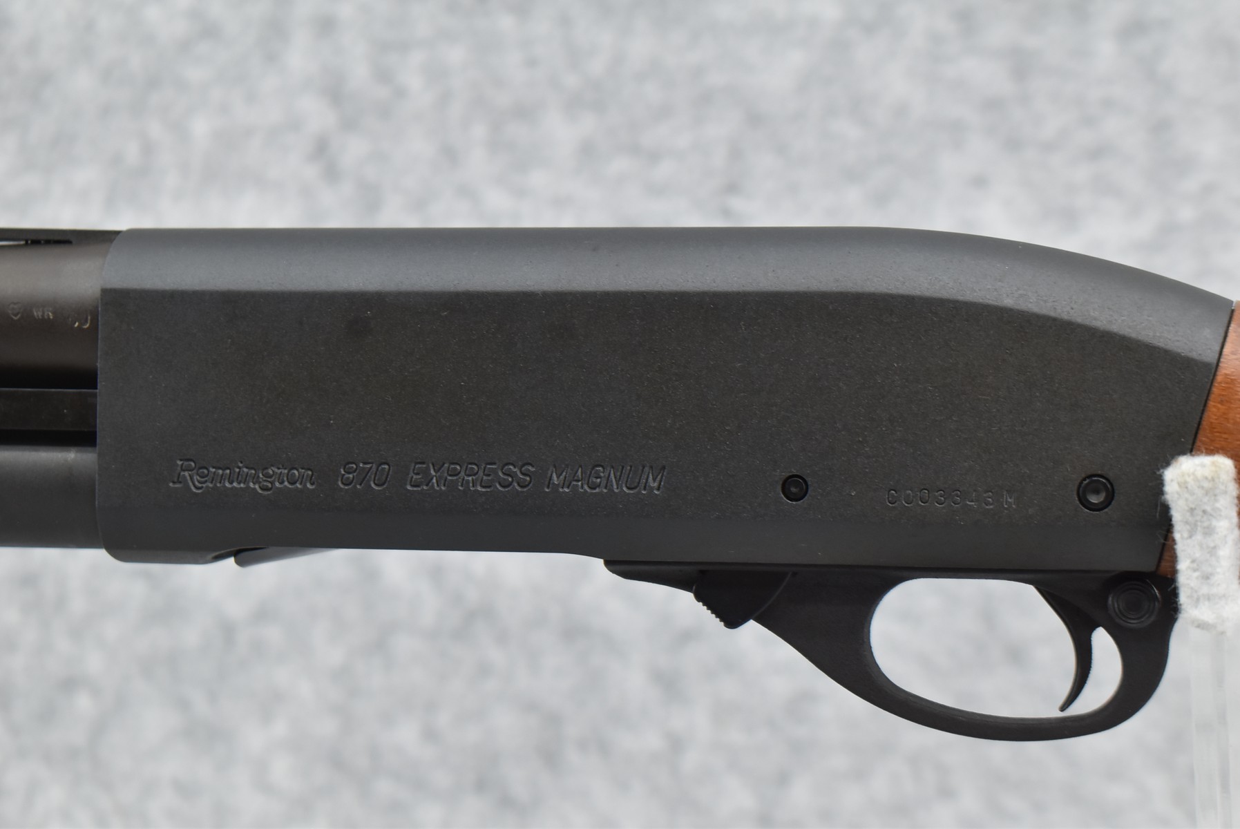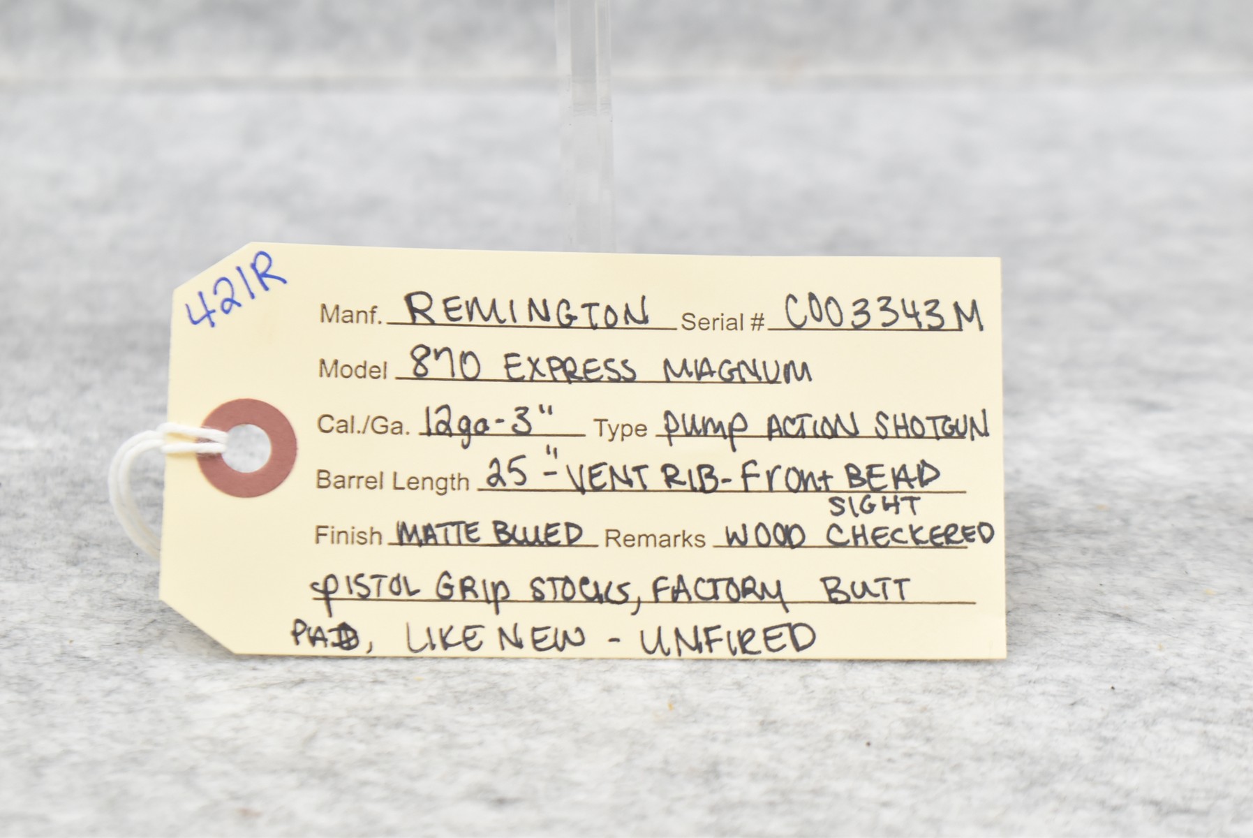 421R. Remington – Mod. 870 Express Magnum – 12ga. 3” Pump Action Shotgun – w/25” Rem. Choke, Vent-Rib Barrel w/Front Bead Sight – Matte Blued Finish – w/Wood Checkered Pistol Grip Stocks w/Factory Butt Pad – As New & Unfired