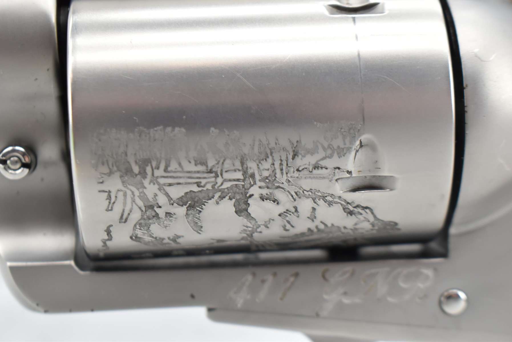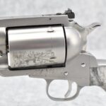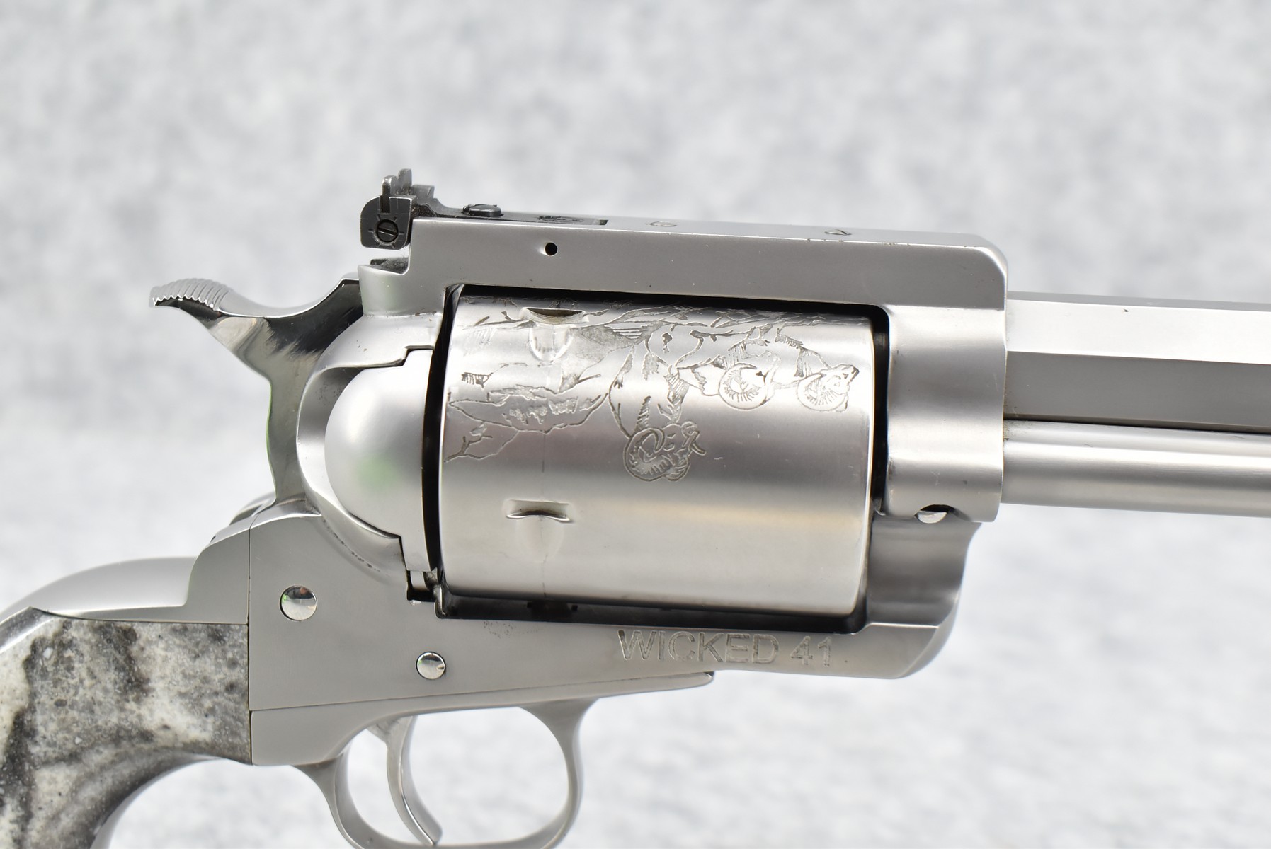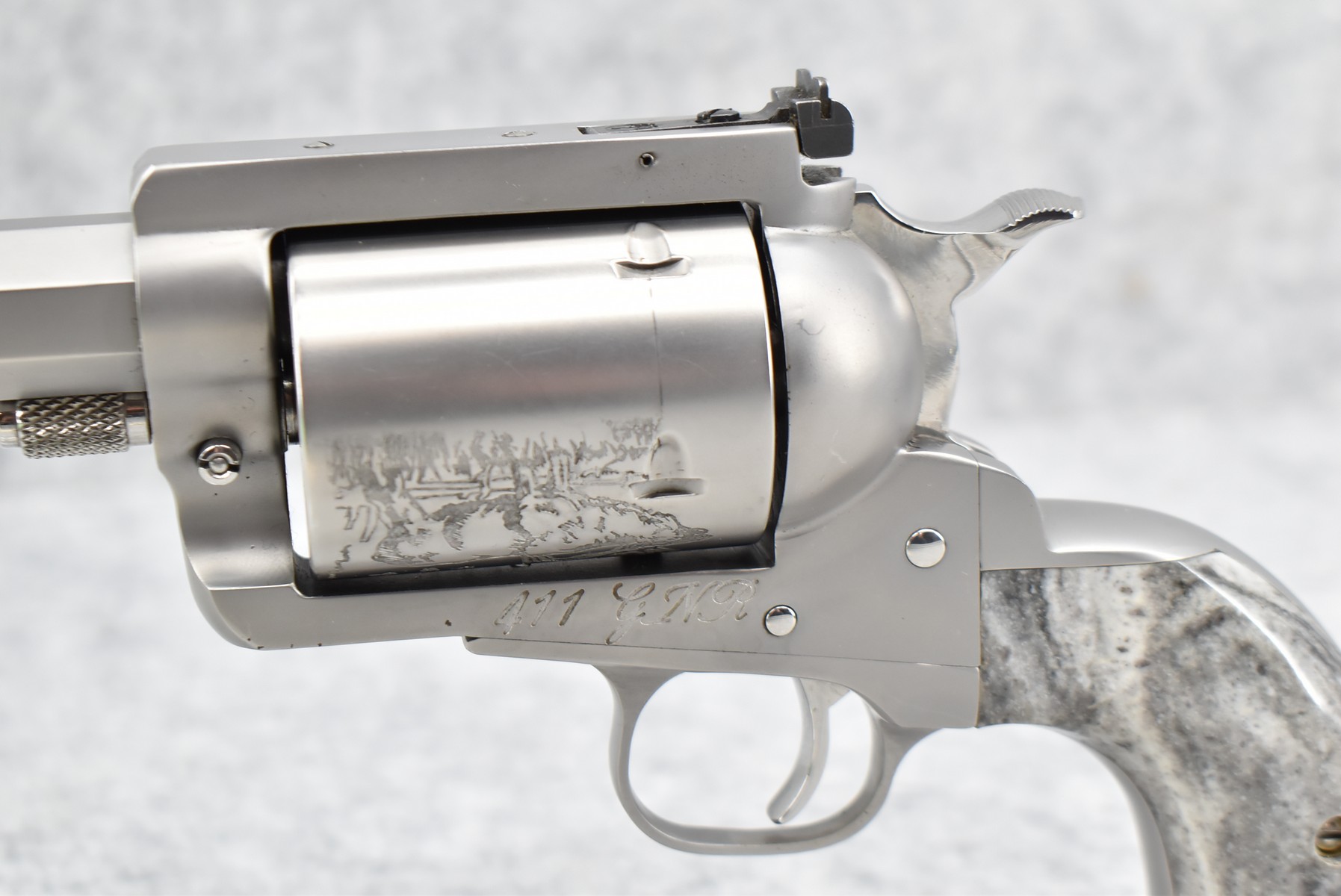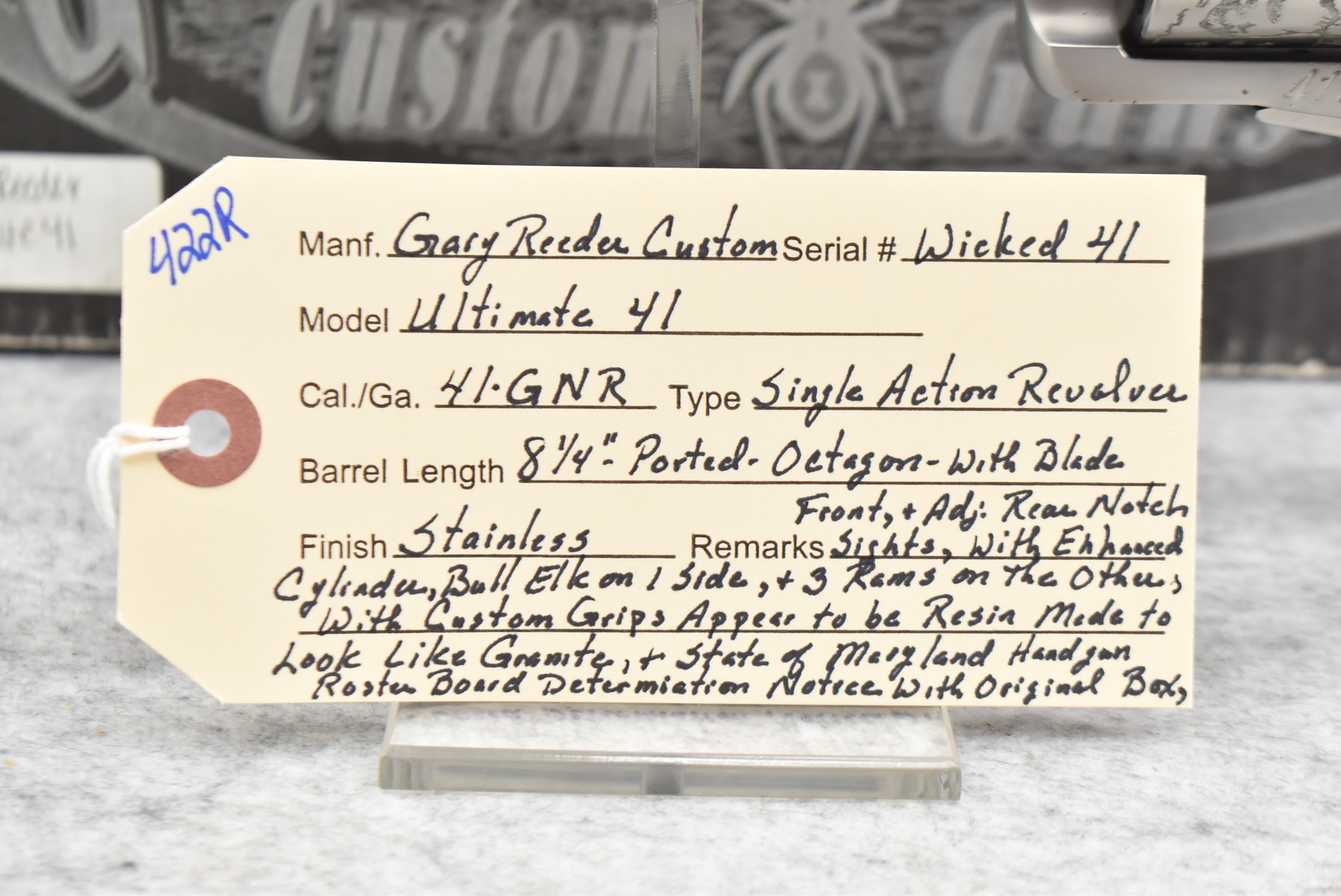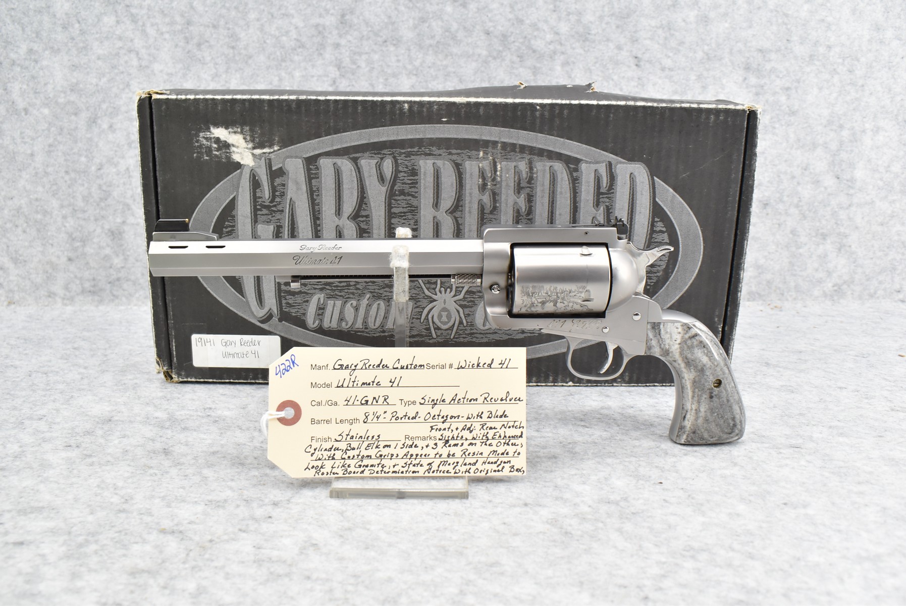 422R. Gary Reeder Custom – Mod. Ultimate 51 – 41 GNR Cal. Single Action Revolver – w/8 ¼” Octagon, Ported Barrel w/Blade Front & Adj. Rear Notch Sights – Stainless Finish – w/Enhanced Cylinder w/Bull Elk on 1 Side & 3 Rams on the Other – w/Custom Grips Appear to be Resin Made to Look Like Granite – w/State of Maryland Handgun Roster Board Determination Notice & Original Box (CANNOT GO TO MARYLAND!)