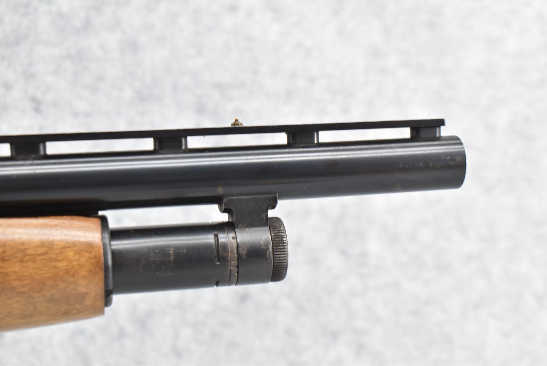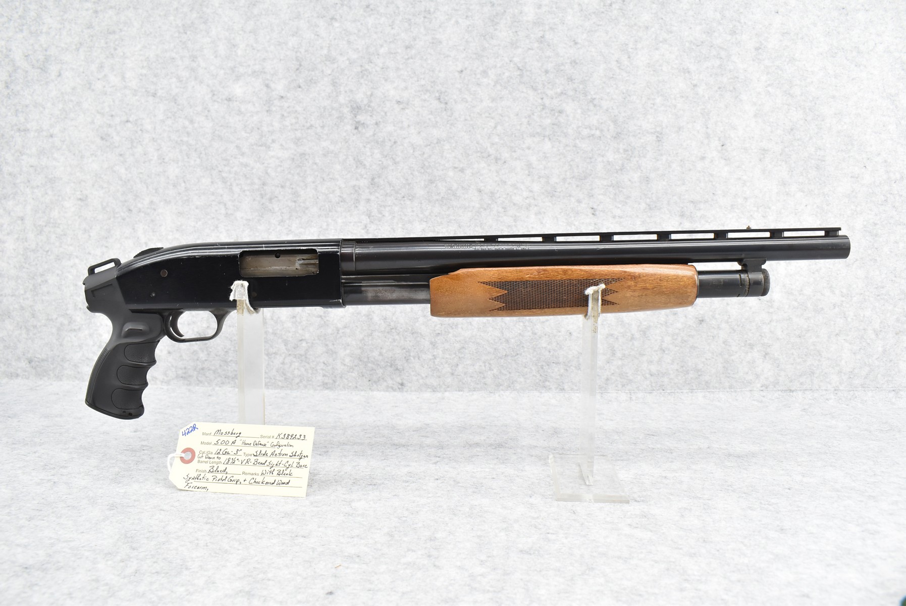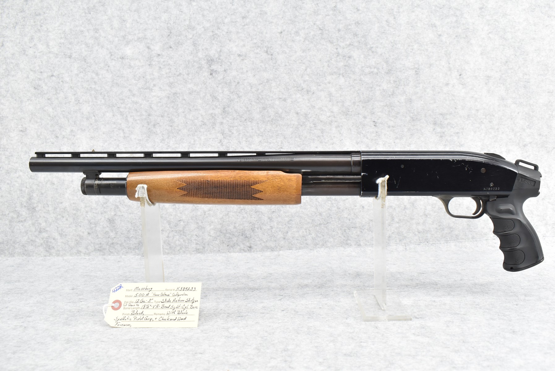 422R. Mossberg – Mod. 500A “Home Defense” – 12ga. 3” Pump Action Shotgun – Cut Down to 18½” Vent Rib Cyl. Bore Barrel w/Bead Sight – Blued Finish – w/Black Synthetic Pistol Grip Stock w/Checkered Wood Forearm