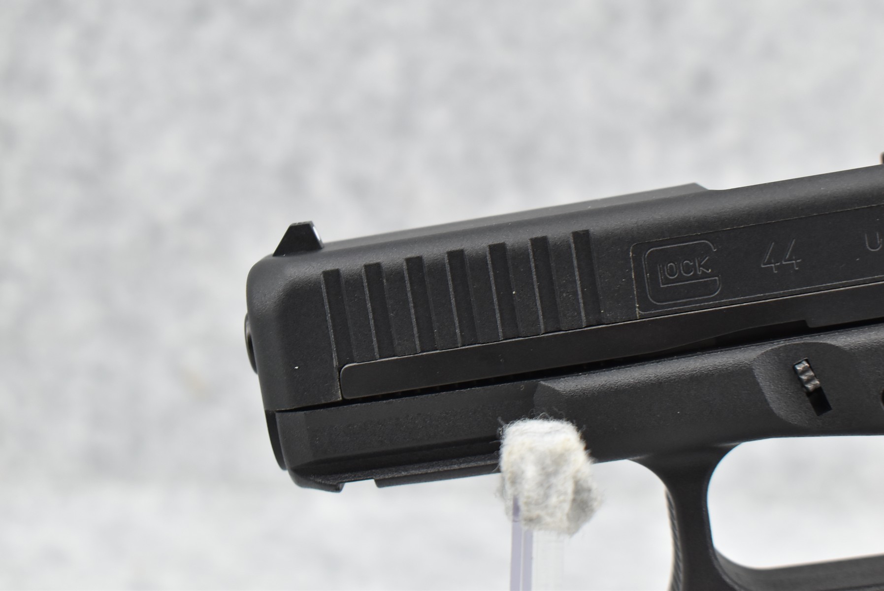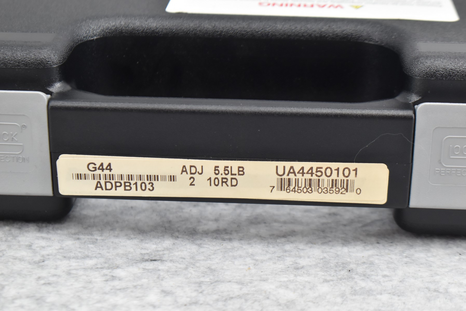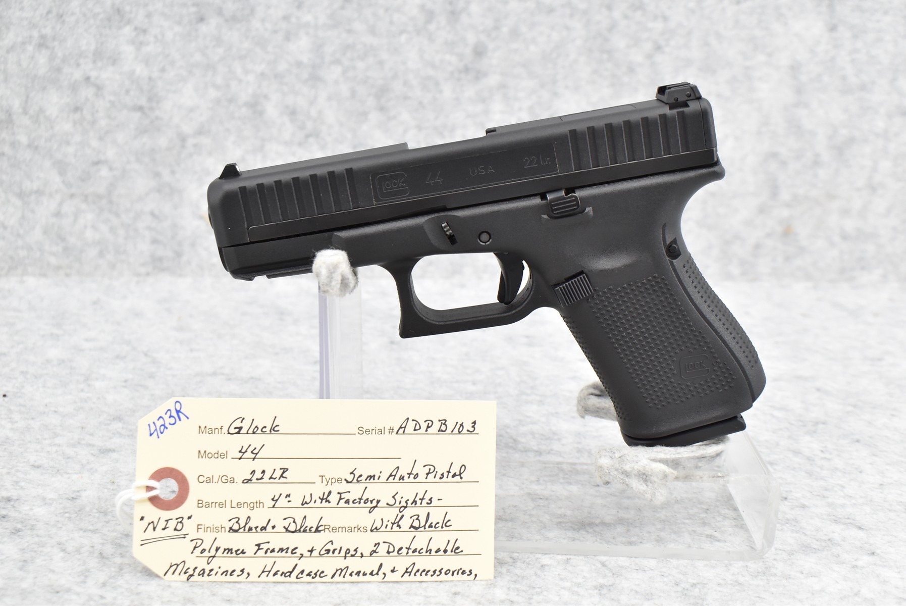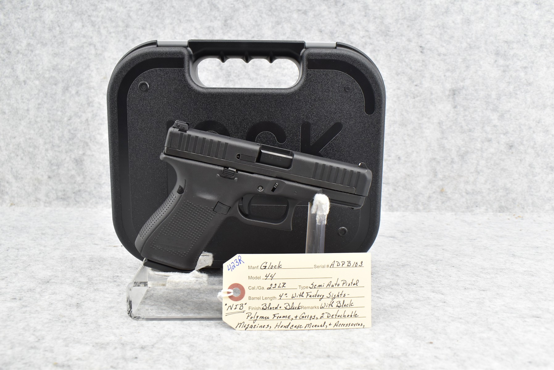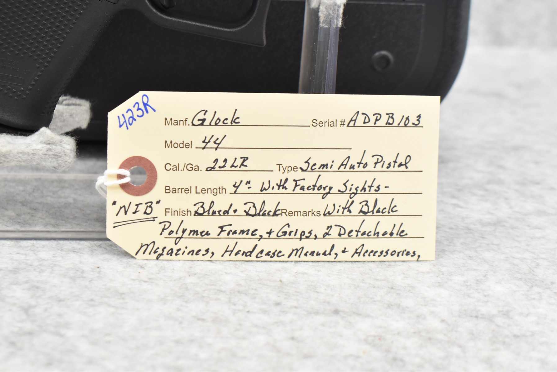 423R. Glock – Mod. 44 – 22LR Cal. Semi-Auto Pistol – w/4” Barrel w/Factory Sights – Blued Finish – w/Black Polymer Frame & Grips – w/2 Detachable Magazines – New w/Hard Case, Manual & Accessories