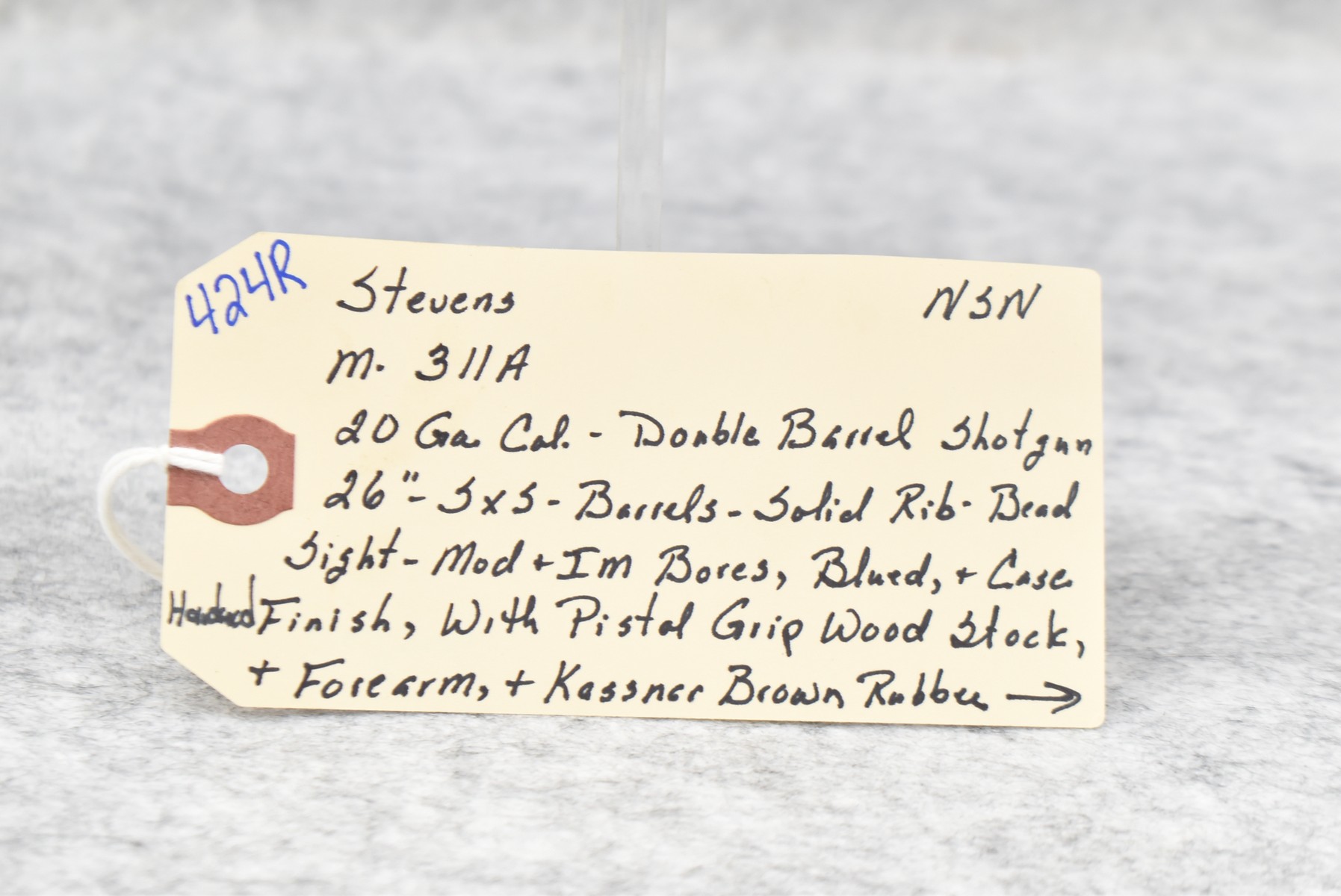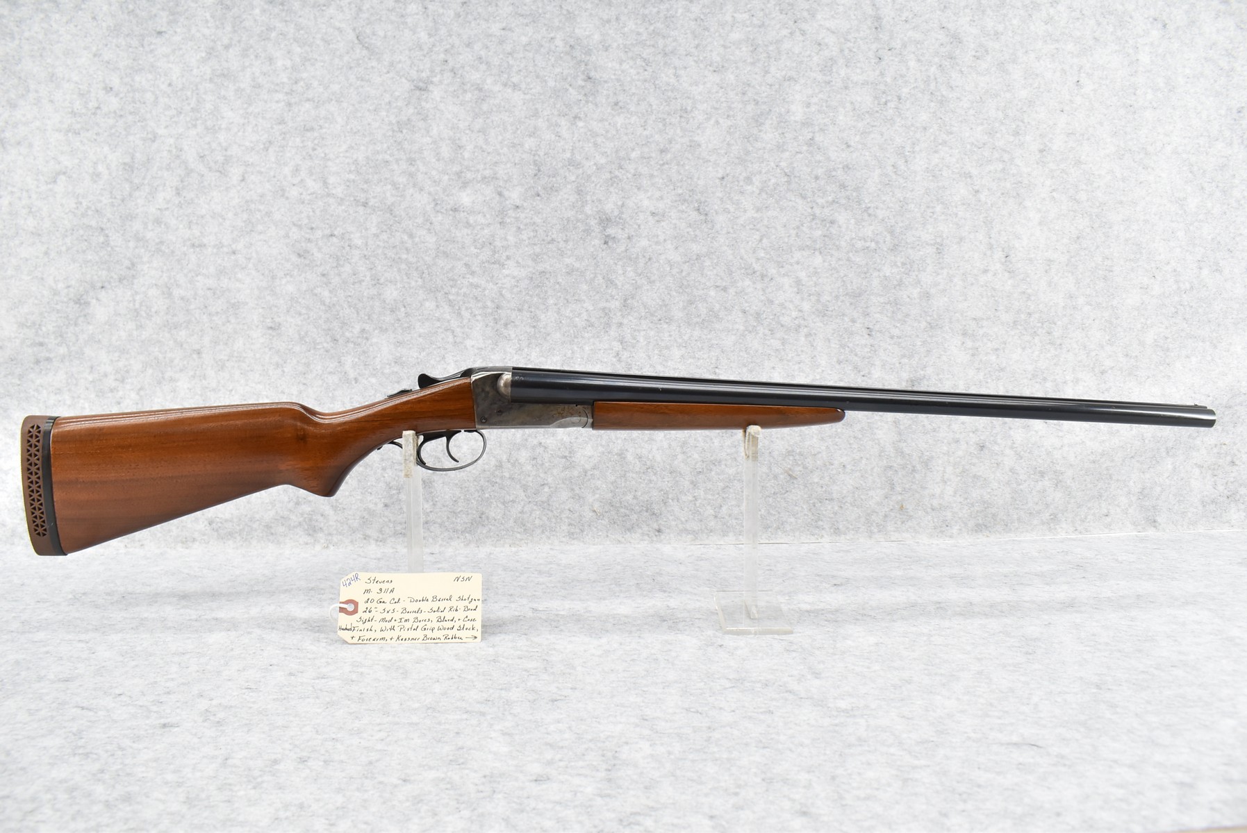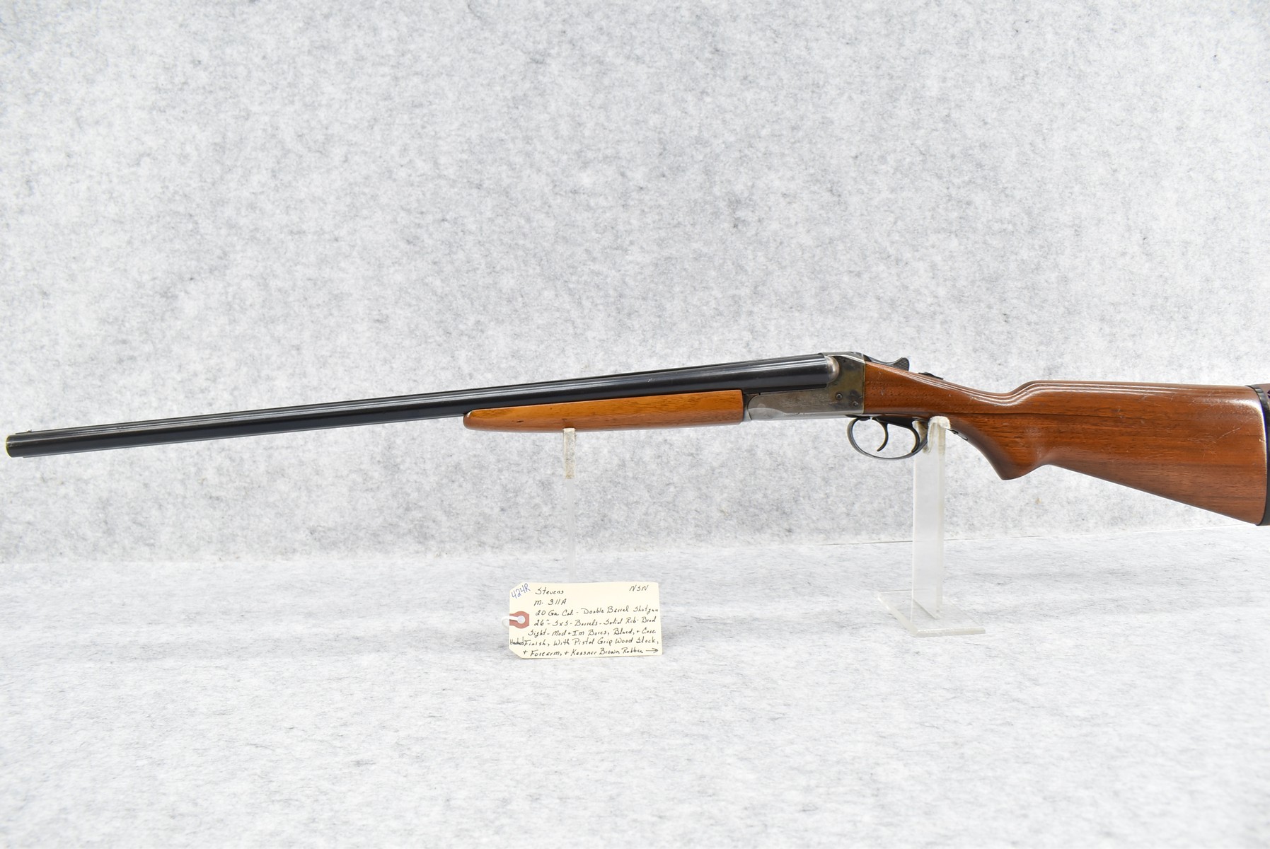 424R. Stevens – Mod. 311A – 20ga. Double Barrel Shotgun – w/26” Barrels w/Solid Rib Bead Sight and Modified and IM Chokes – Blued/Case Hardened Finish – w/Pistol Grip Wood Stocks w/Kassner Brown Rubber Butt Pad