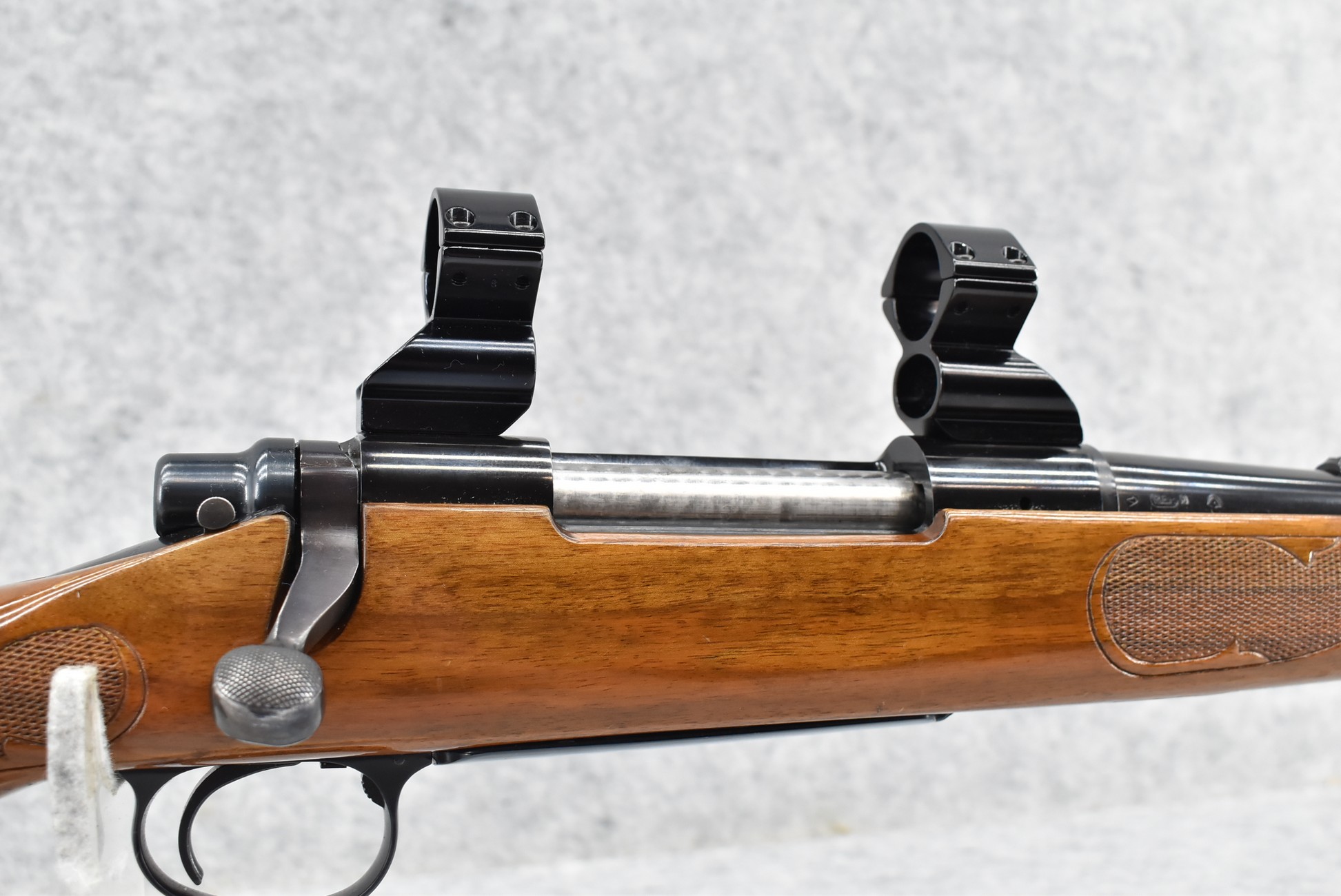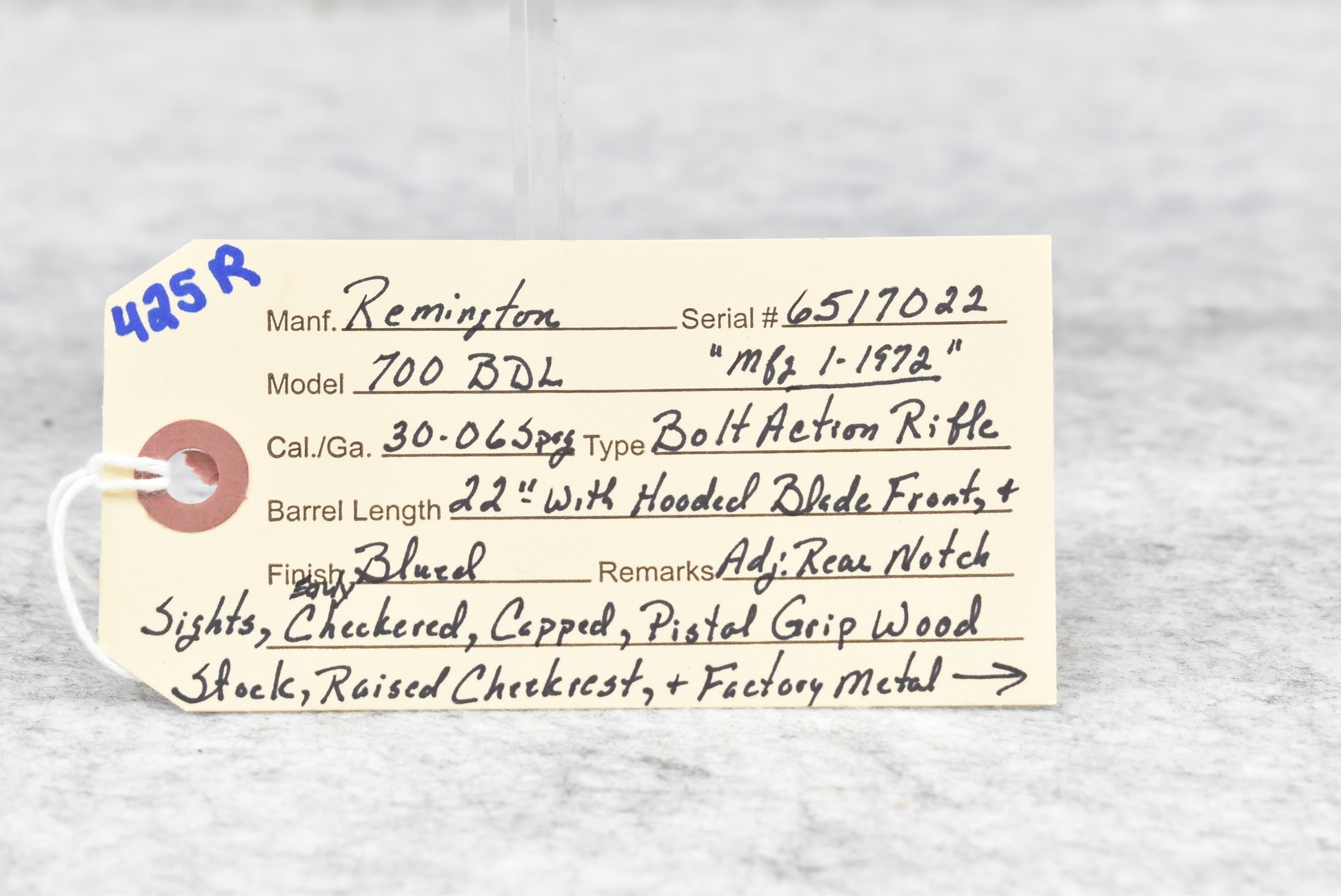 425R. Remington – Mod. 700 BDL – 30-06 Sprg. Cal. Bolt Action Rifle – w/22” Barrel w/Hooded Blade Front & Adj. Rear Notch Sights – Blued Finish – w/Early Checkered Capped Pistol Grip Wood Stock w/Raised Cheek Piece w/Factory Butt Plate – w/See Through Scope Rings – Mfg. Jan. 1972