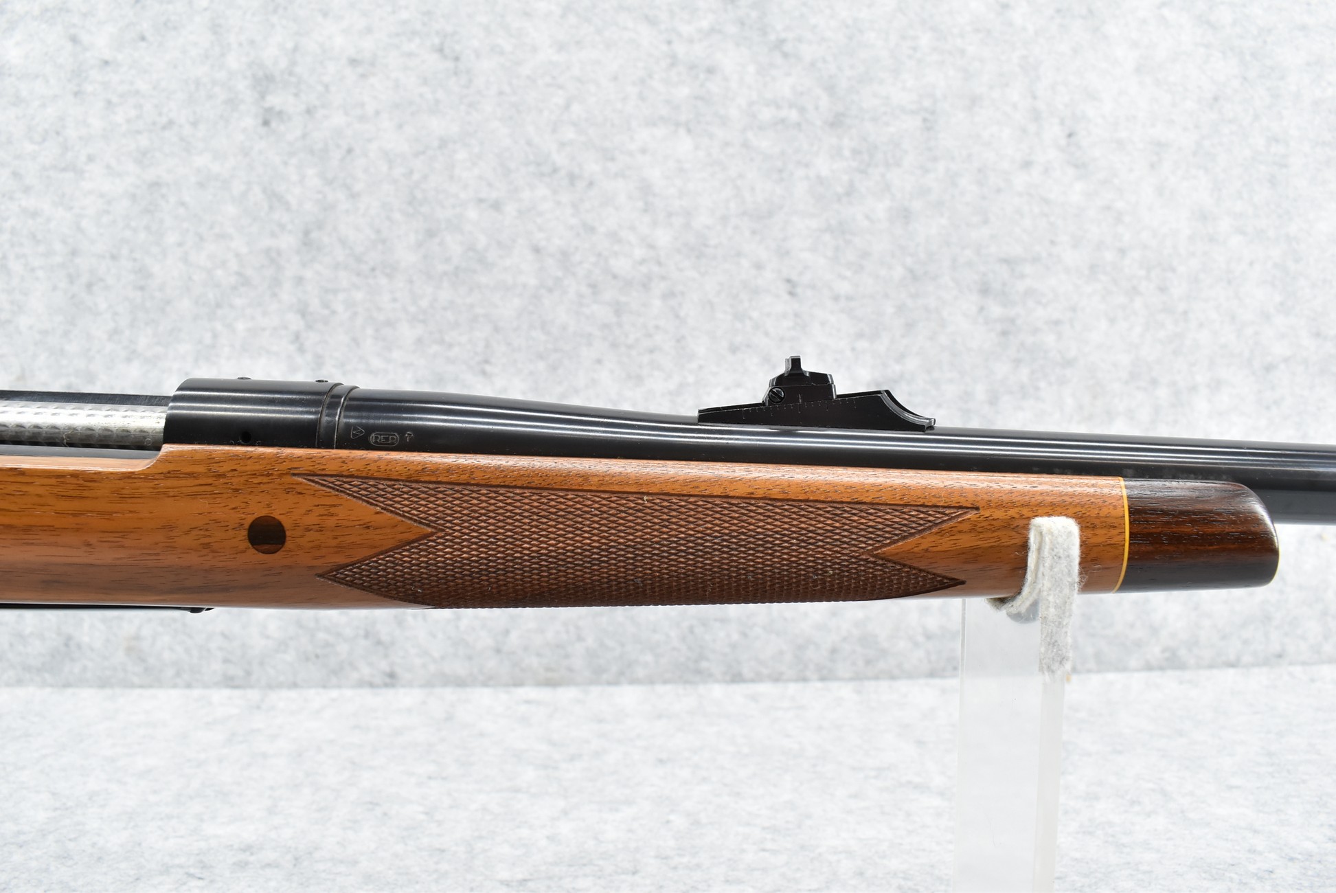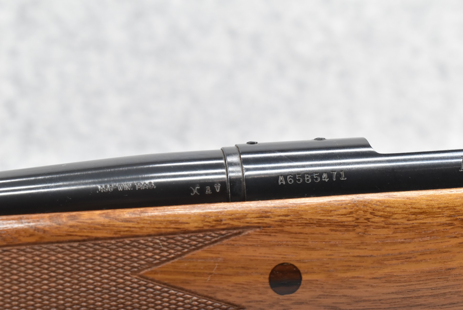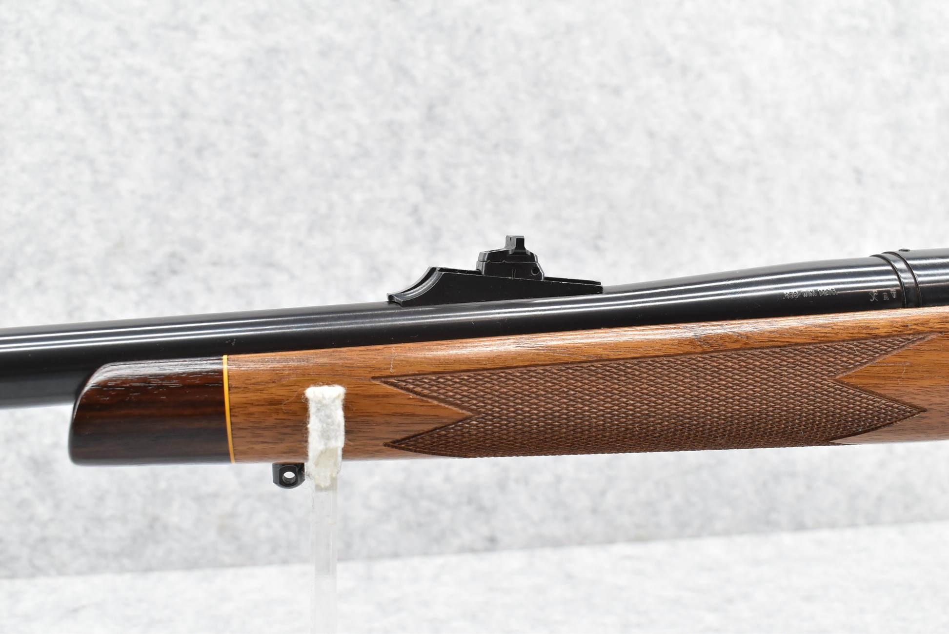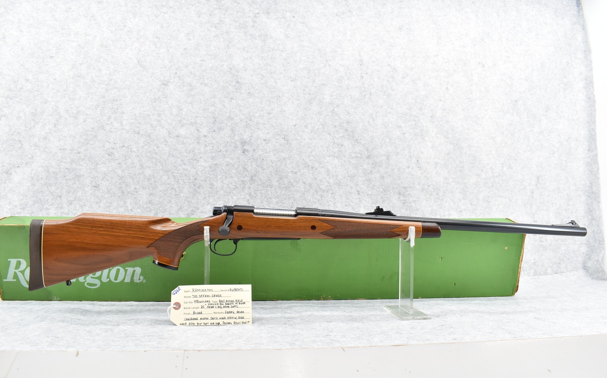 426R. Remington – Mod. 700 Safari Grade – 458 Win. Mag. Cal. Bolt Action Rifle – w/24” Heavier BDL Barrel w/Blade Front and Adjustable Rear Sights – Blued Finish – w/Factory Deluxe Checkered Monte Carlo Wood Stock w/Rosewood Pistol Grip Cap and Forearm End Cap and Factory Recoil Pad – w/Factory Box – Safari Grades were Custom Shop Special Orders Only! – Manufactured 1979