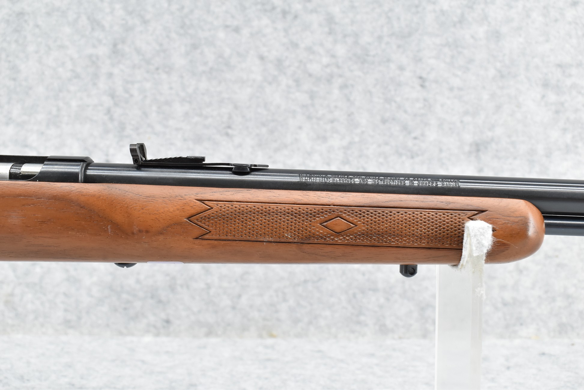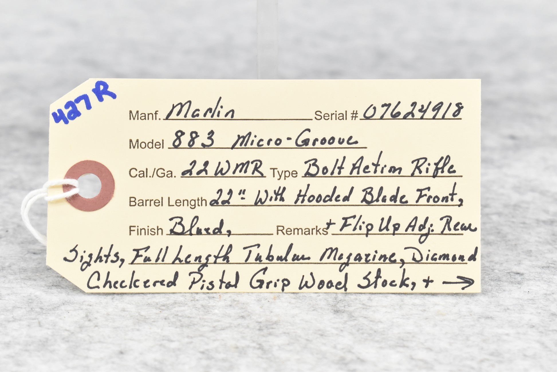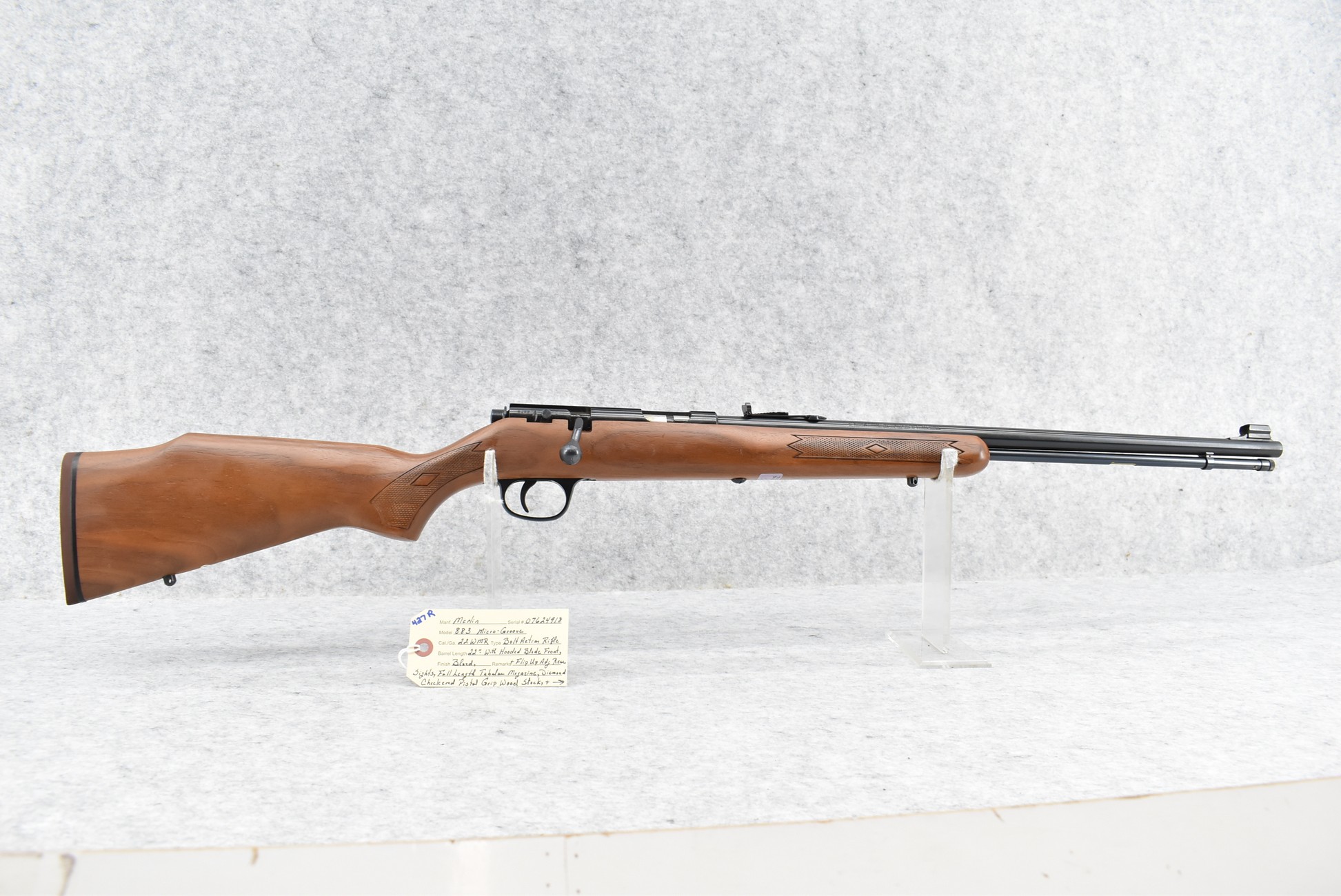 427R. Marlin – Mod. 883 Micro-Groove – 22 WMR Cal. Bolt Action Rifle – w/22” Barrel w/Hooded Blade Front & Flip Up Adj. Rear Sights w/Full Length Tubular Magazine – Blued Finish – w/Diamond Checkered Pistol Grip Wood Stock w/Factory Butt Pad