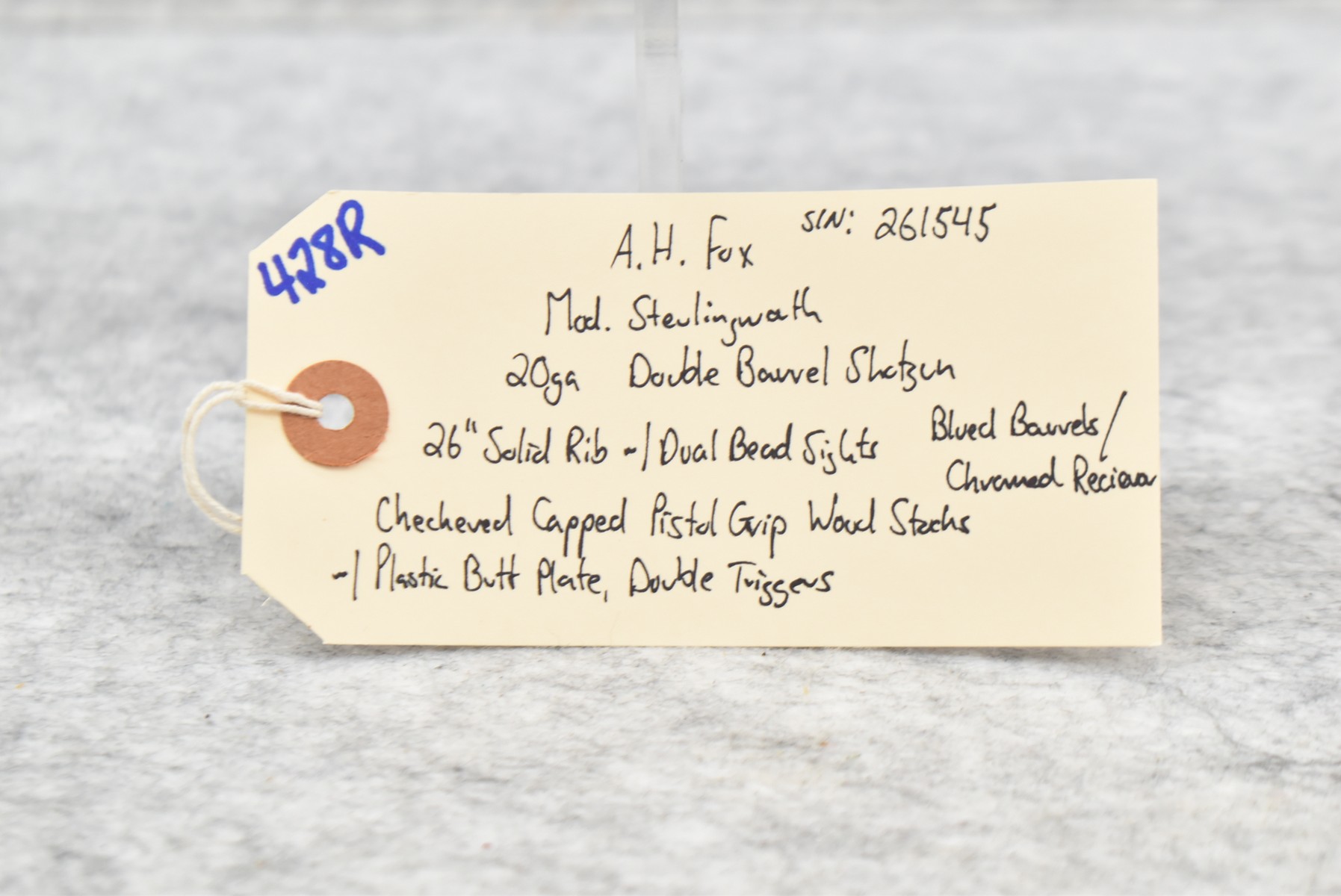 428R. A.H. Fox – Mod. Sterlingworth – 20ga. Double Barrel Shotgun – w/26” Solid Rib Blued Finish Barrels w/Dual Bead Sights – w/Chromed Receiver – w/Checkered Capped Pistol Grip Wood Stocks w/Plastic Butt Plate – w/Double Triggers