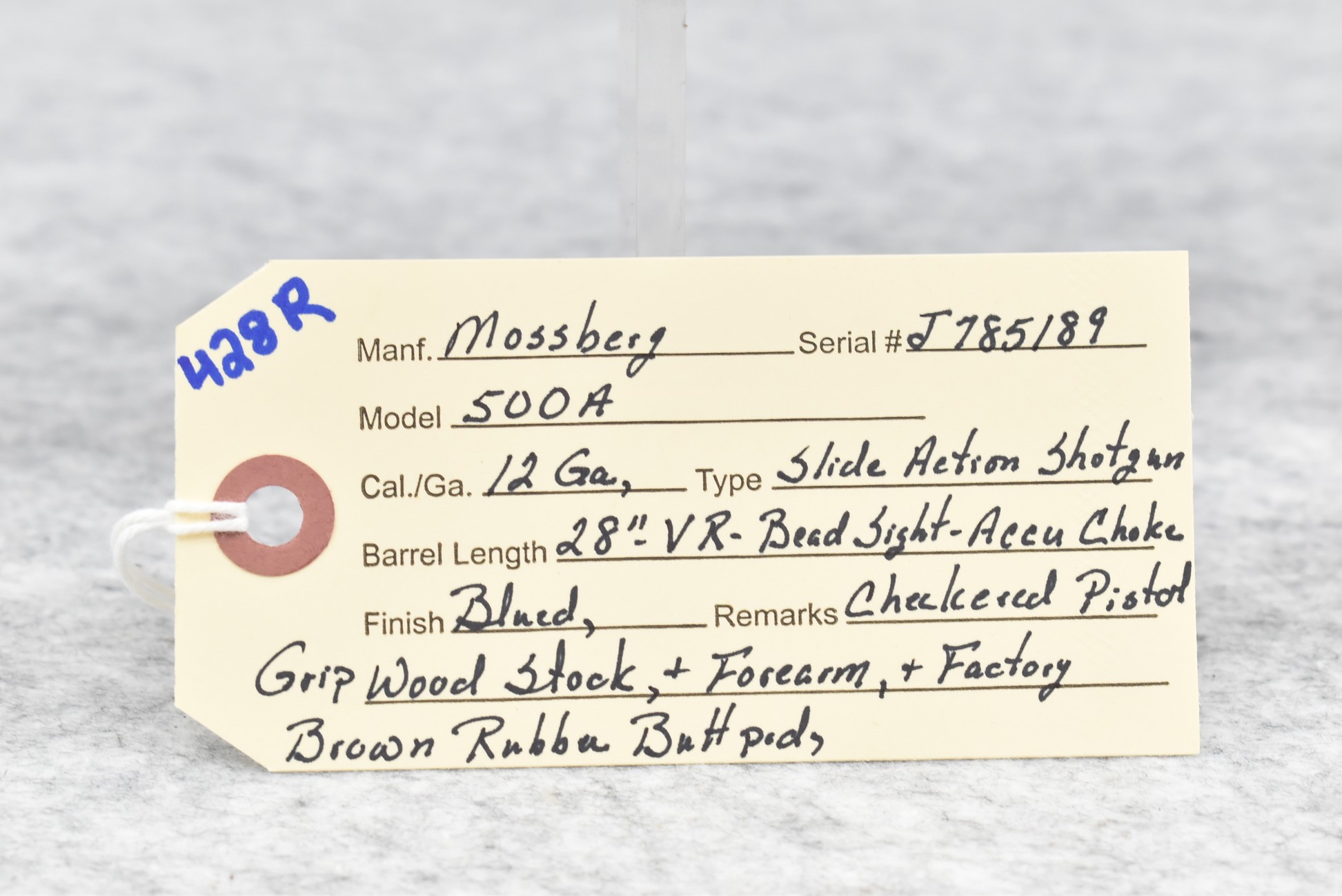 428R. Mossberg – Mod. 500A – 12ga. Pump Action Shotgun – w/28” Accu-Choke, Vent-Rib Barrel w/Bead Sight – Blued Finish – w/Checkered Pistol Grip Wood Stocks w/Factory Butt Pad