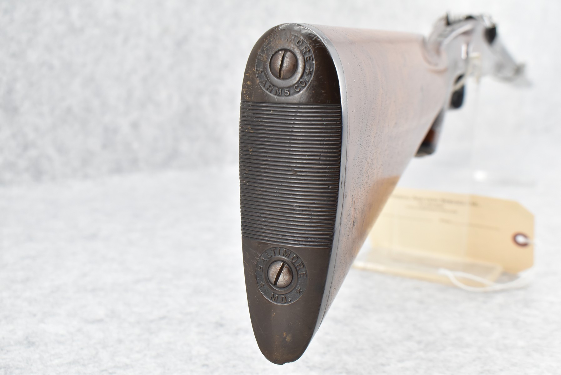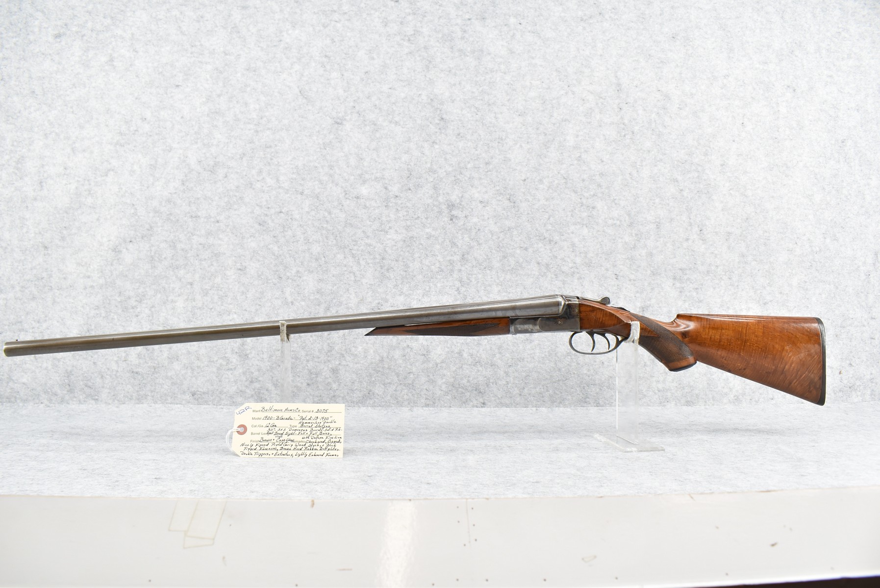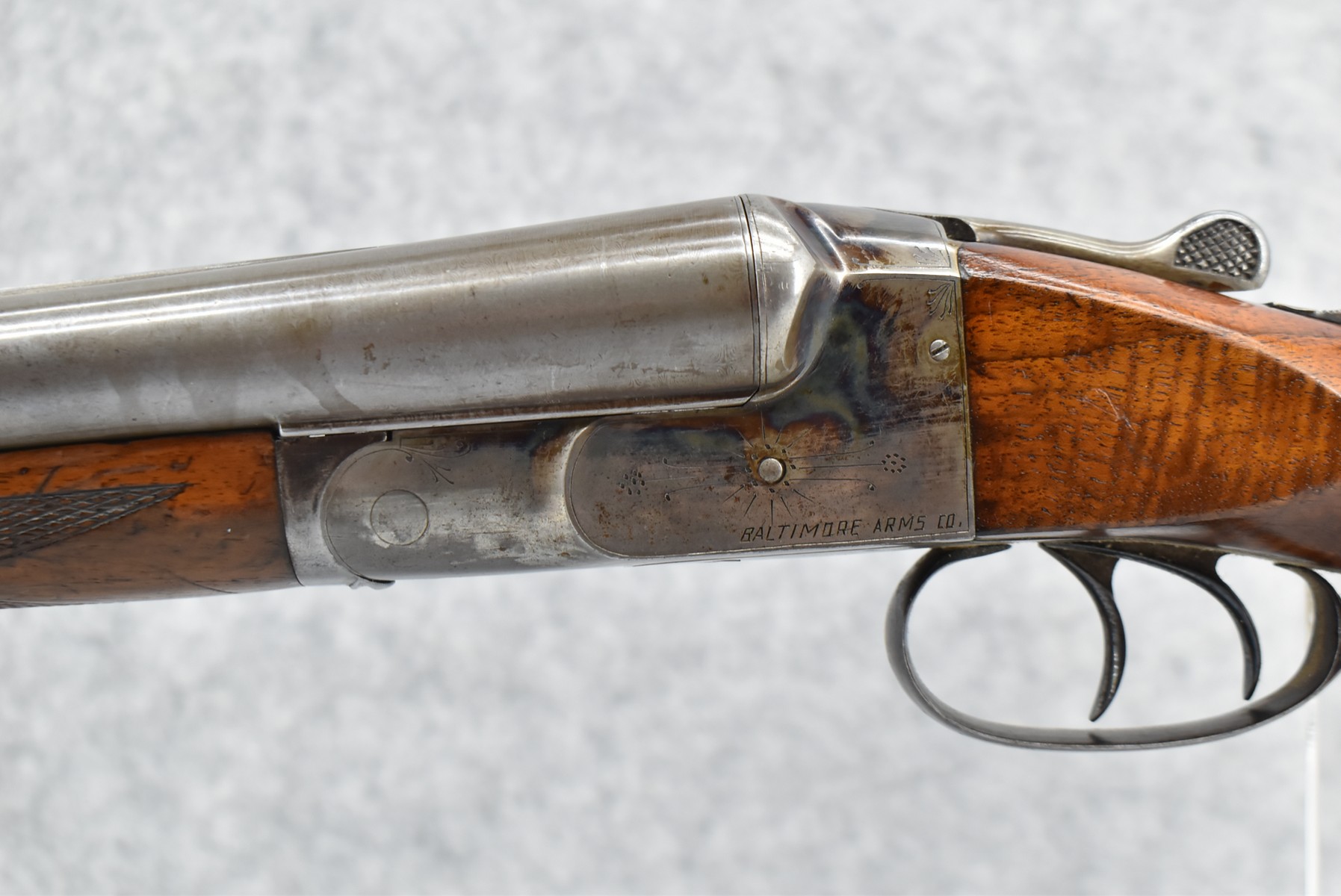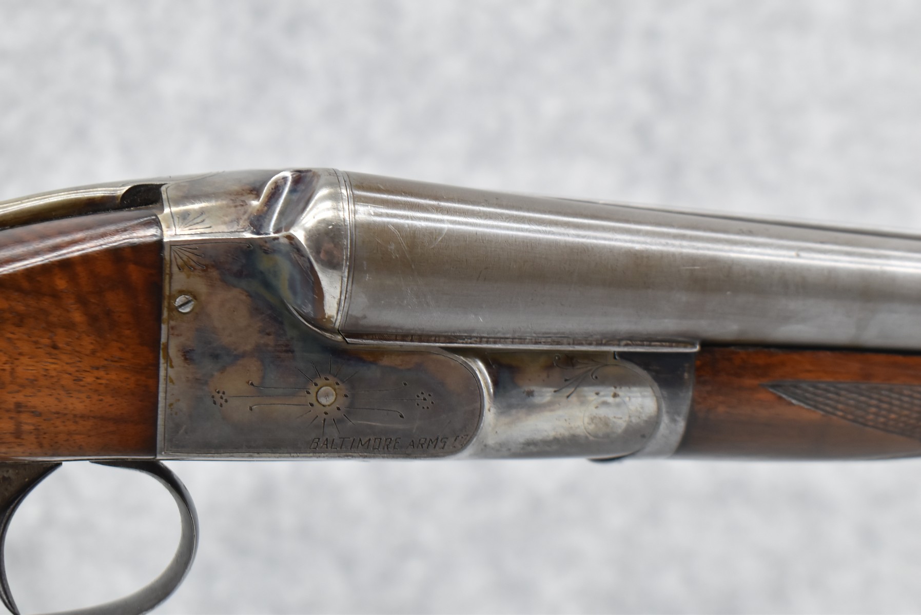 42R. Baltimore Arms Co. – Mod. B Grade – 12ga. Hammerless Double Barrel Shotgun – w/30” Full & Full Choke, Solid Rib, Damascus Barrels w/Front Bead Sight – Brown & Vivid Case Colors Finish – w/Lightly B Grade Engraved Frame – w/Deluxe Fine Line Checked Capped Nicely Figured Pistol Grip Wood Stock & Black Tipped Forearm w/Factory Hard Rubber Butt plate – w/Double Triggers & Extractors