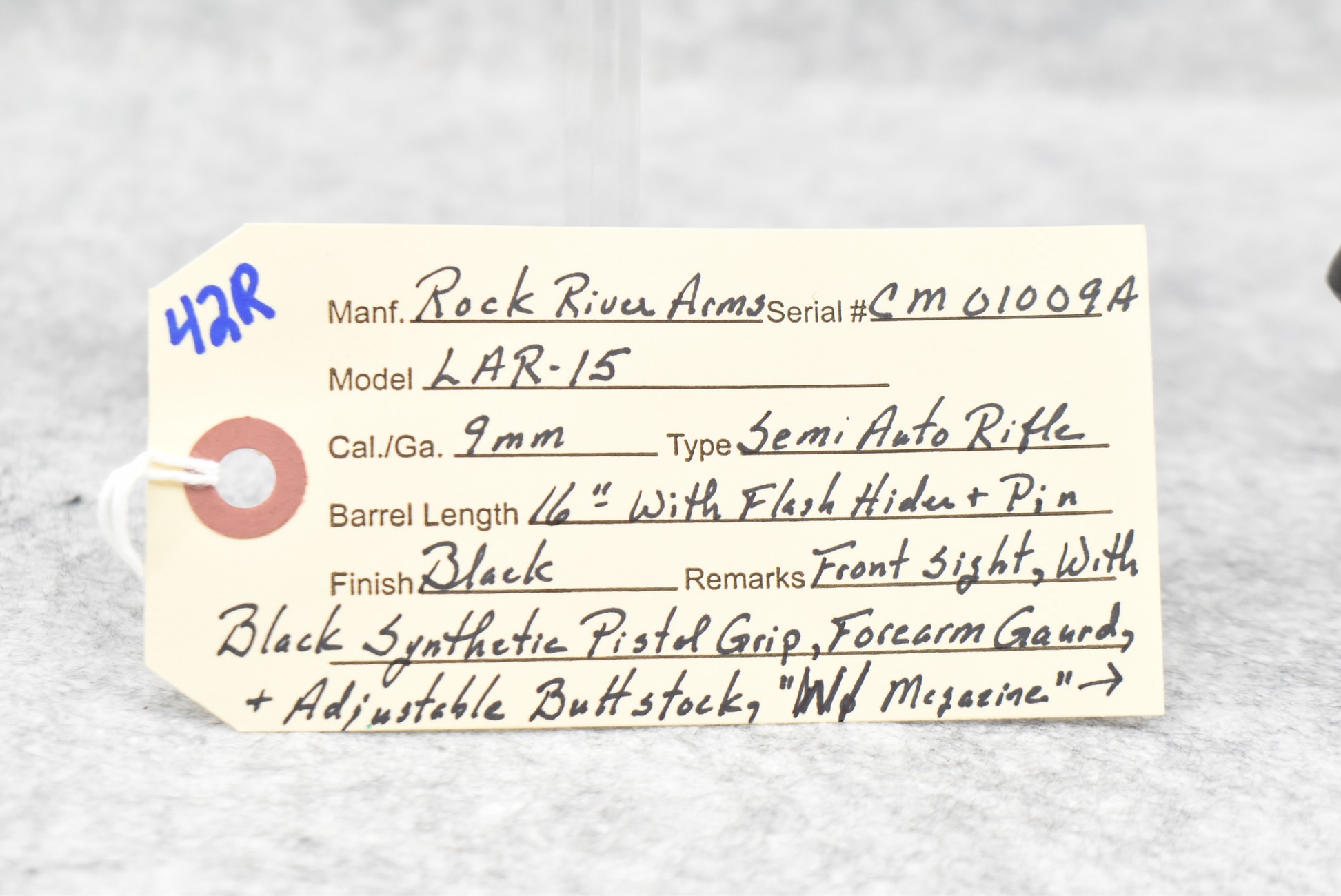 42R.       Rock River Arms – Mod. LAR-15 – 9mm Cal. Semi-Auto Rifle – w/16” Barrel w/Flash Hider and Pin Front Sight – Matte Black Finish – w/Black Synthetic Pistol Grip Forearm Guard and Adjustable Butt Stock – w/Magazine – w/Flat Top Picatinny Rail (CANNOT GO TO MARYLAND!)