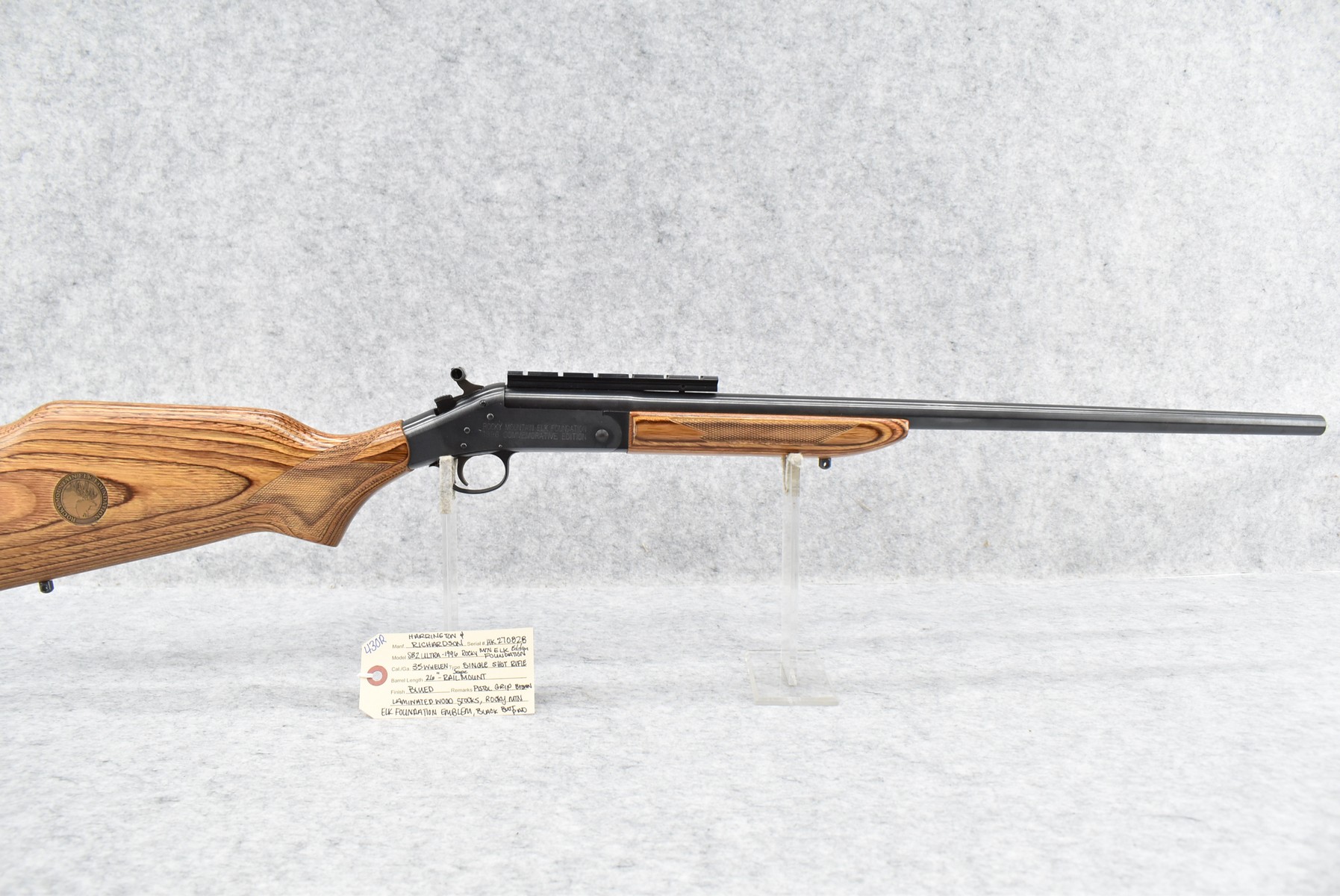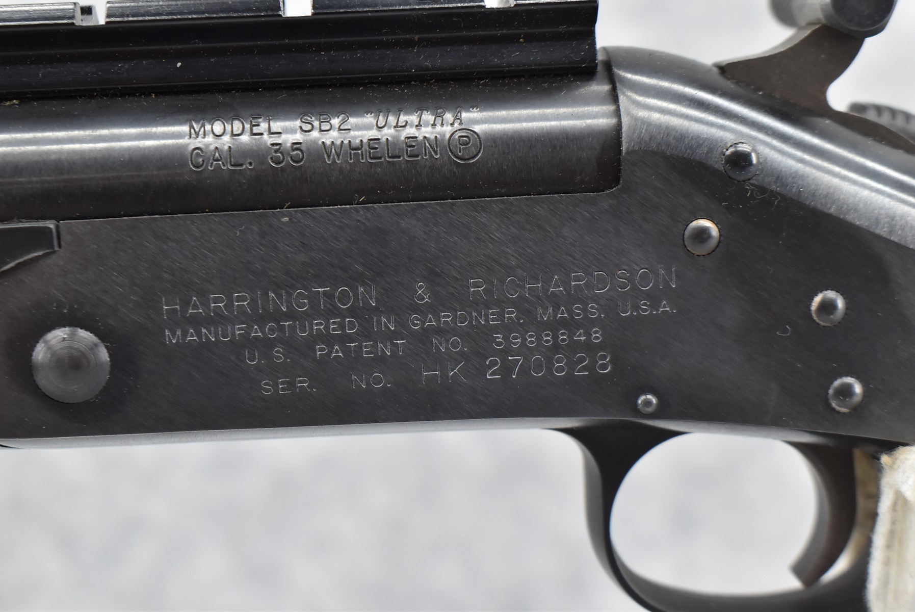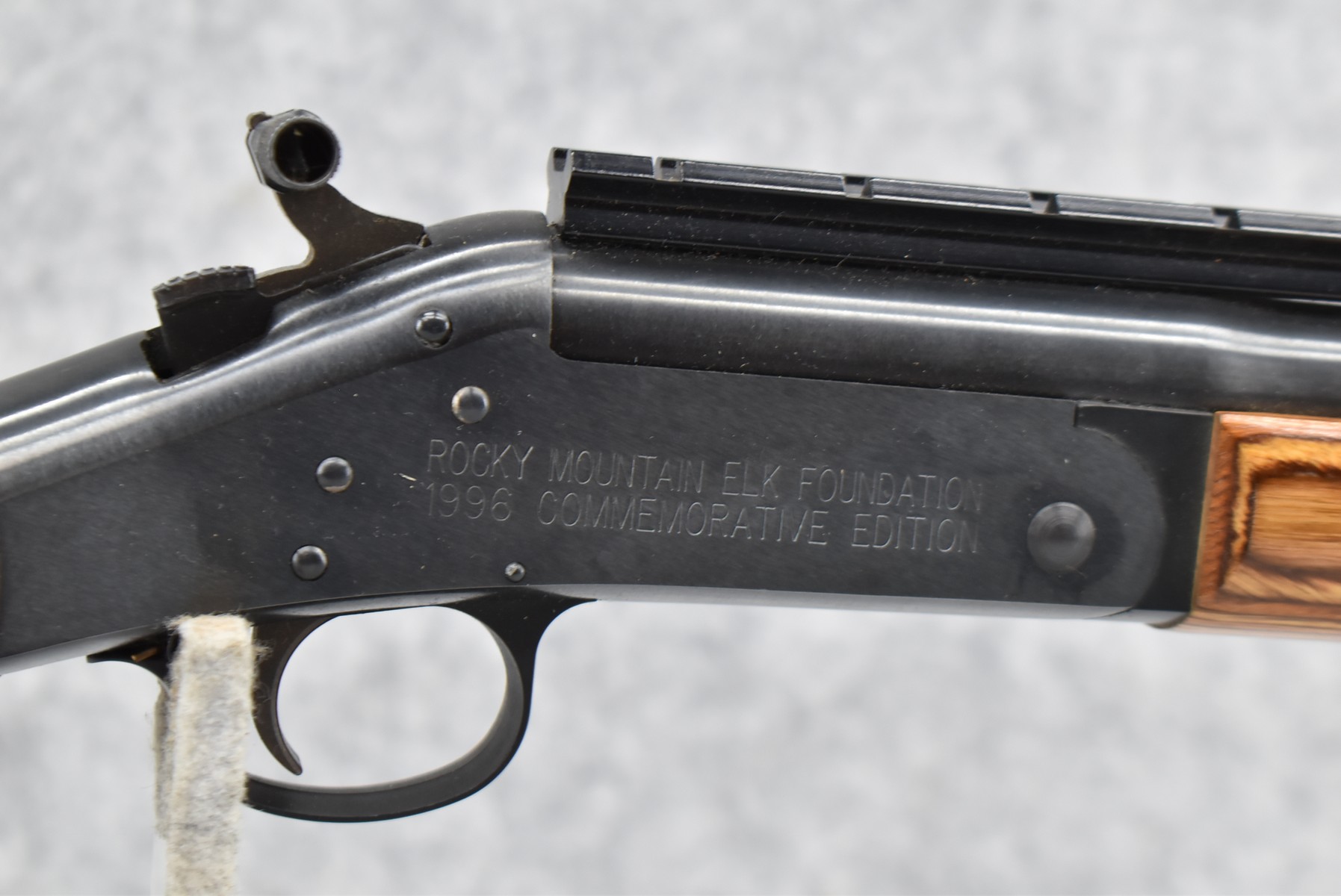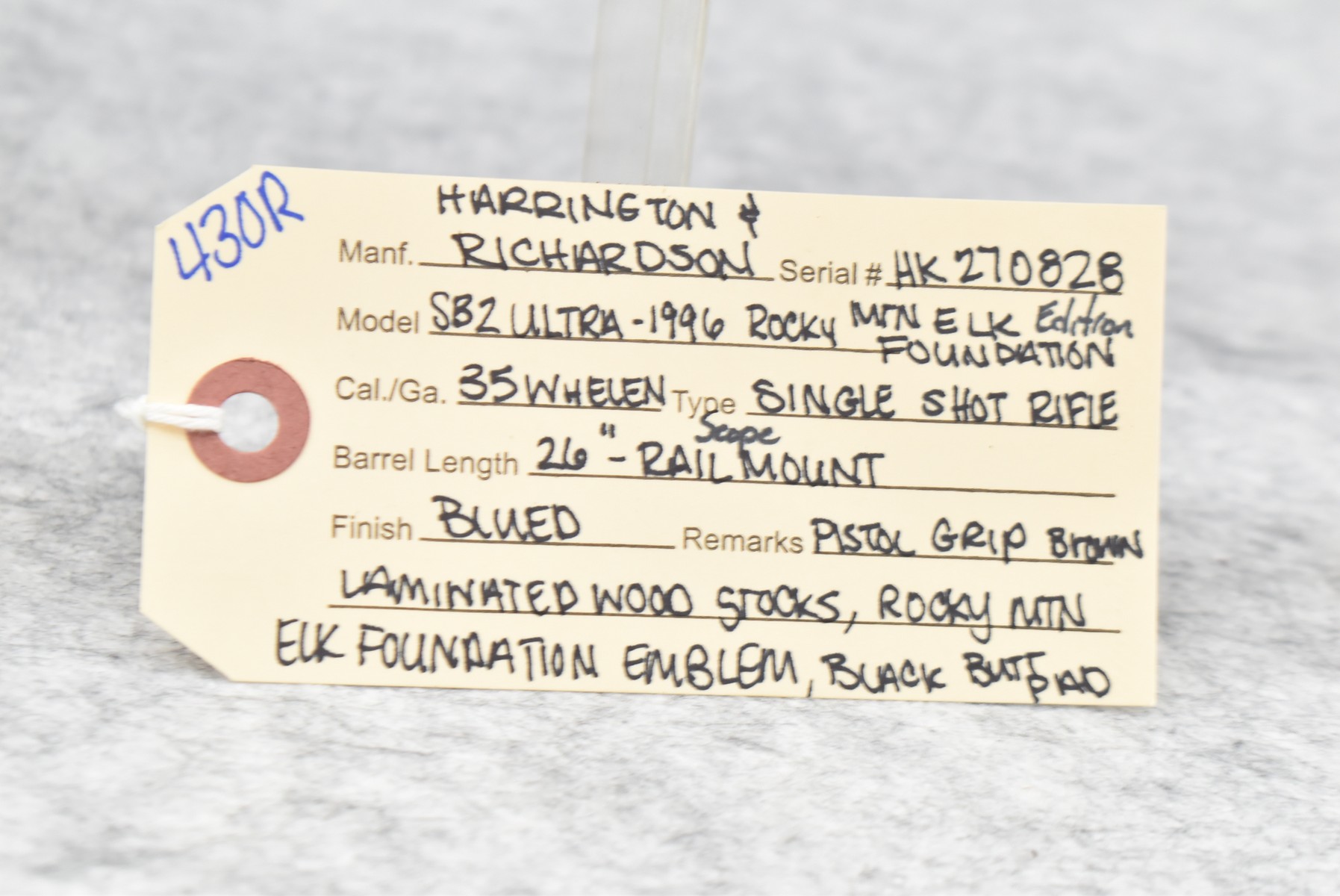 430R. Harrington and Richardson – Mod. SB2 Ultra 1996 Rocky Mountain Elk Foundation Edition – 35 Whelen Cal. Single Shot Rifle – w/26” Barrel w/Scope Rail Mount – Blued Finish – w/Pistol Grip Brown Laminate Wood Stocks w/Rocky Mountain Elk Foundation Emblem and Factory Butt Pad