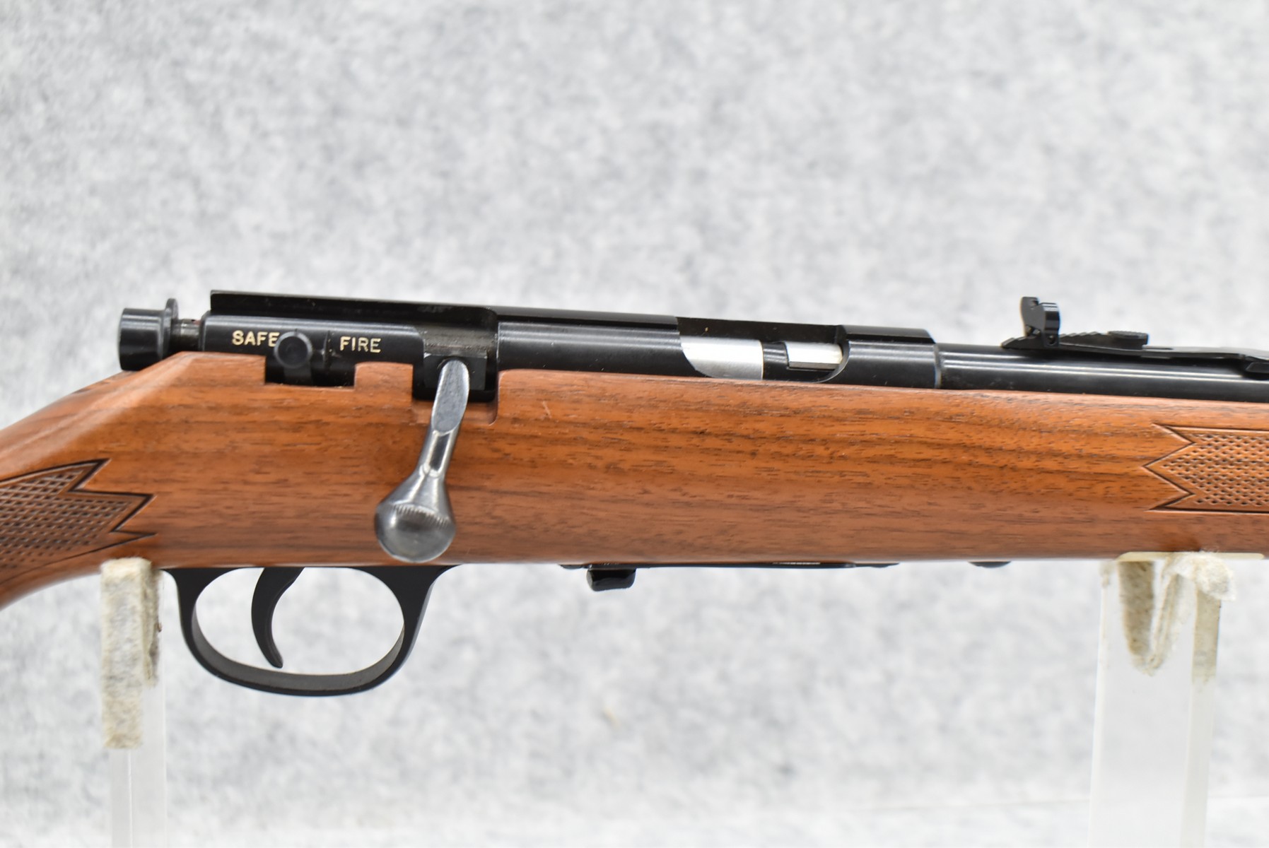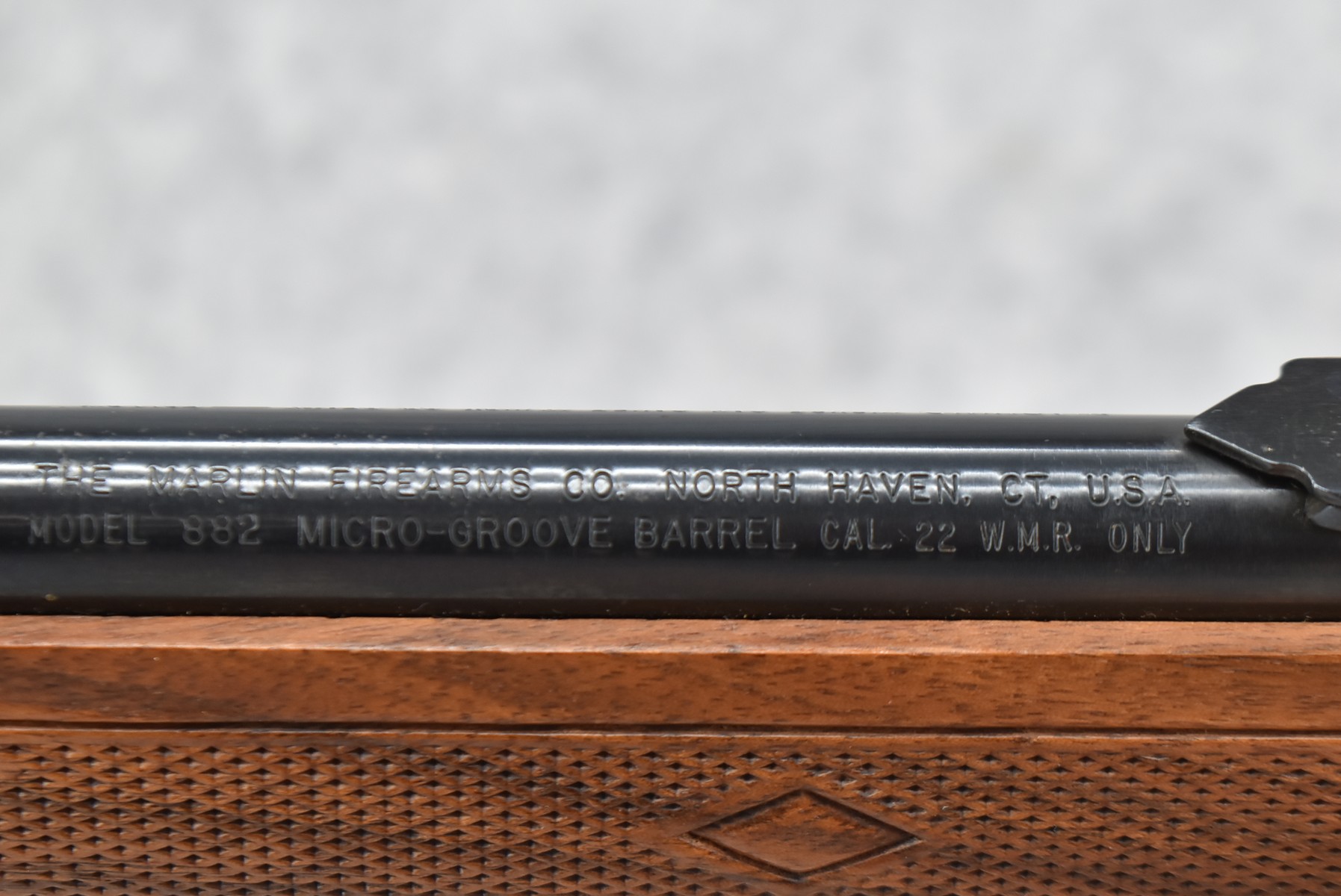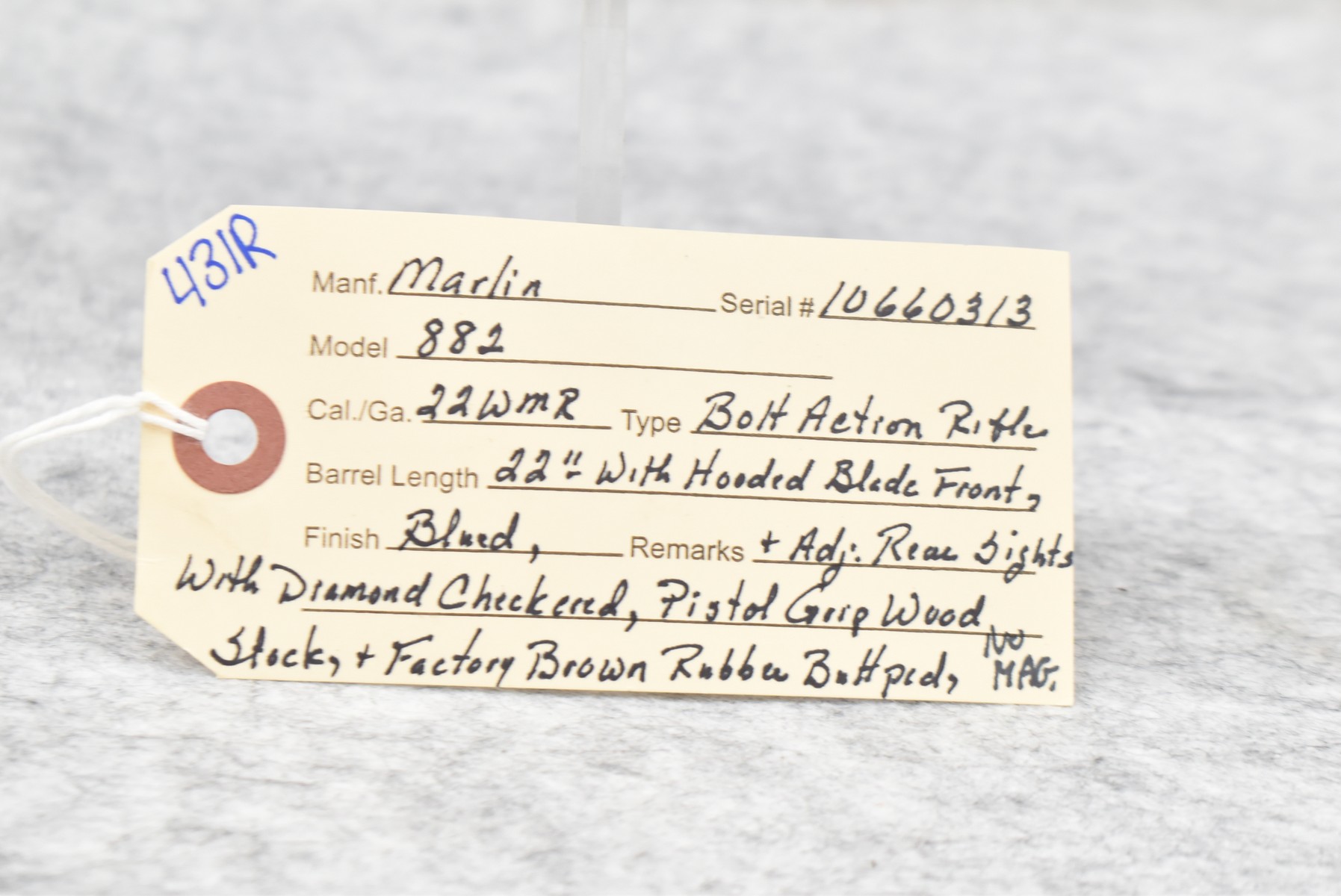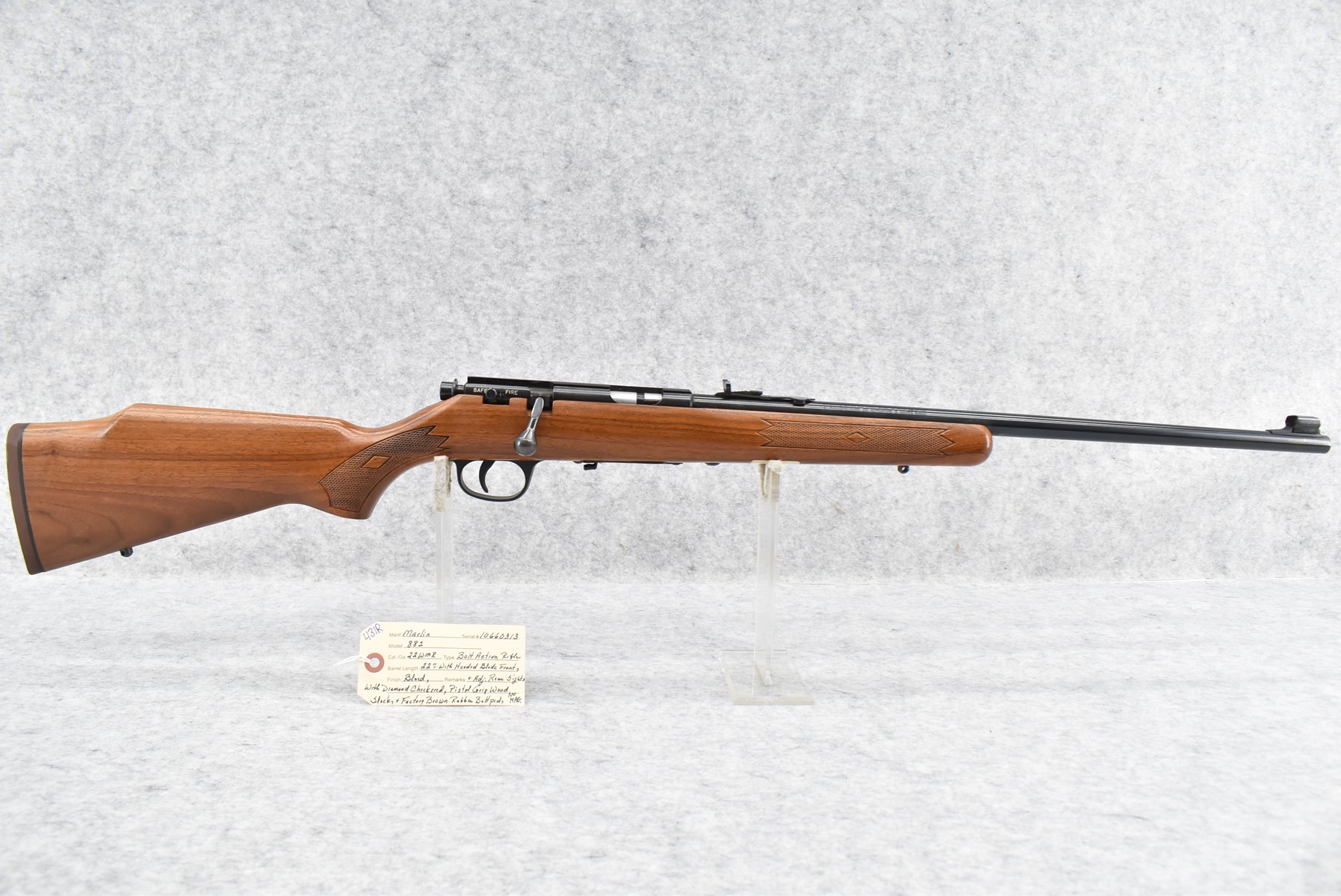 431R. Marlin – Mod. 882 – 22 WMR Cal. Bolt Action Rifle – w/22” Barrel w/Hooded Blade Front and Adjustable Rear Sights – Blued Finish – w/Diamond Checkered Pistol Grip Wood Stock w/Factory Brown Rubber Butt Pad – No Magazine
