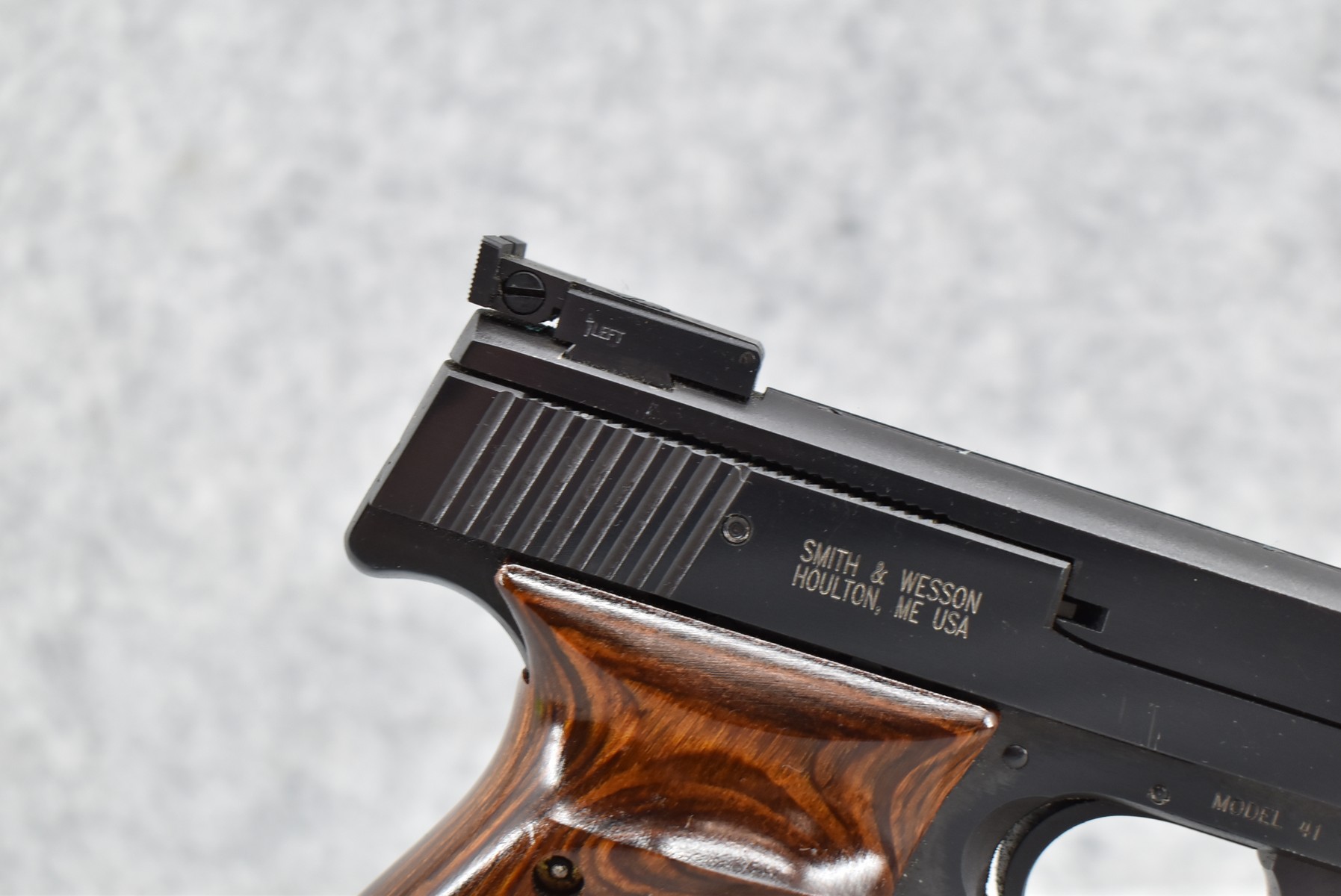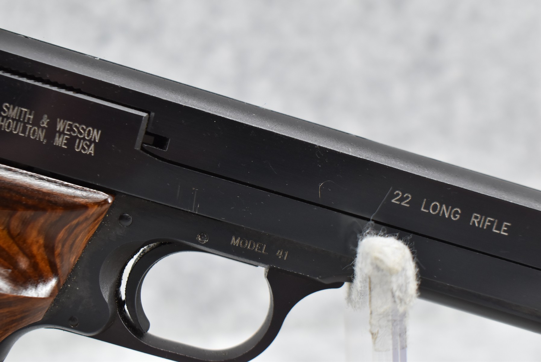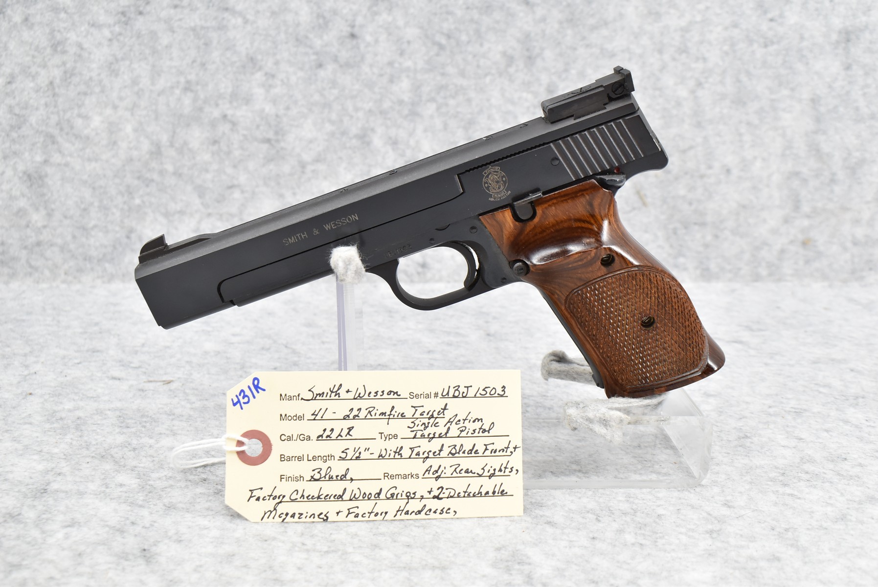 431R. Smith & Wesson – Mod. 41– 22LR Cal. Semi-Auto Target Pistol – w/5½” Barrel w/Target Blade Front and Adjustable Rear Sights – Blued Finish – w/Factory Checkered Wood Grips – w/Factory Hard Case and 2 Detachable Magazines