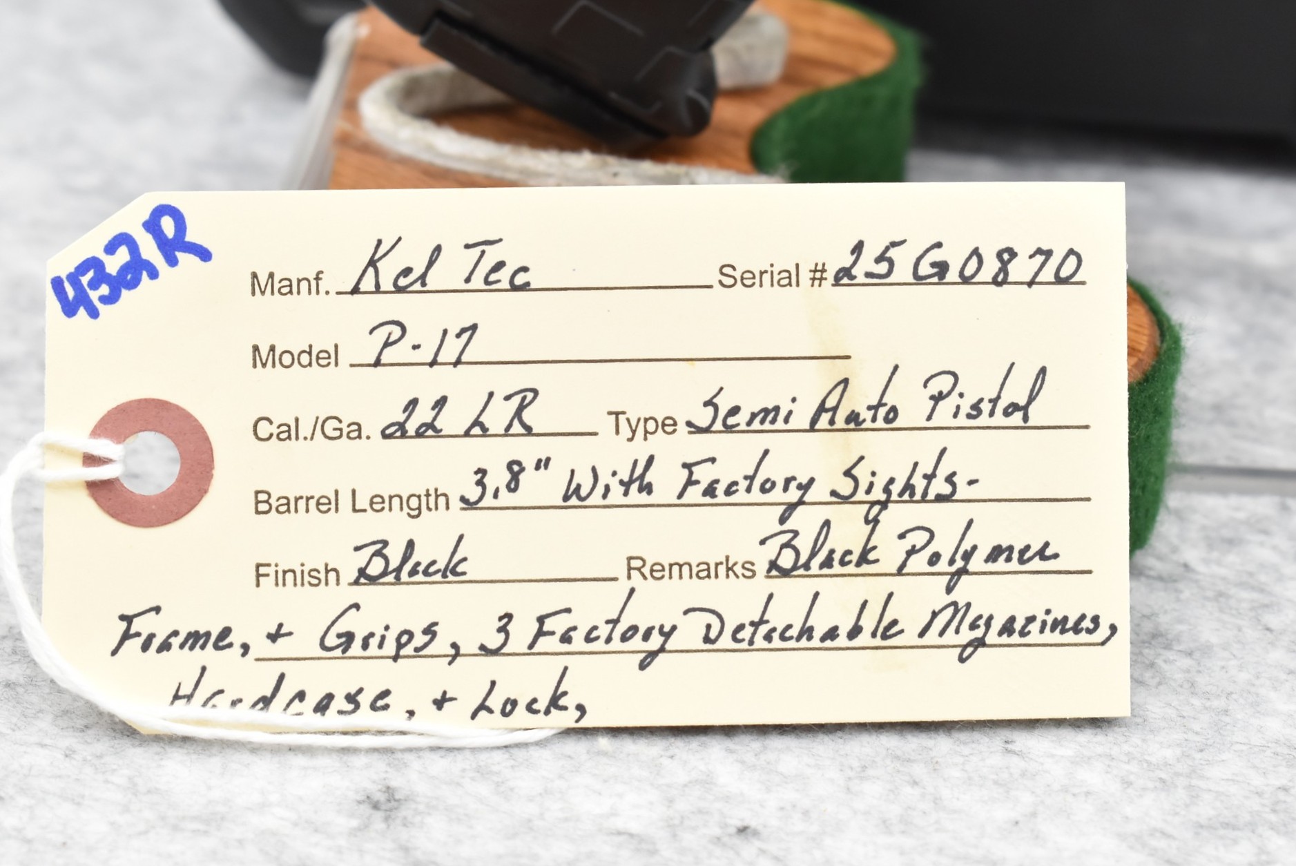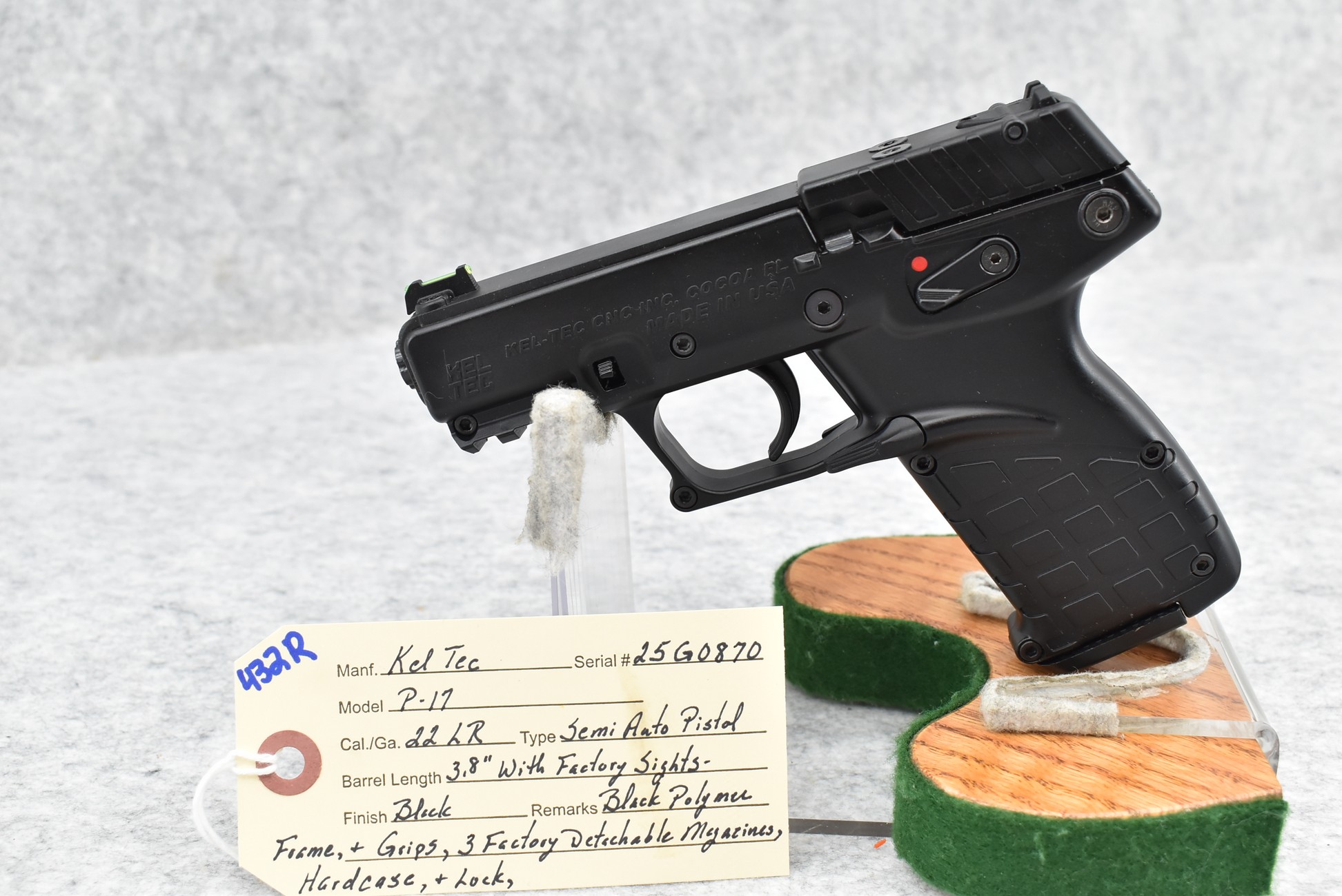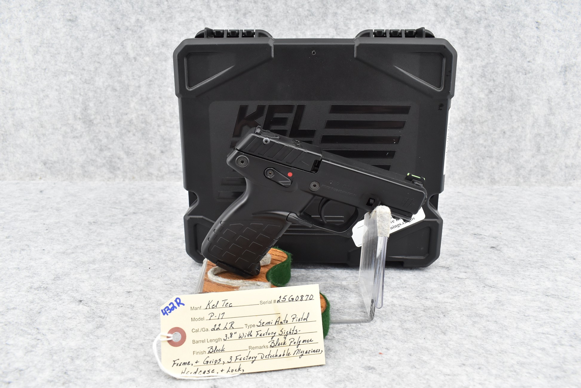432R. Kel Tec – Mod. P-17 – 22LR Cal. Semi-Auto Pistol – w/3.8” Barrel w/Factory Sights – Blued Finish – w/Black Polymer Frame & Grips – w/3 Factory Detachable Magazines – w/Hard Case