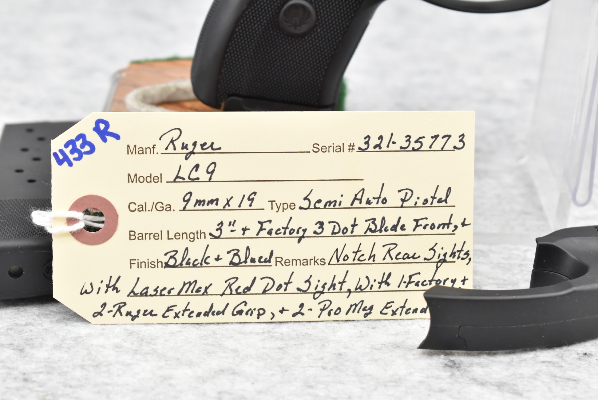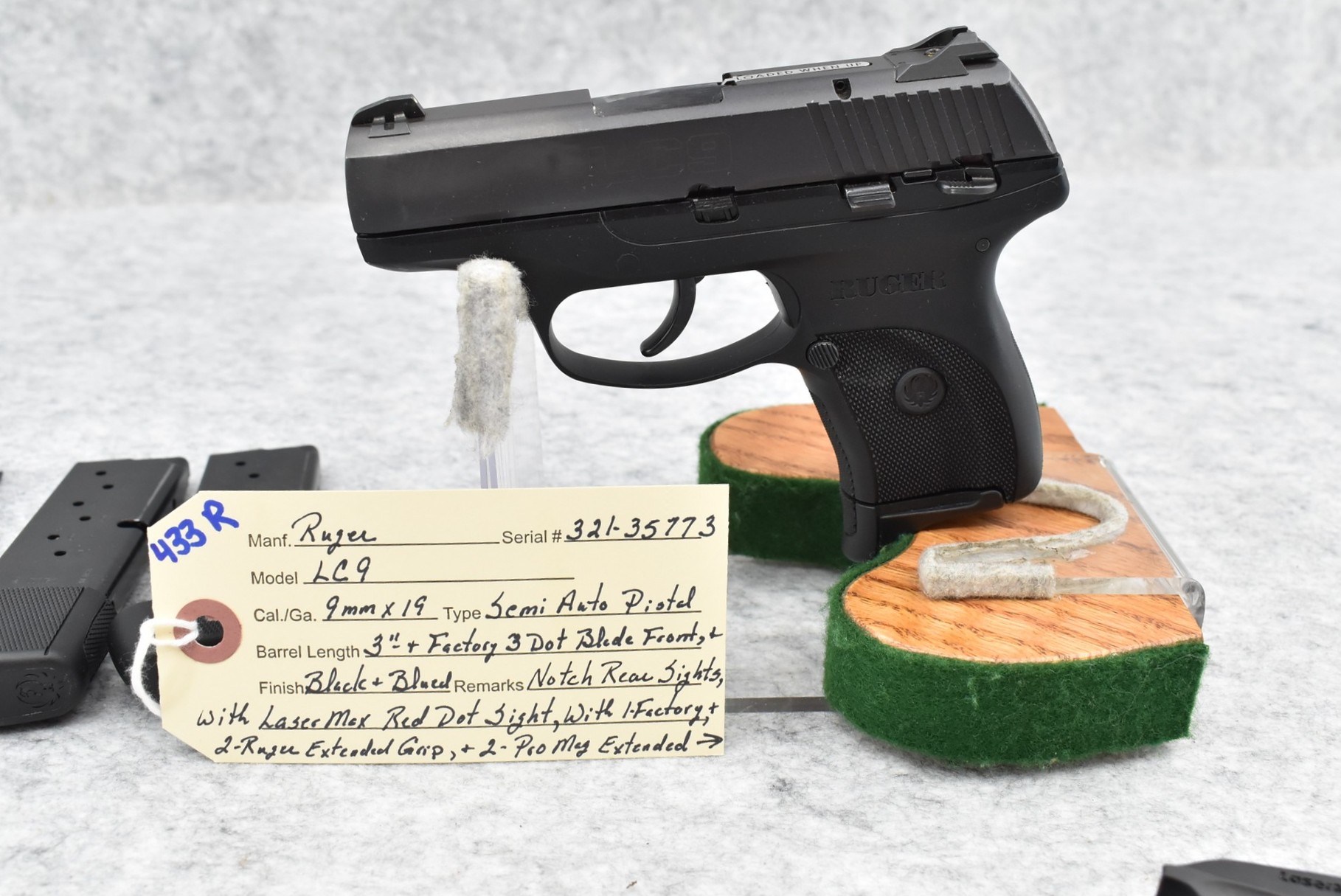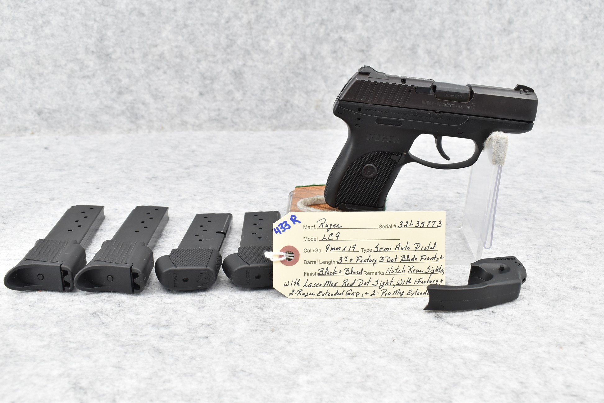433R. Ruger – Mod. LC9 – 9mm Cal. Semi-Auto Pistol – w/3” Barrel w/Factory 3-Dot Blade Front & Notch Rear Sights – Blued Finish – w/5 Detachable Mags – w/LaserMax Red Dot Sight