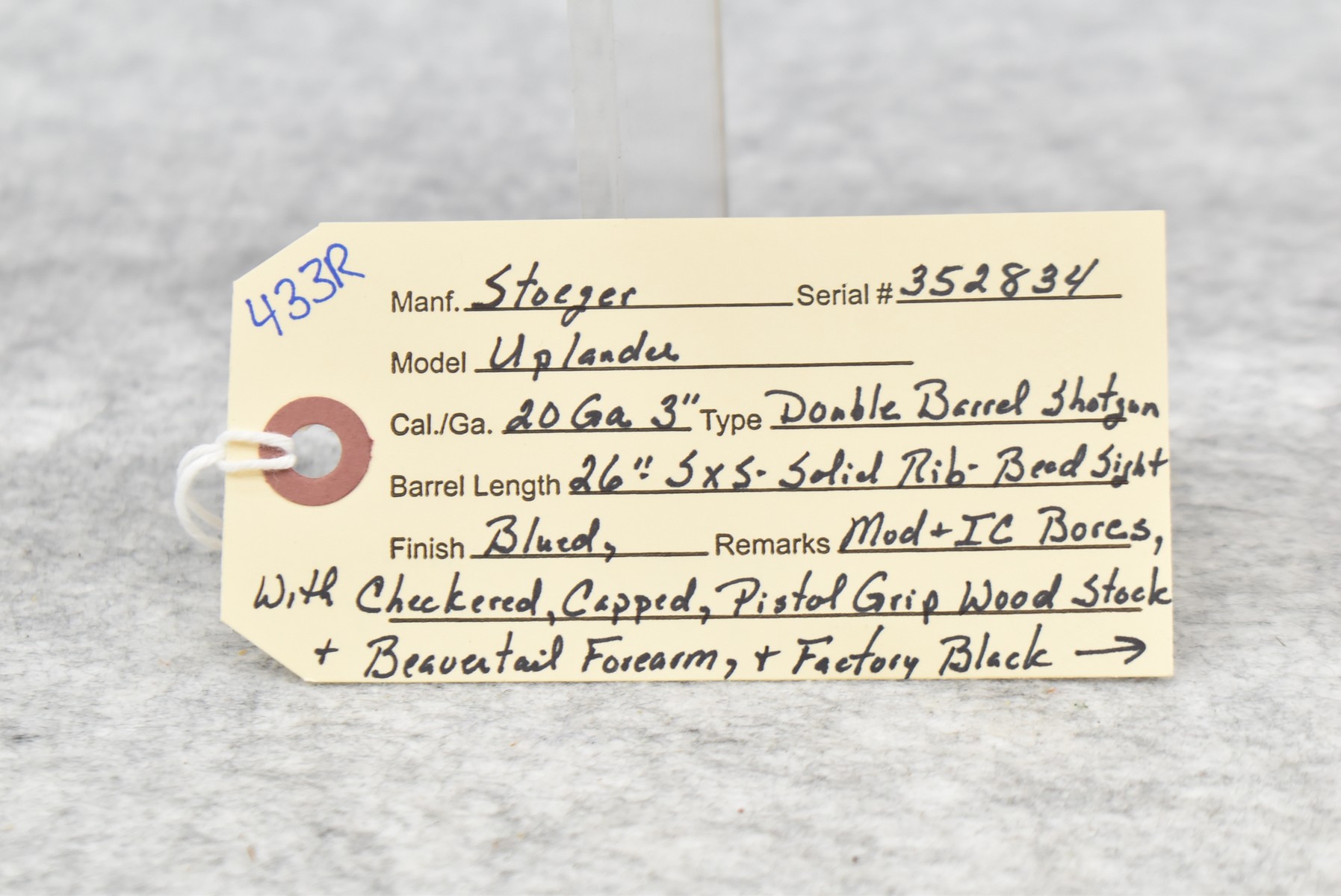 433R. Stoeger – Mod. Uplander – 20ga. 3” Double Barrel Shotgun – w/26” Mod. & IC Choked, Solid Rib & Lower Vent-Rib Barrels w/Bead Sight – Blued Finish – w/Checkered Capped Pistol Grip Wood Stock & Beavertail Forearm w/Factory Butt Plate