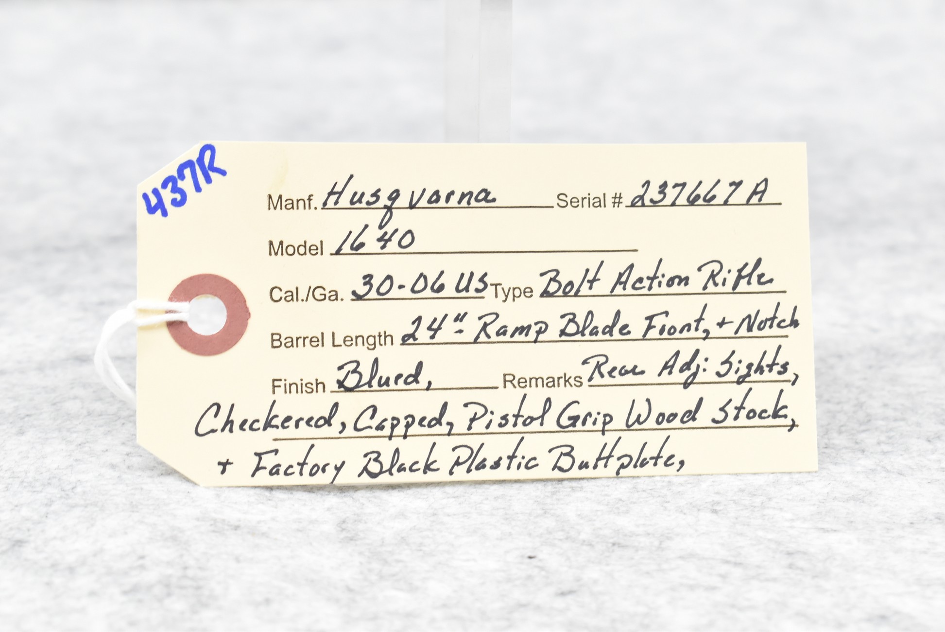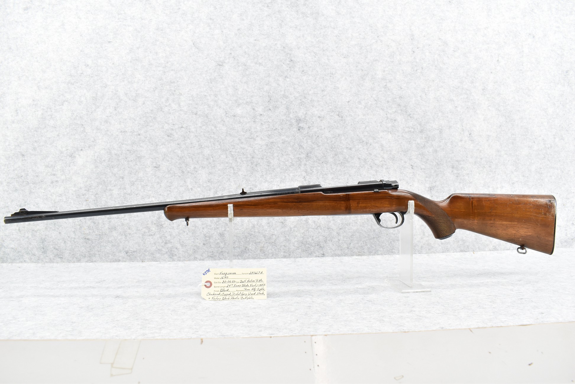 437R. Husqvarna – Mod. 1640 – 30-06 U.S. Cal. Bolt Action Rifle – w/24” Barrel w/Ramp Blade Front and Adjustable Rear Notch Sights – Blued Finish – w/Checkered Capped Pistol Grip Wood Stock w/Factory Butt Plate