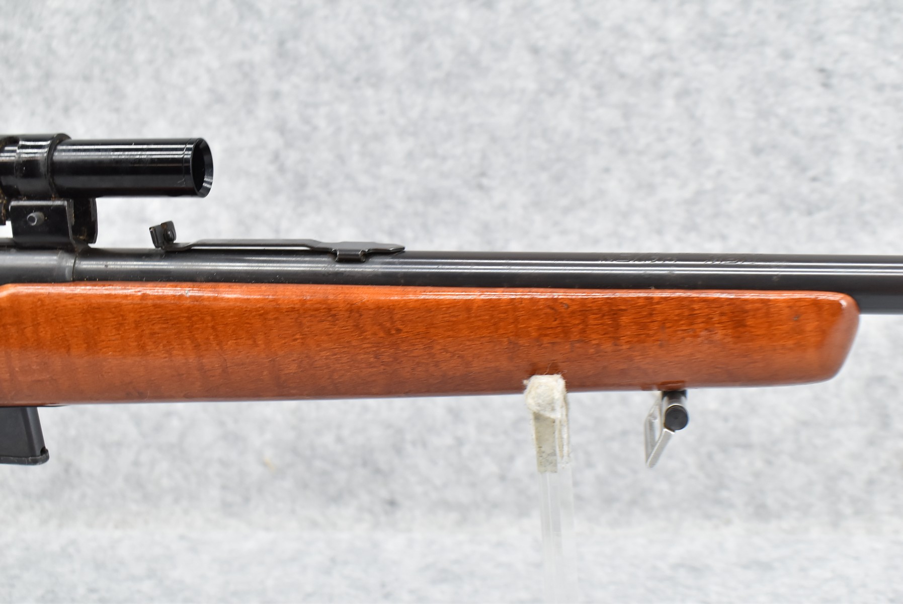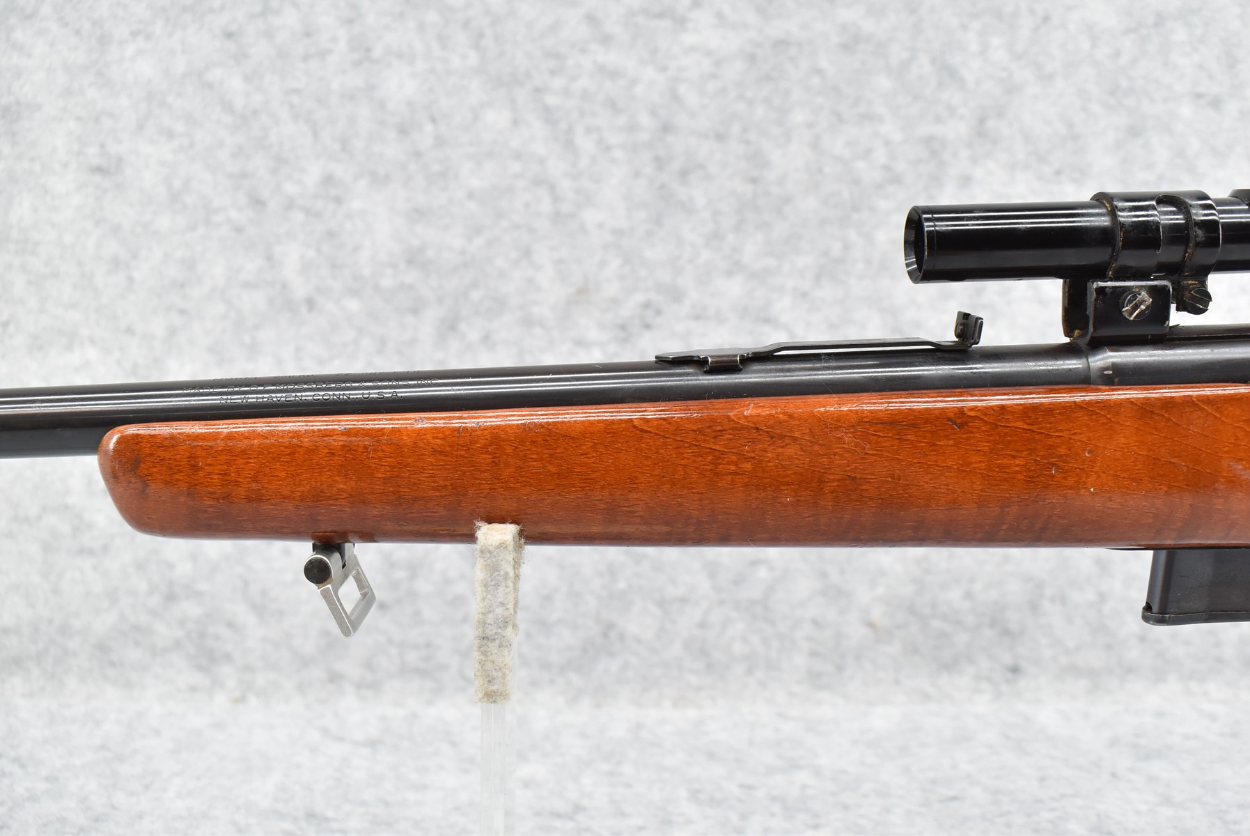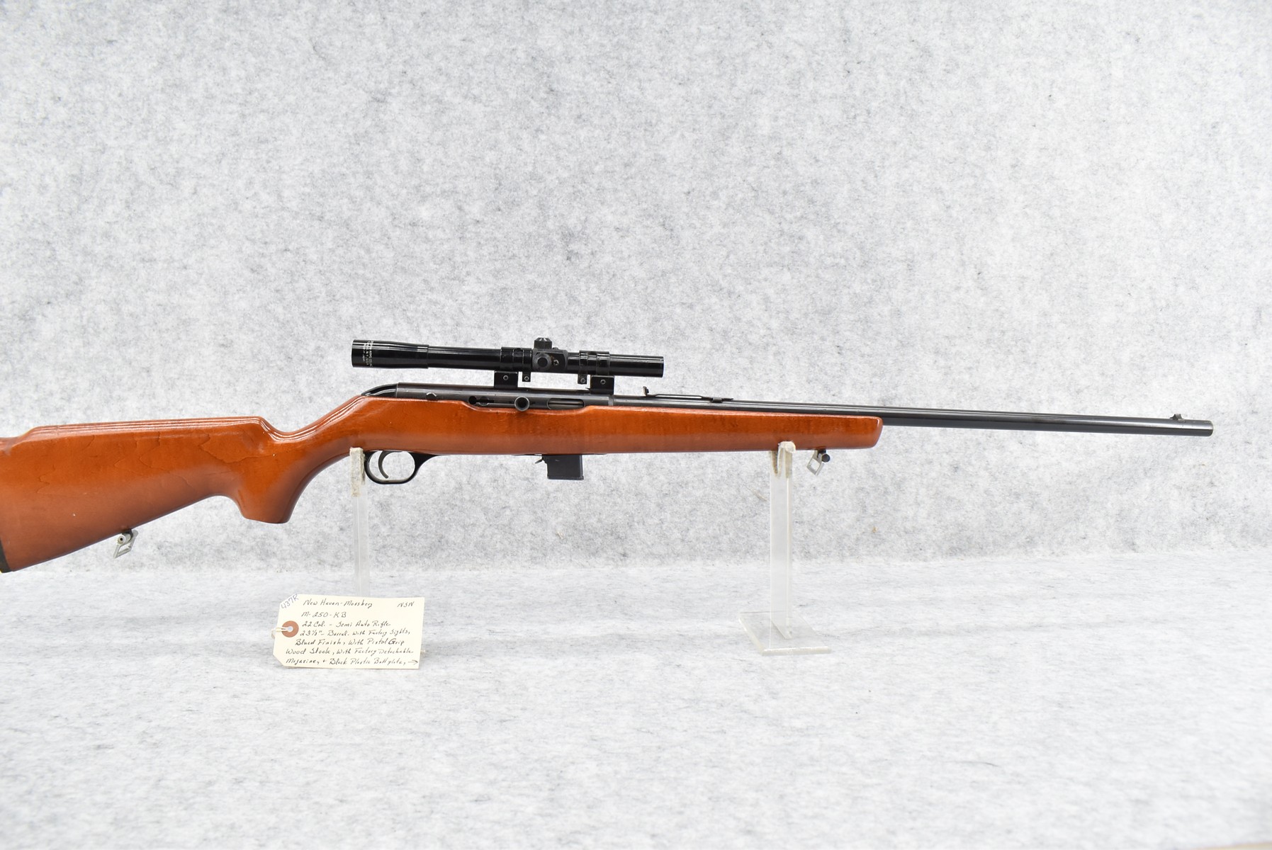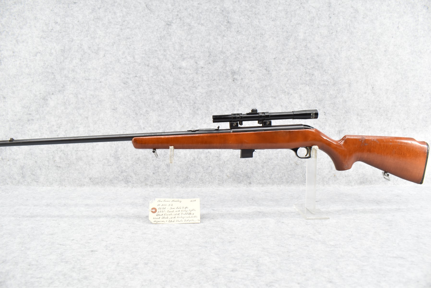 437R.     New Haven-Mossberg – Mod. 250-KB – 22 Cal. Semi-Auto Rifle – w/23 ½” Barrel w/Factory Sights – Blued Finish – w/Pistol Grip Wood Stock w/Factory Butt Plate – w/Factory Detachable Magazine – w/Crossman 4x15mm Scope & Mounts