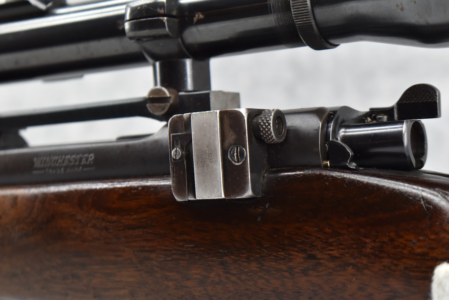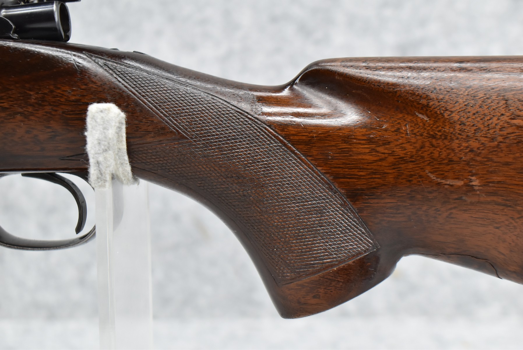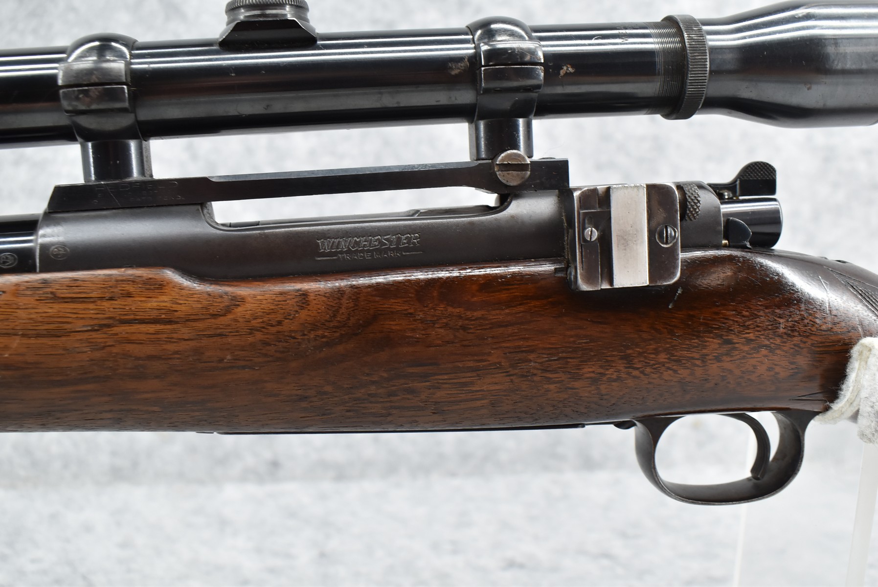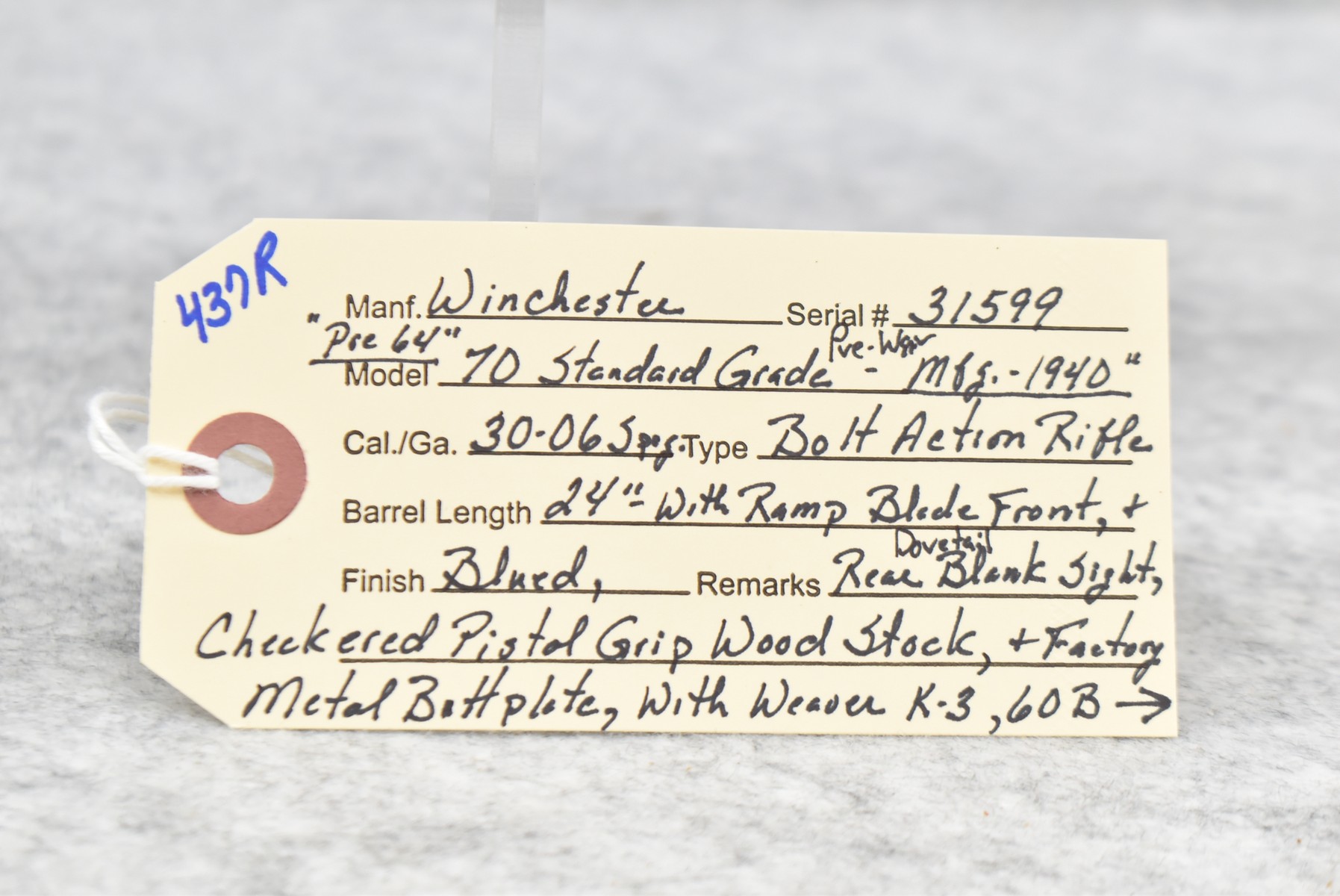 437R. Winchester – Mod. 70 Standard (Pre 64) Pre-War – 30-06 Sprg. Cal. Bolt Action Rifle – w/24” Barrel w/Ramp Blade Front and Rear Dovetail Blank Sights – Blued Finish – w/Checkered Pistol Grip Wood Stock w/Factory Metal Butt Plate – w/Weaver K-3 60B Scope, Redfield Mounts, and Rear Lyman Peep Sight Mount Base – Manufactured in 1940