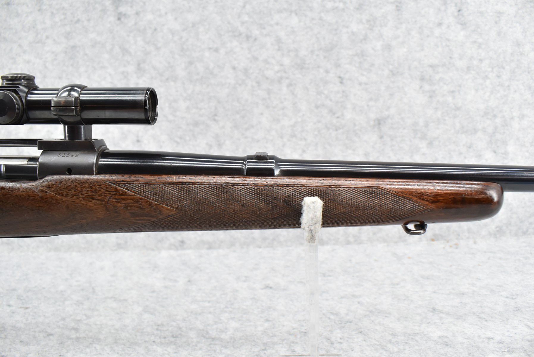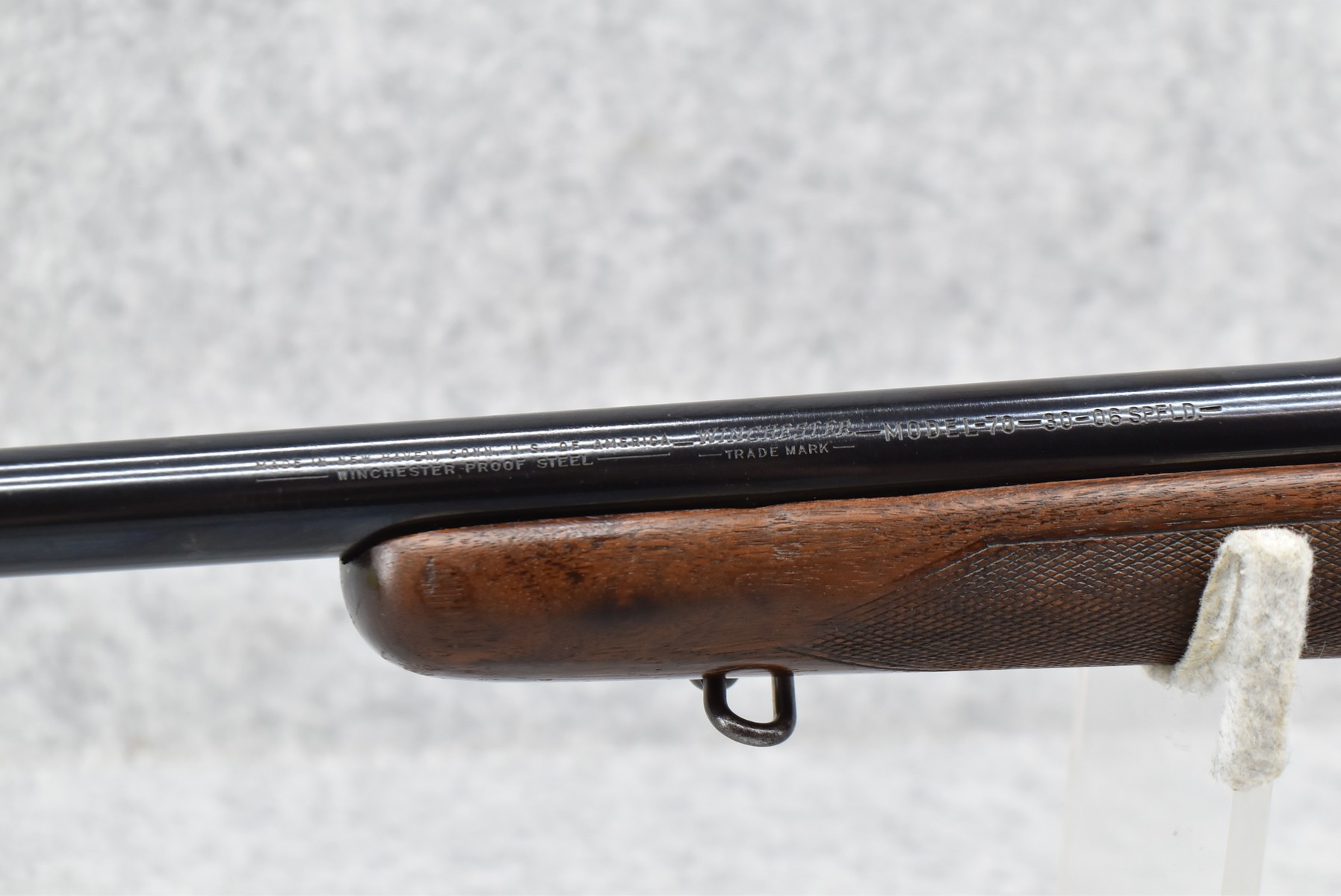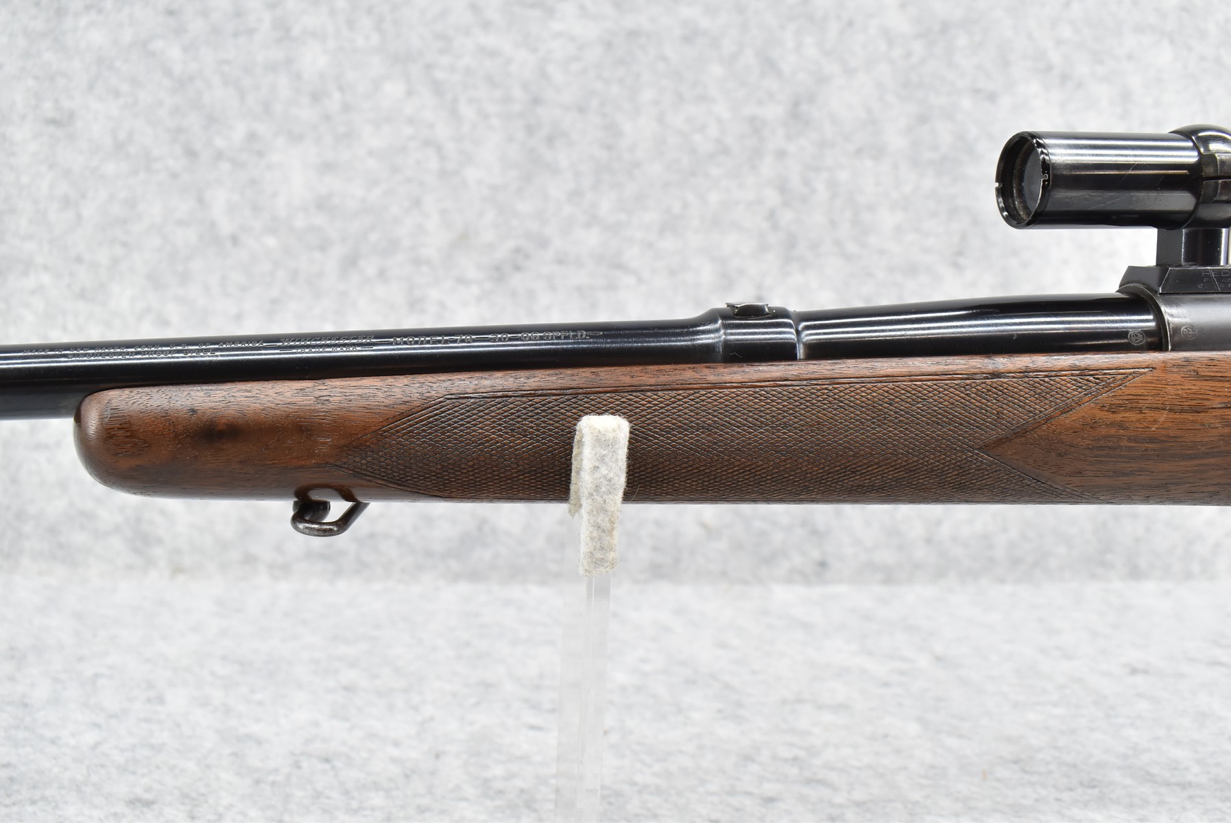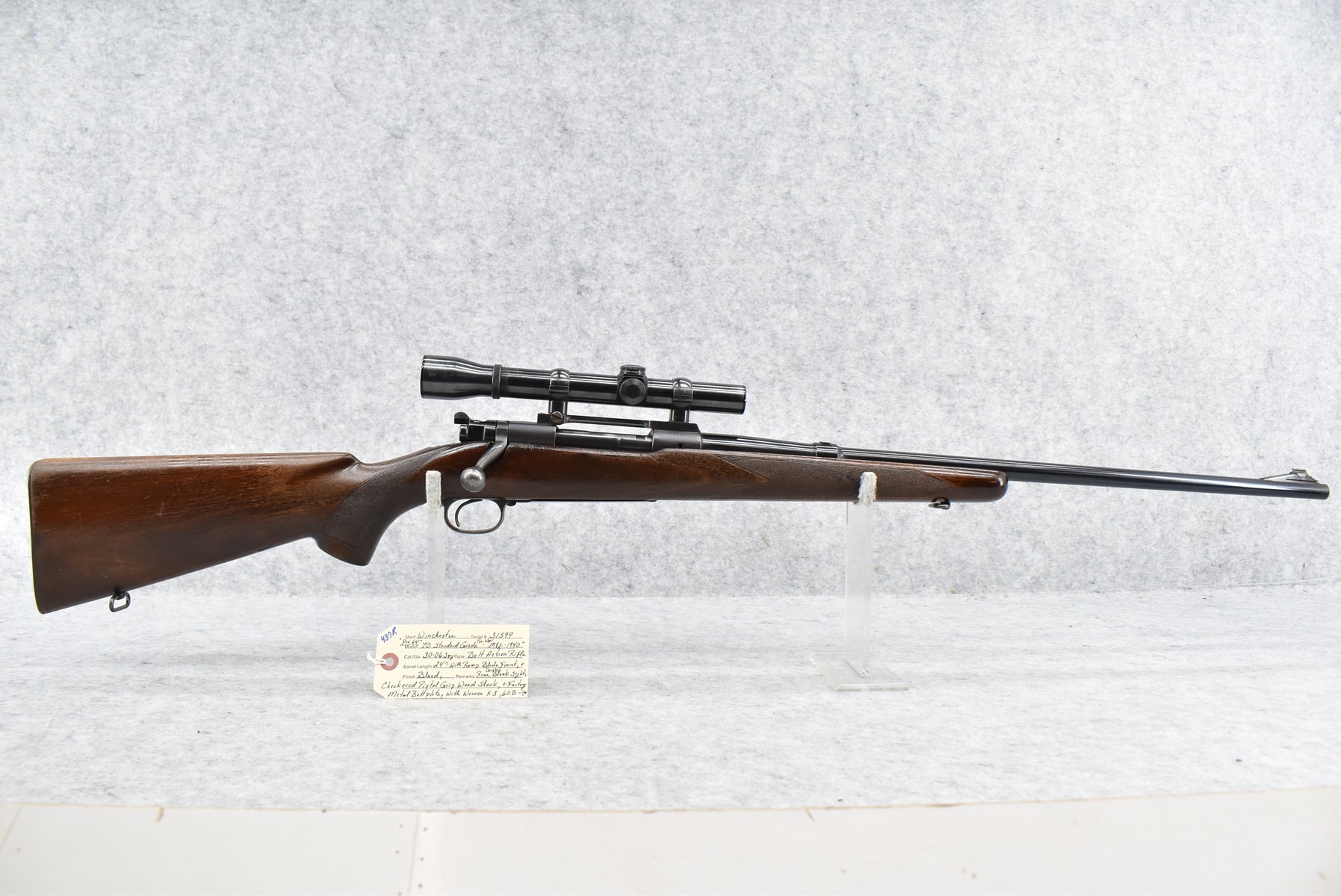 437R. Winchester – Mod. 70 Standard (Pre 64) Pre-War – 30-06 Sprg. Cal. Bolt Action Rifle – w/24” Barrel w/Ramp Blade Front and Rear Dovetail Blank Sights – Blued Finish – w/Checkered Pistol Grip Wood Stock w/Factory Metal Butt Plate – w/Weaver K-3 60B Scope, Redfield Mounts, and Rear Lyman Peep Sight Mount Base – Manufactured in 1940