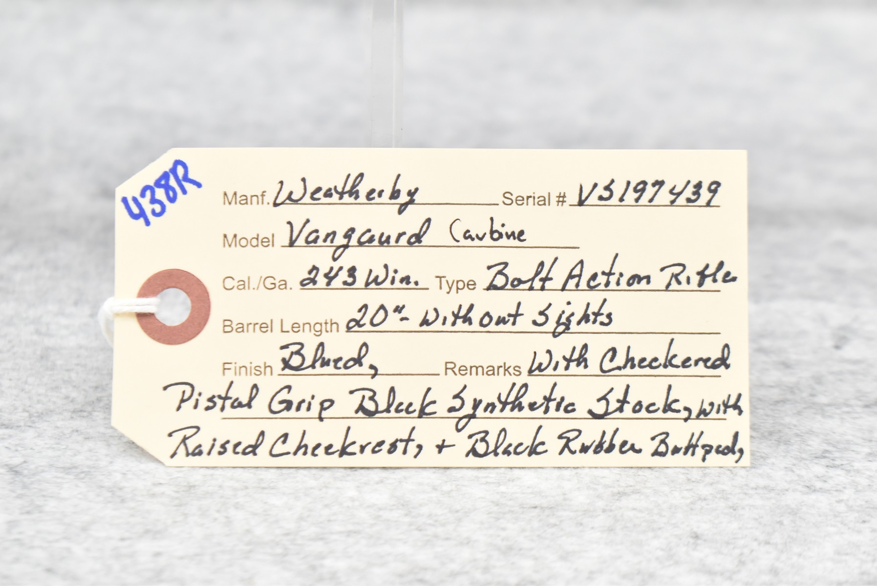 438R. Weatherby – Mod. Vanguard Carbine – 243 Win. Cal. Bolt Action Rifle – w/20” Barrel w/No Sights – Blued Finish – w/Checkered Pistol Grip Black Synthetic Stock w/Raised Cheek Rest and Black Rubber Butt Pad – Manufactured from 2009-2011