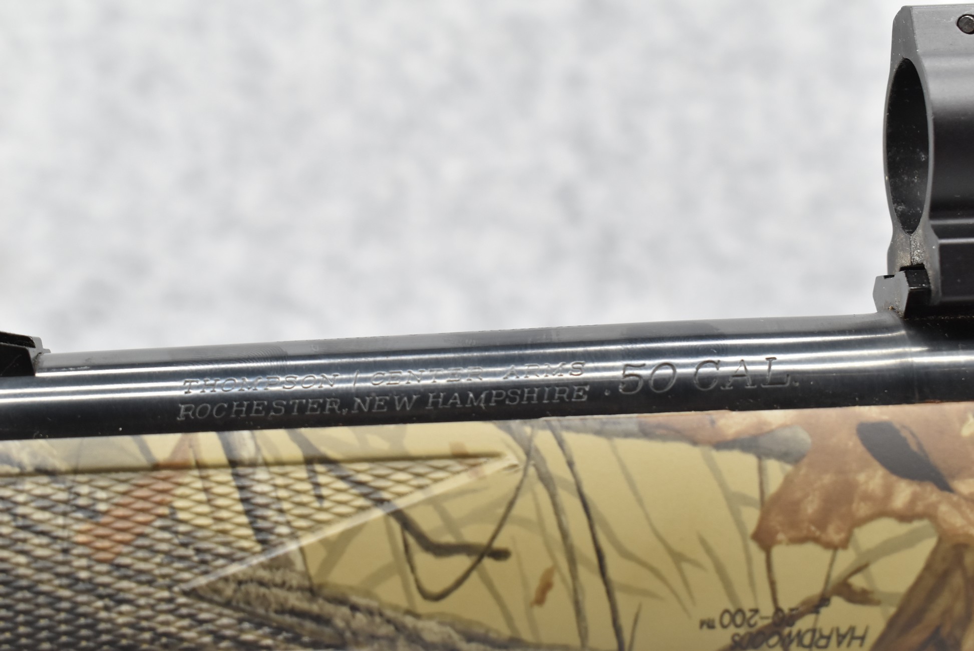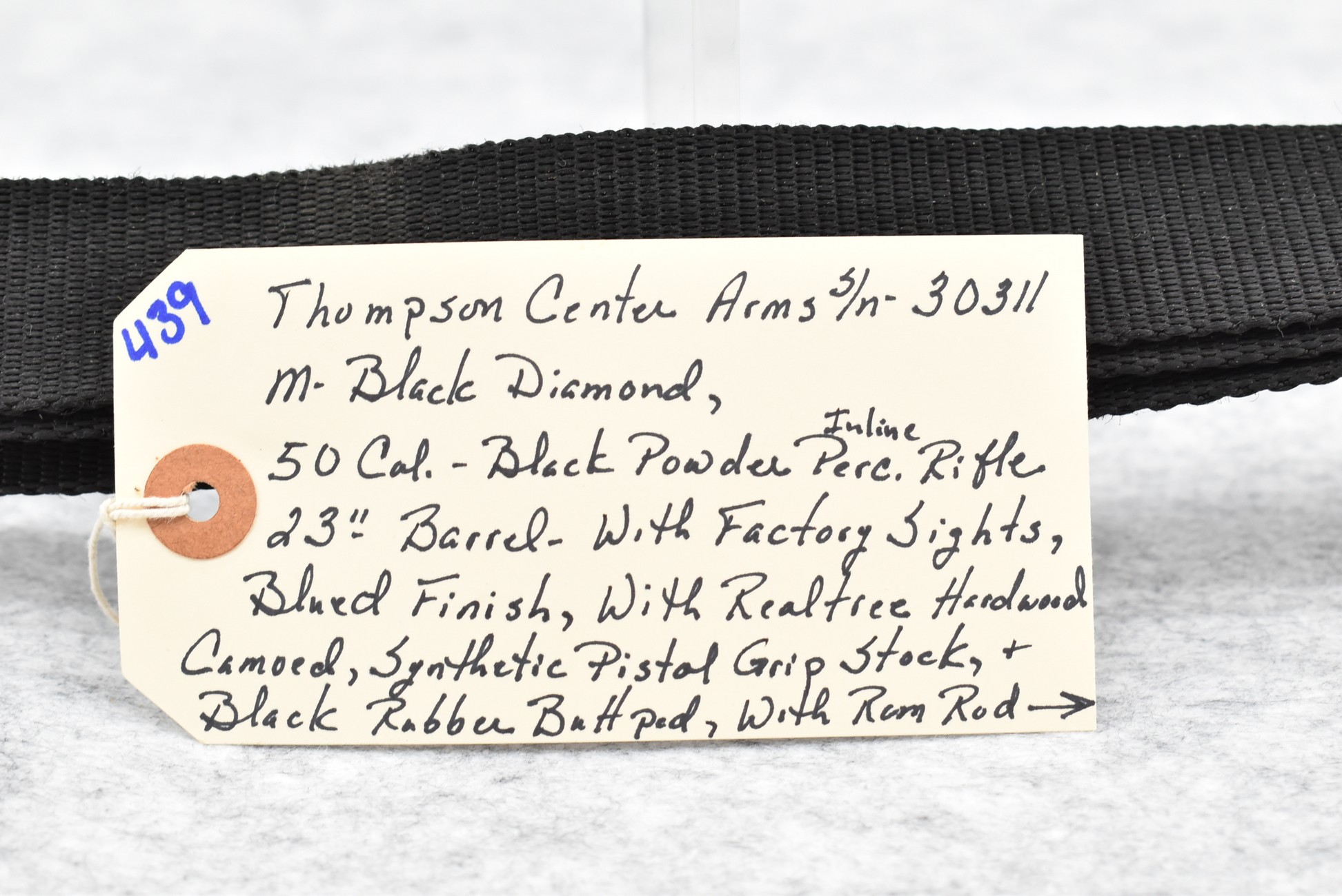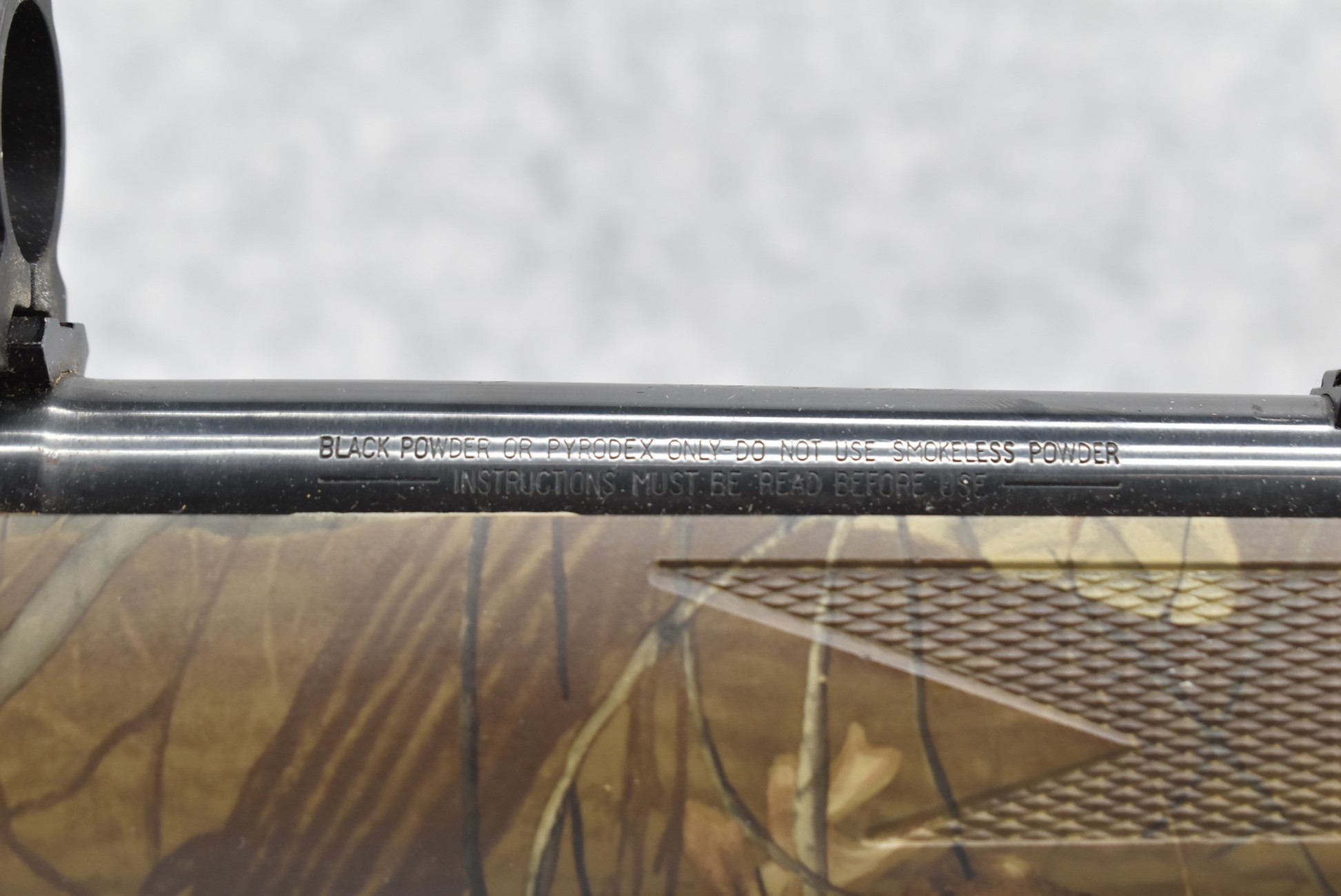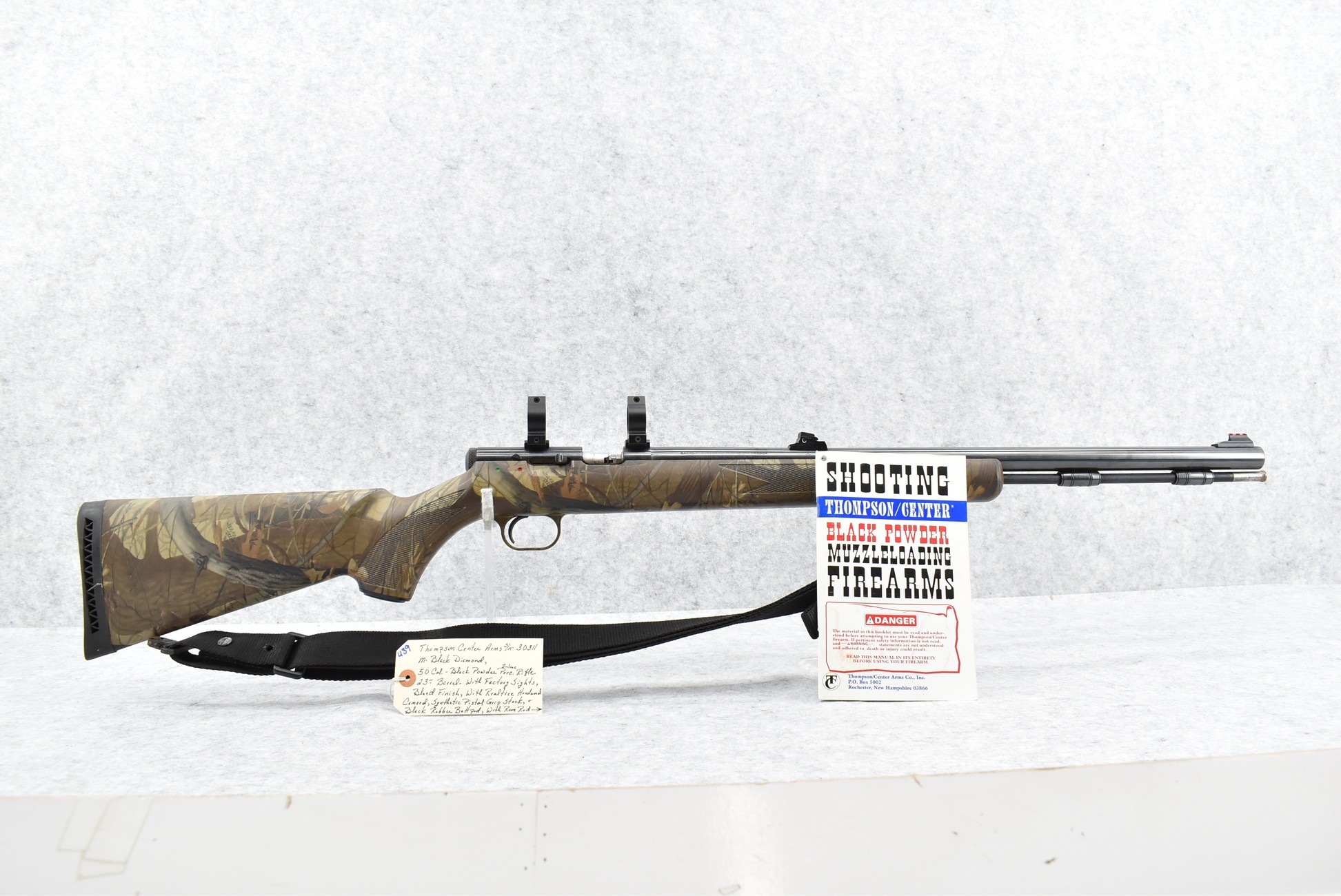 439. Thompson Center – Mod. Black Diamond – 50 Cal. Black Powder Inline Rifle – w/23” Barrel w/Factory Sights – Blued Finish – w/Realtree Hardwoods Camoed Synthetic Pistol Grip Stock w/Butt Pad – w/Ram Rod – w/Nylon Sling – w/Scope Rings – w/Manual
