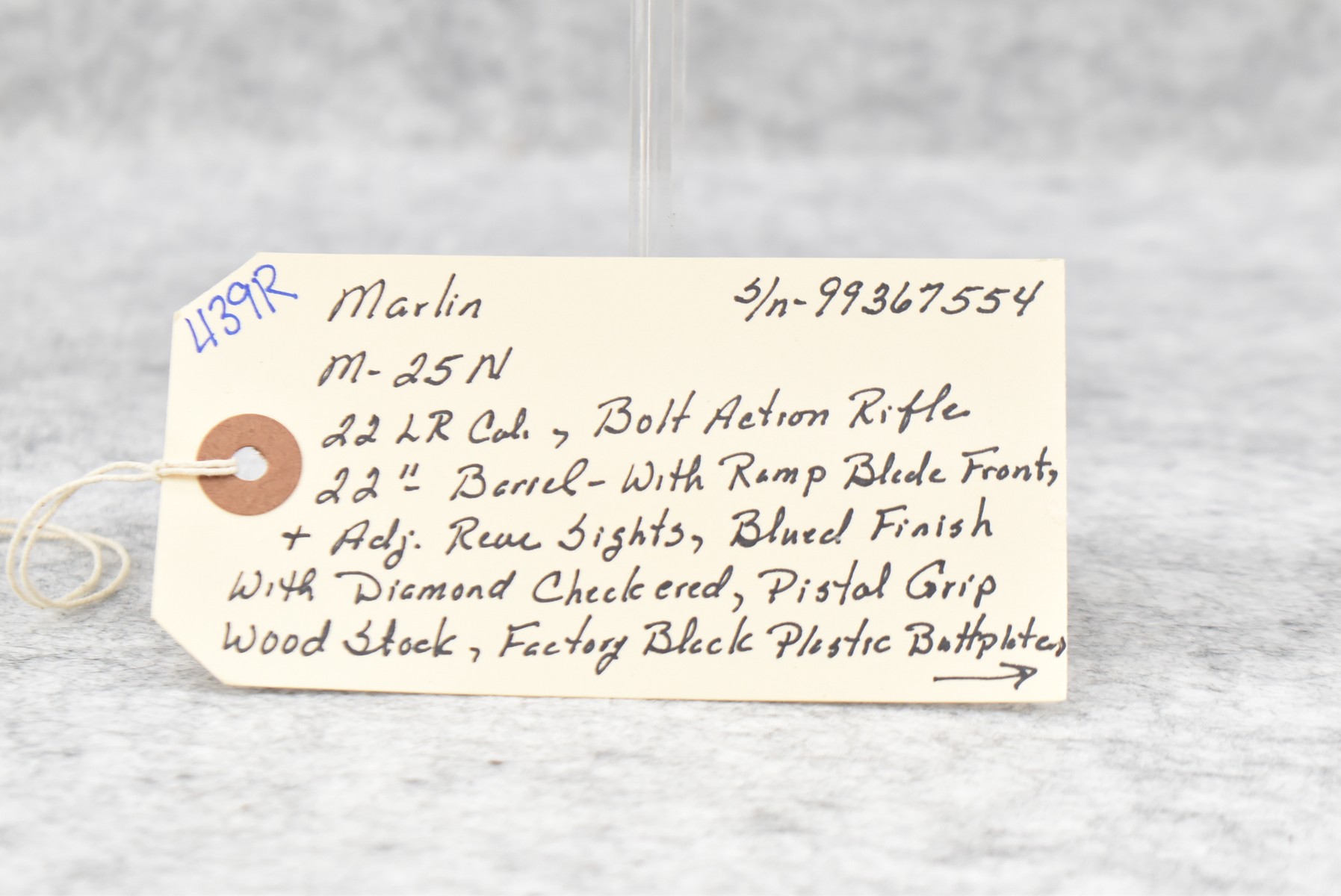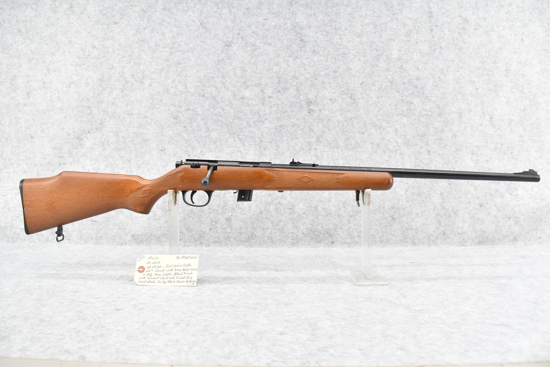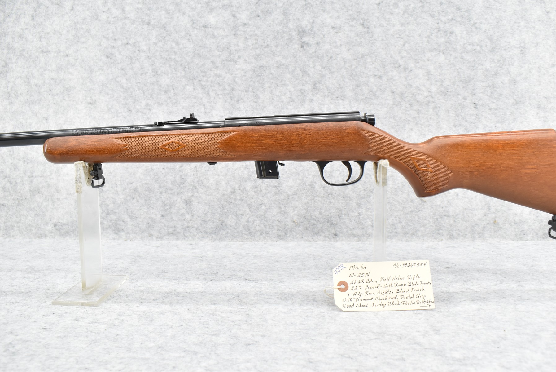 439R. Marlin – Mod. 25N – 22LR Cal. Bolt Action Rifle – w/22” Barrel w/Ramp Blade Front & Adj. Rear Sights – Blued Finish – w/Diamond Checkered Pistol Grip Wood Stock w/Factory Butt Plate – w/Factory Detachable Magazine – w/Sling Loops