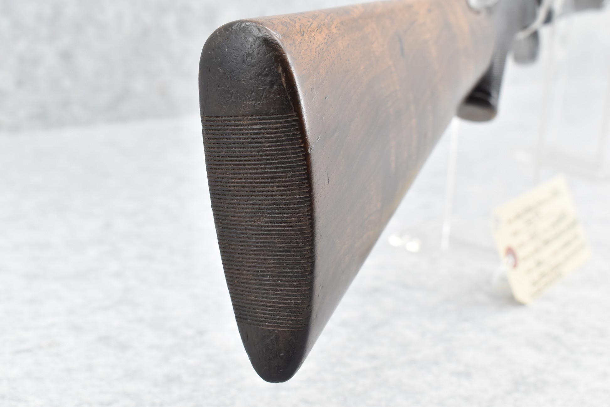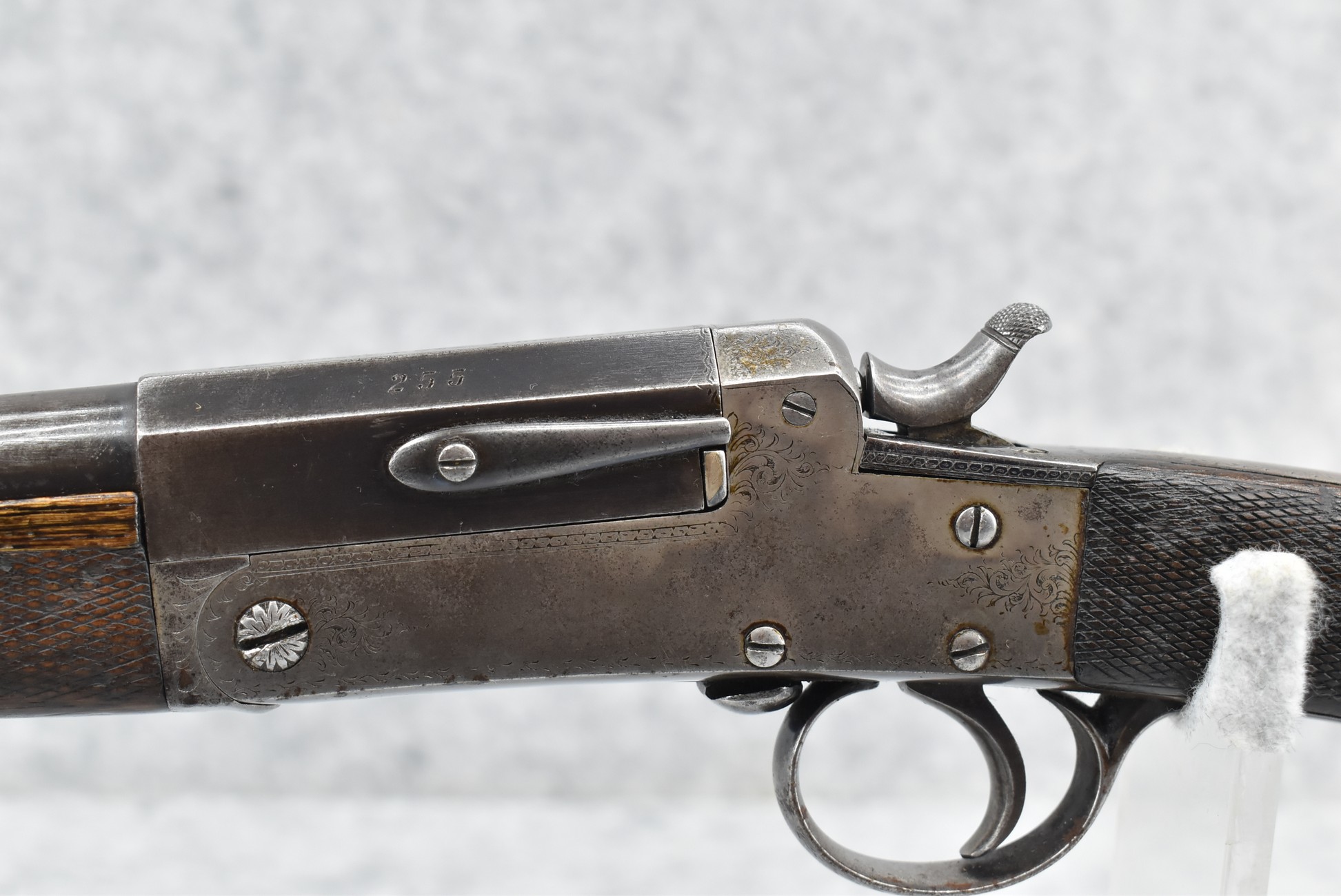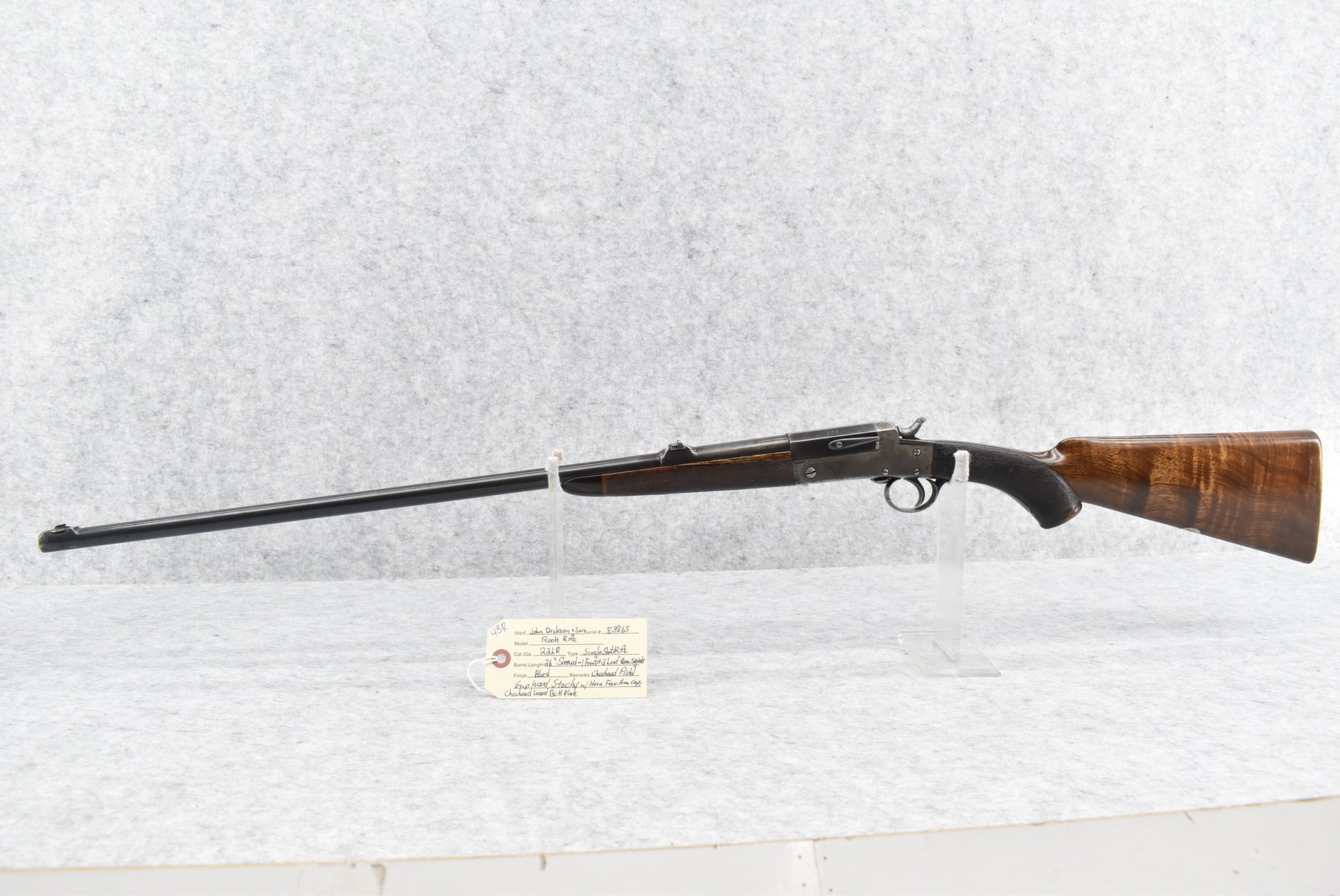 43R. John Dickson & Son – Mod. Rook Rifle – 22LR Cal. Single Shot Rifle – w/26” Sleeved Barrel w/Front and 3-Leaf Rear Sights – Blued Finish – w/Checkered Pistol Grip Wood Stocks and Horn Forearm Cap w/Checkered Wood Butt Plate