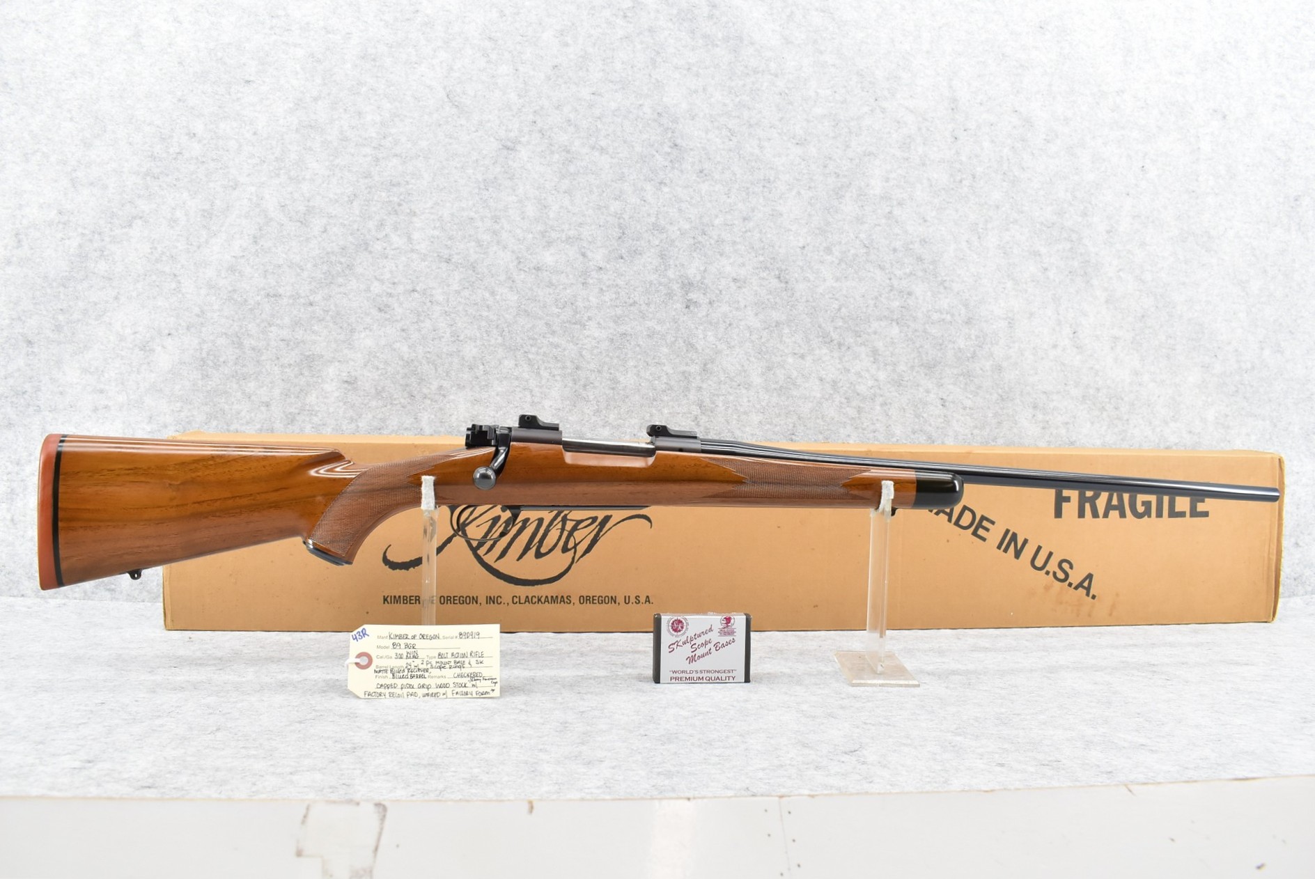 43R. Kimber of Oregon – Mod. 89 BGR – 300 Win. Mag. Cal. Bolt Action Rifle – w/24” Barrel – Matte Blued Finish – w/Checkered Capped Pistol Grip Wood Stock w/Factory Recoil Pad & Ebony Forearm Cap – w/2pc. Mount Base & SK Scope Rings – Unfired w/Factory Box – Fewer Than 5,000 Model 89’s Were Ever Produced