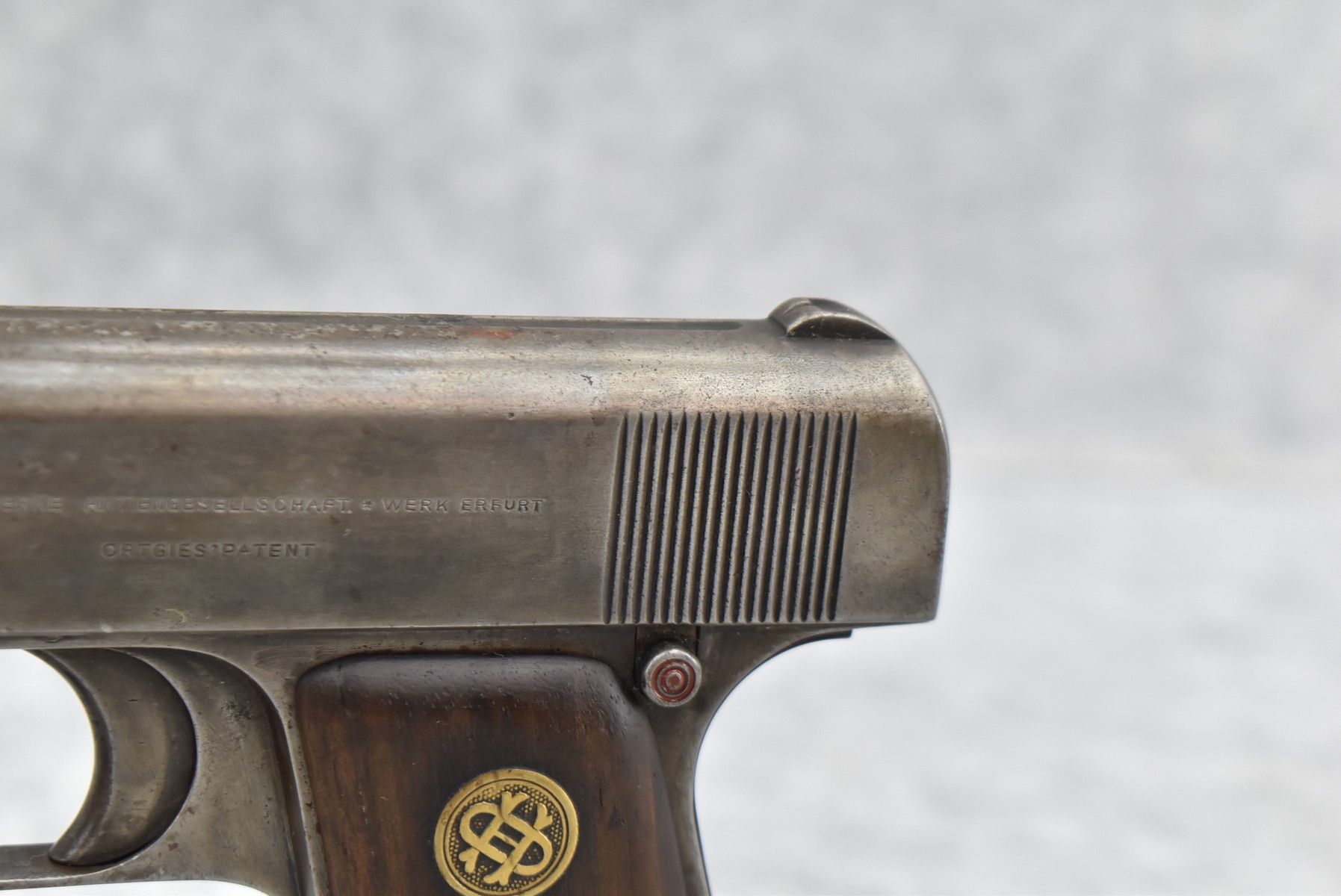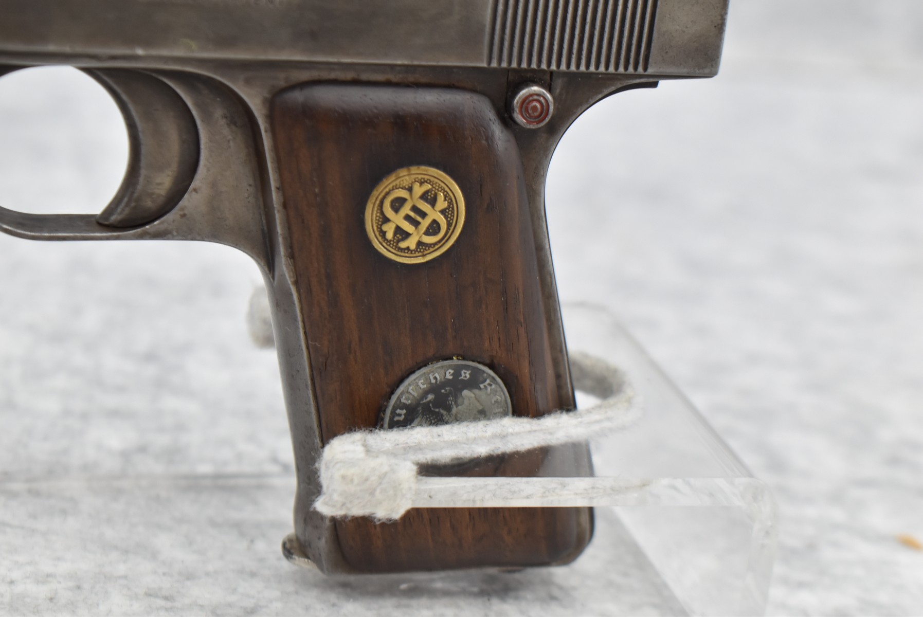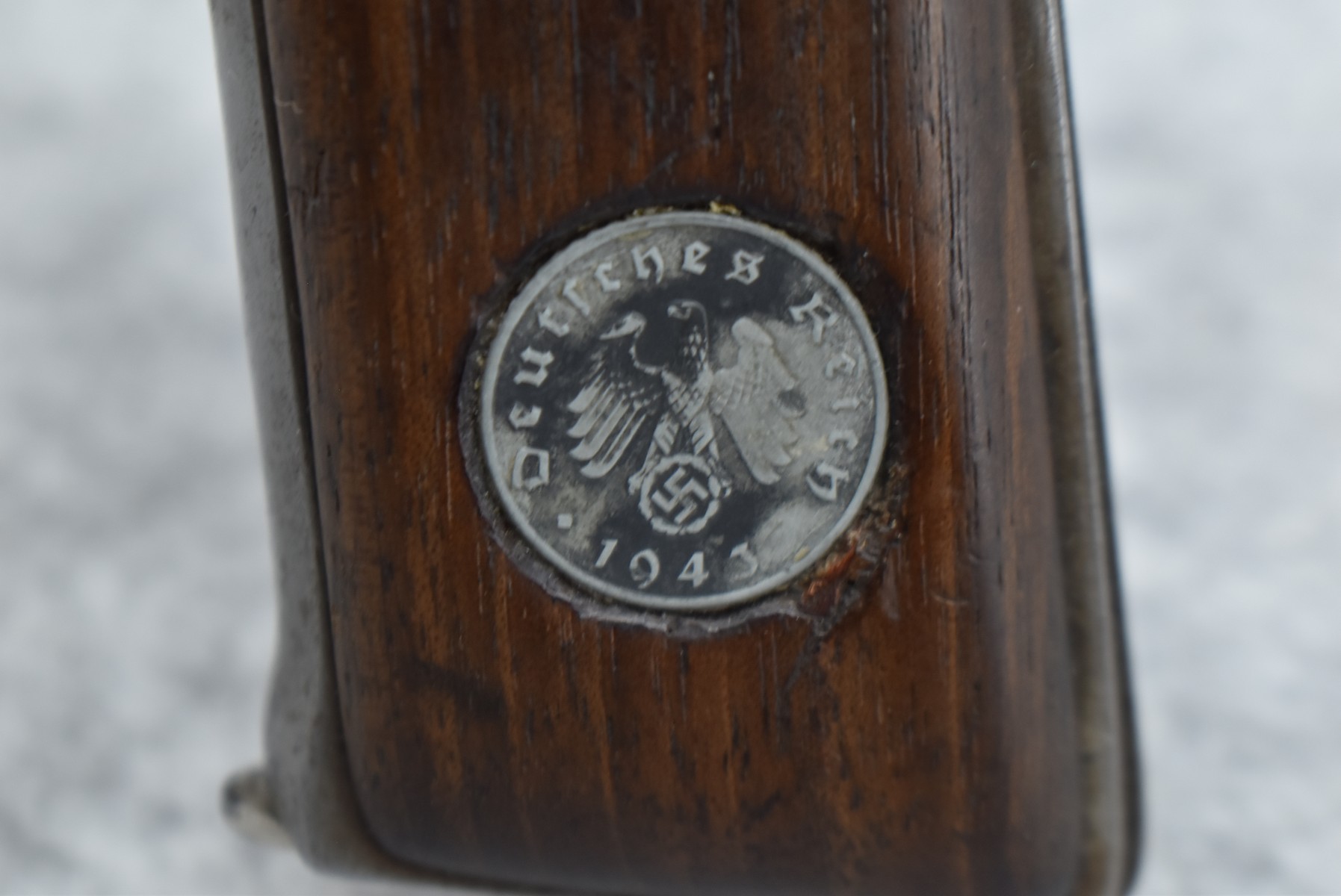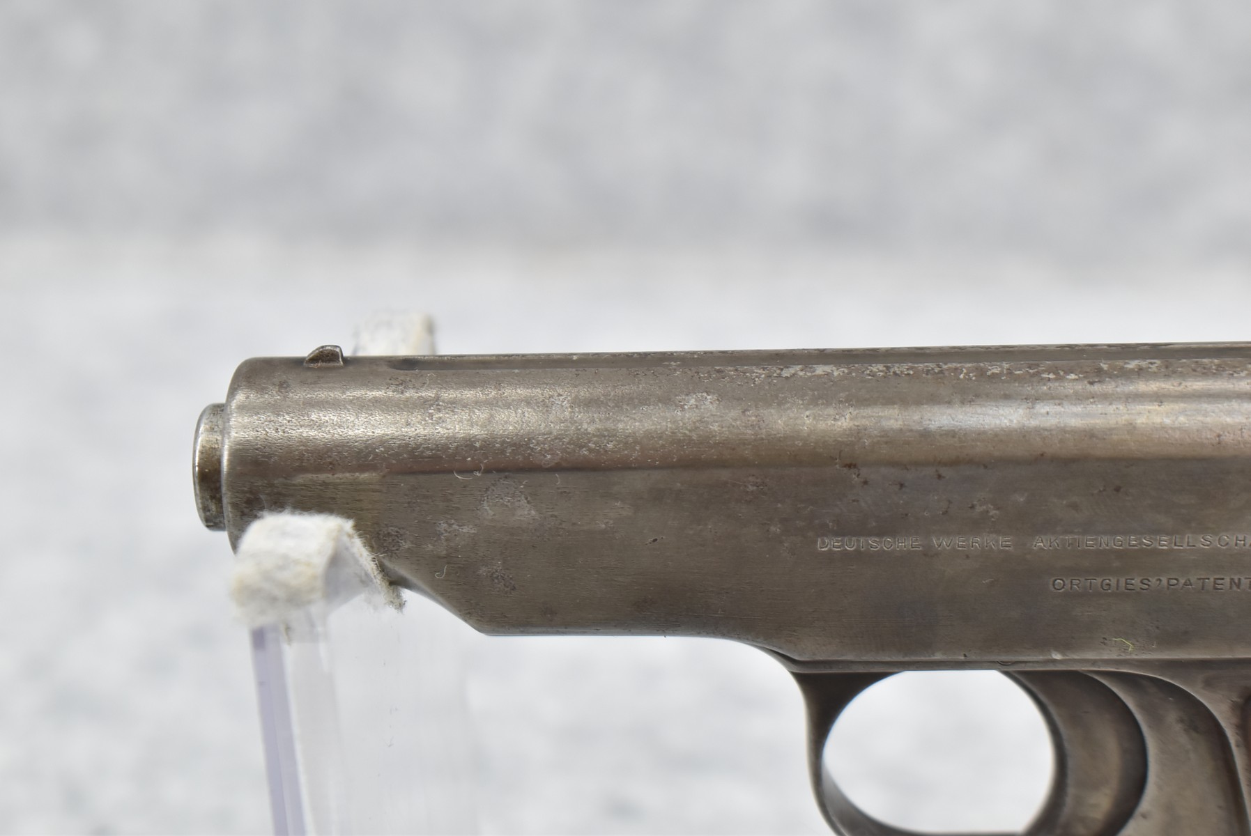 440R. Deutsche Werke – Mod. Ortgies Patent – 7.65mm Cal. Semi-Auto Pistol – w/2.5” Barrel w/Front Blade & Rear Groove Sights – Gray Finish – w/Smooth Wood Grips w/Medallion & German WWII Coin Placed in Left Grip – w/Wooden Box, Factory Magazine & German War Merit Cross