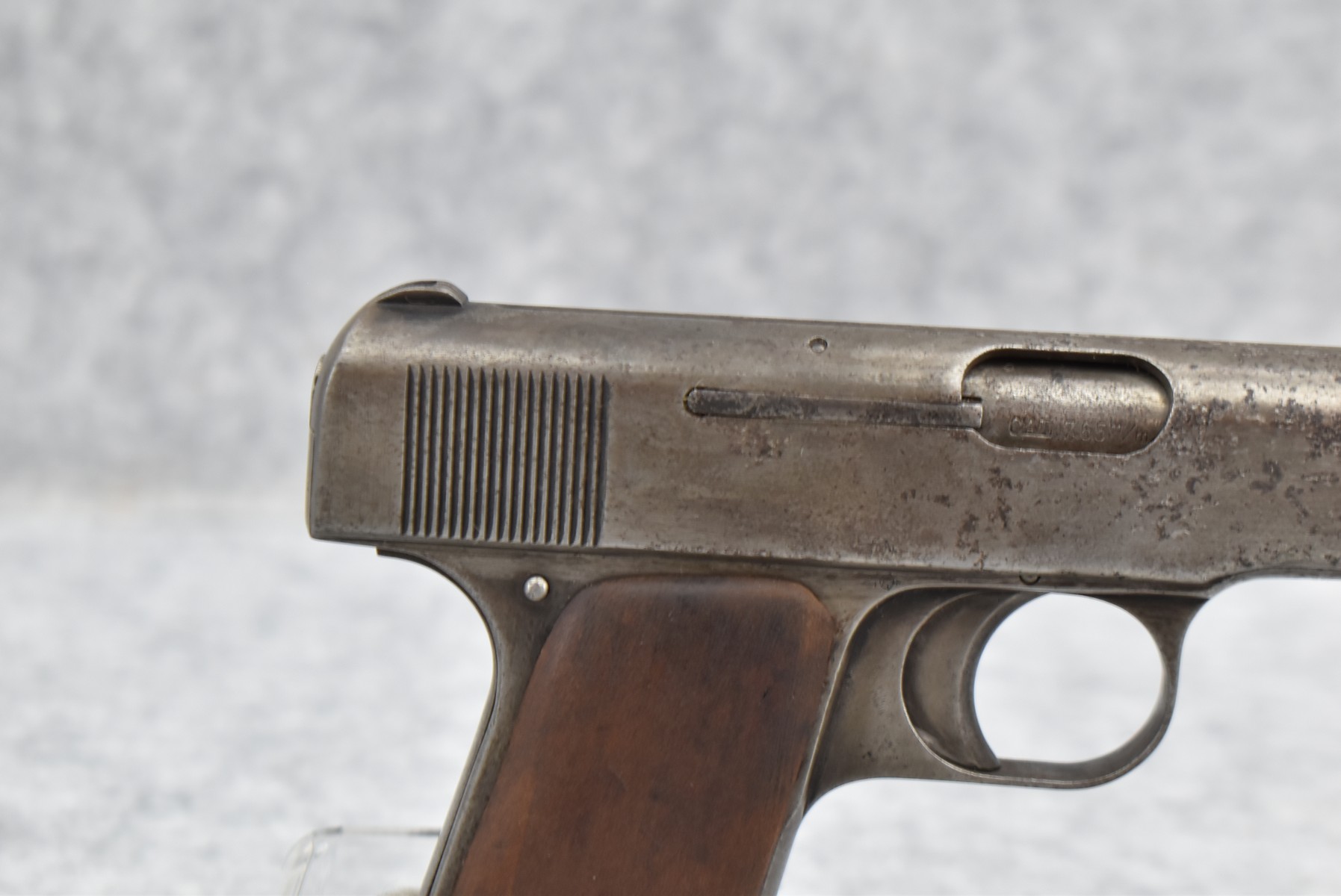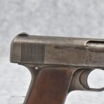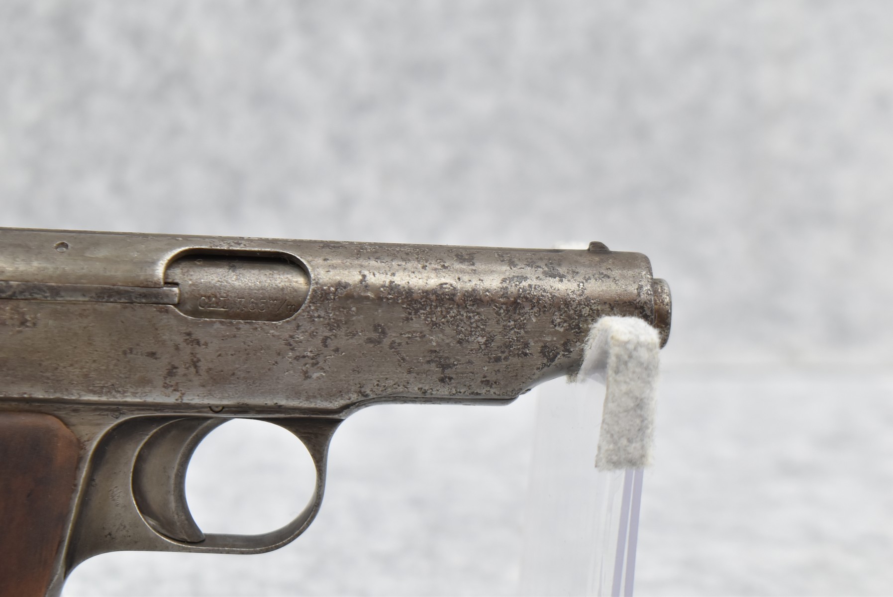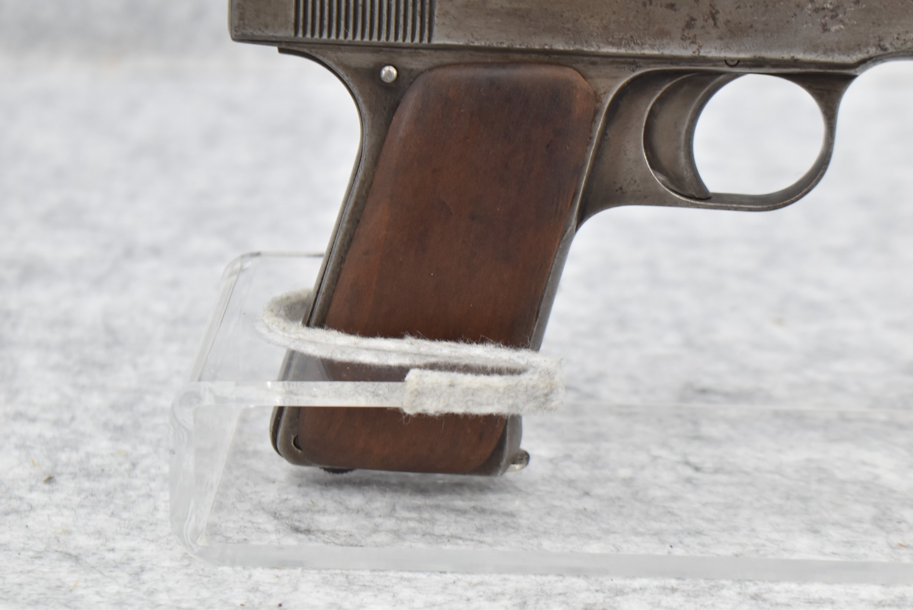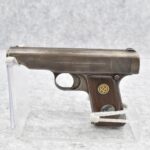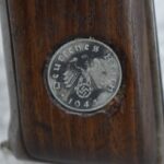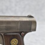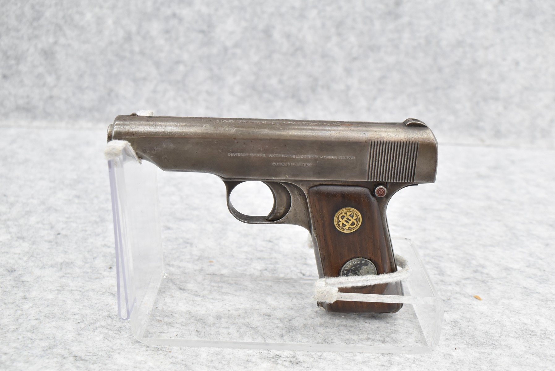 440R. Deutsche Werke – Mod. Ortgies Patent – 7.65mm Cal. Semi-Auto Pistol – w/2.5” Barrel w/Front Blade & Rear Groove Sights – Gray Finish – w/Smooth Wood Grips w/Medallion & German WWII Coin Placed in Left Grip – w/Wooden Box, Factory Magazine & German War Merit Cross