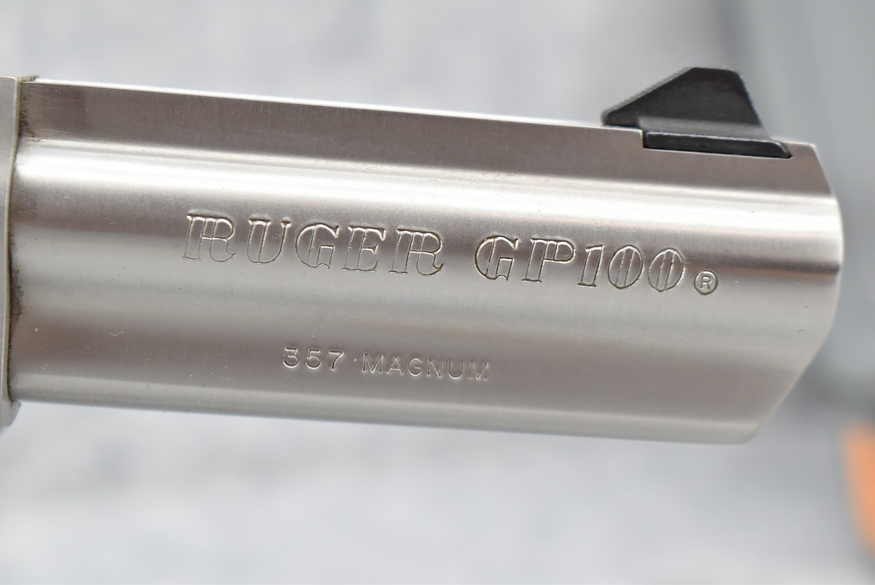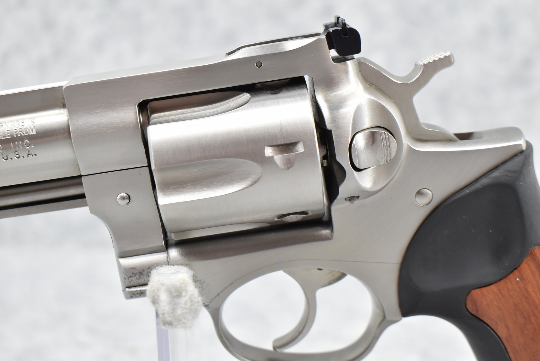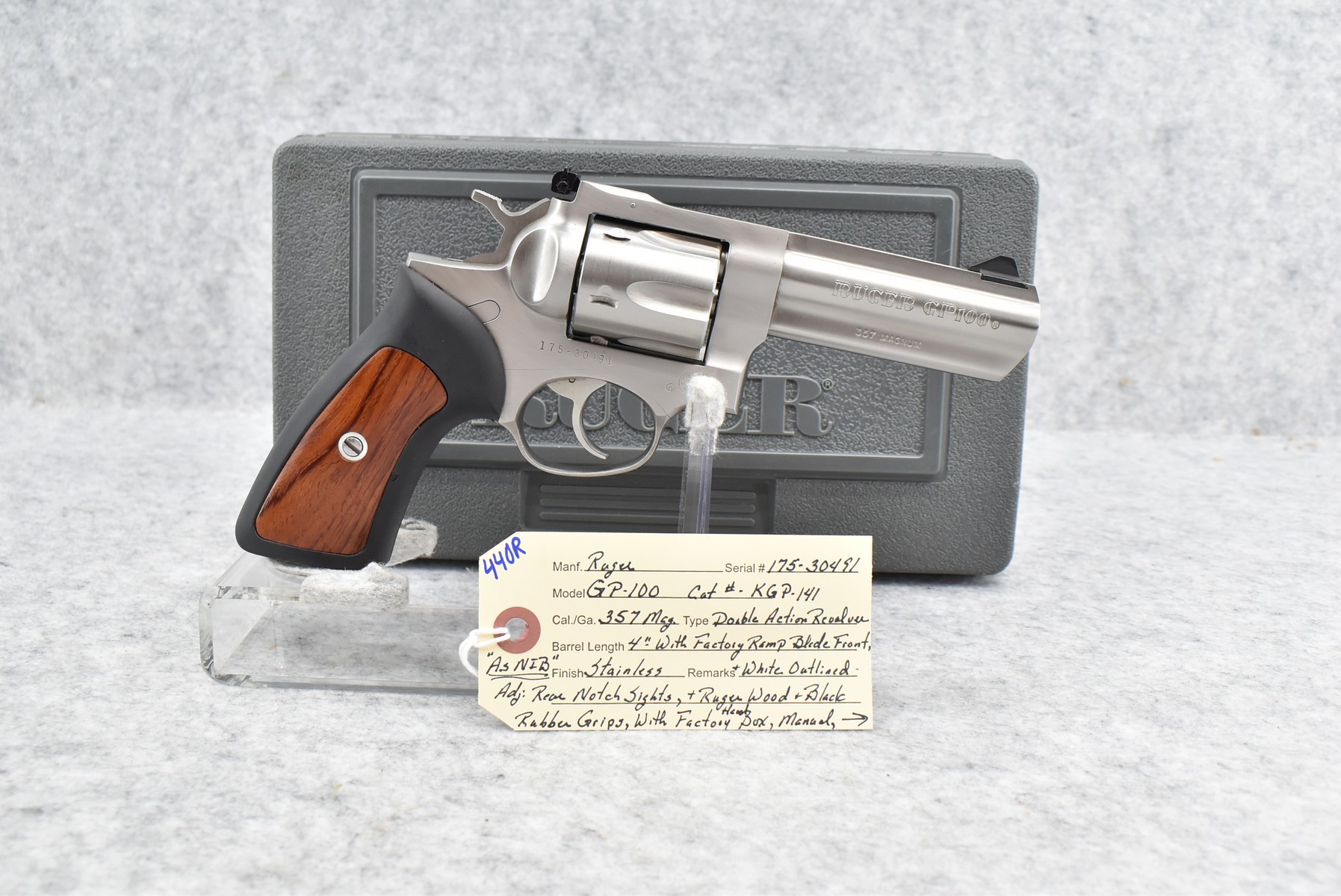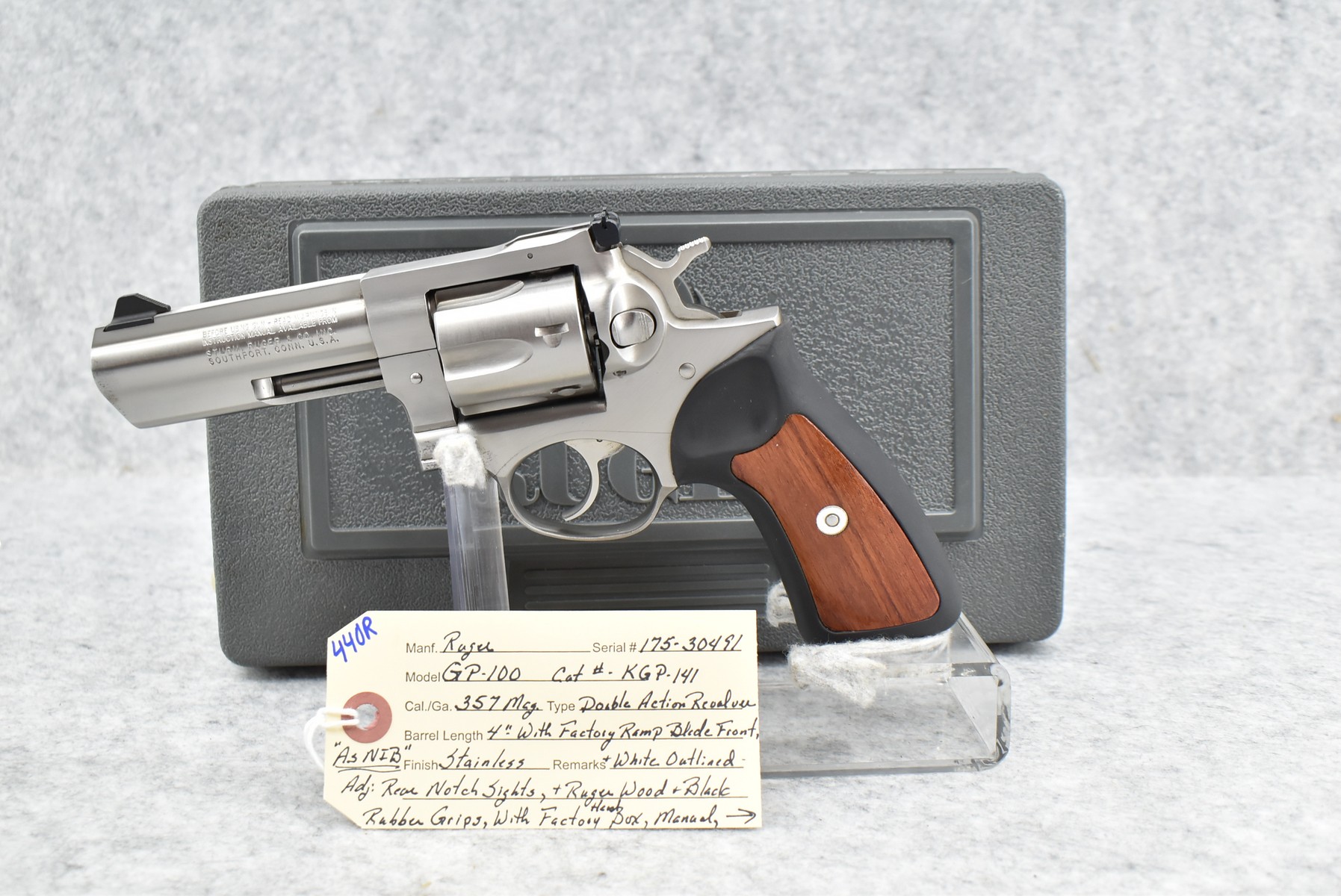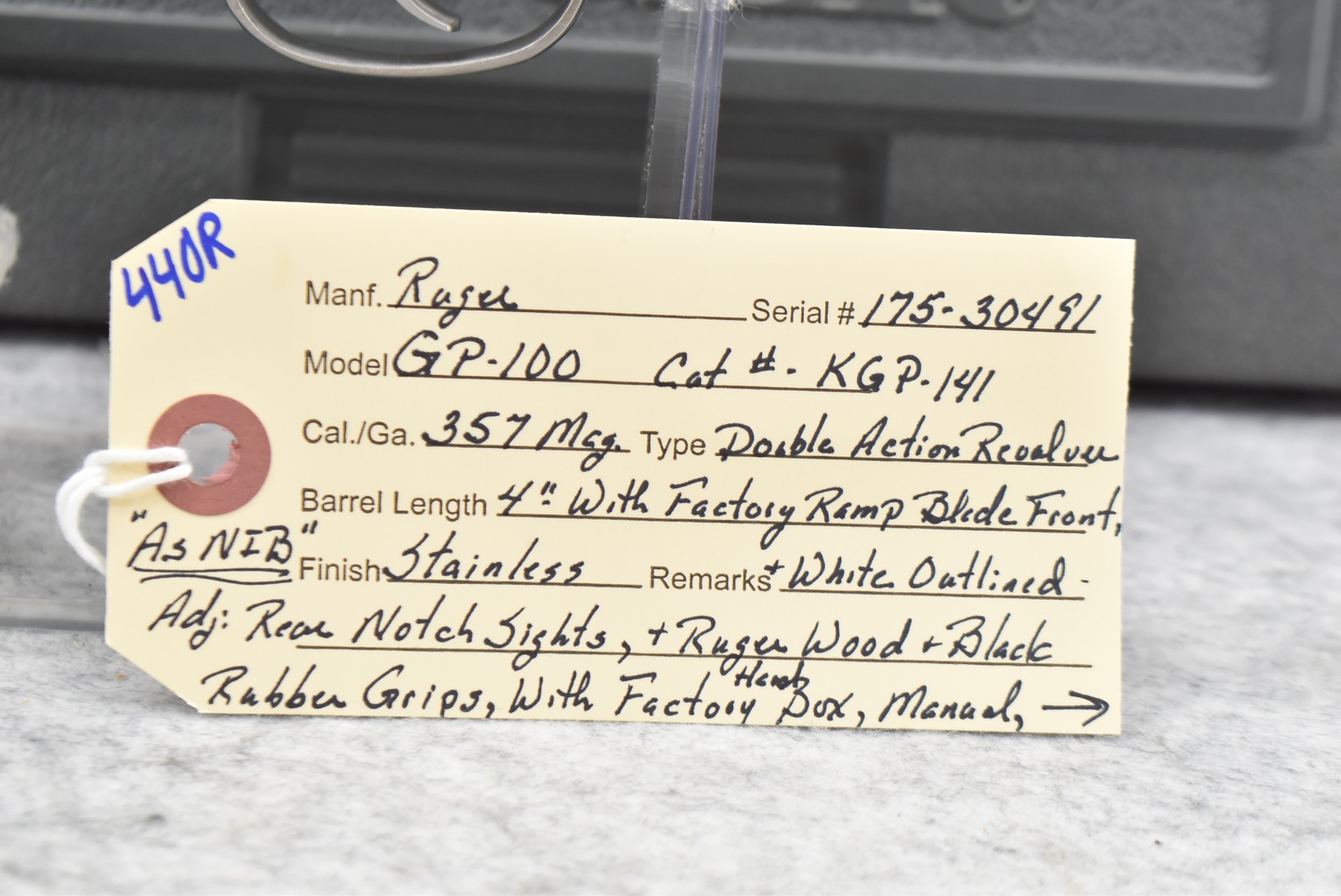 440R. Ruger – Mod. GP-100 (Category No. KGP-141) – 357 Mag. Cal. Double Action Revolver – w/4” Barrel w/Factory Ramp Blade Front and White Outlined Adjustable Rear Notch Sights – Stainless Finish – w/Ruger Wood and Black Rubber Grips – Unfired w/Factory Hard Case, Manual, and Accessories
