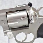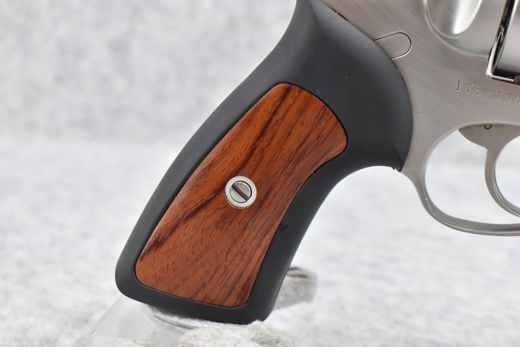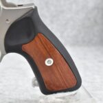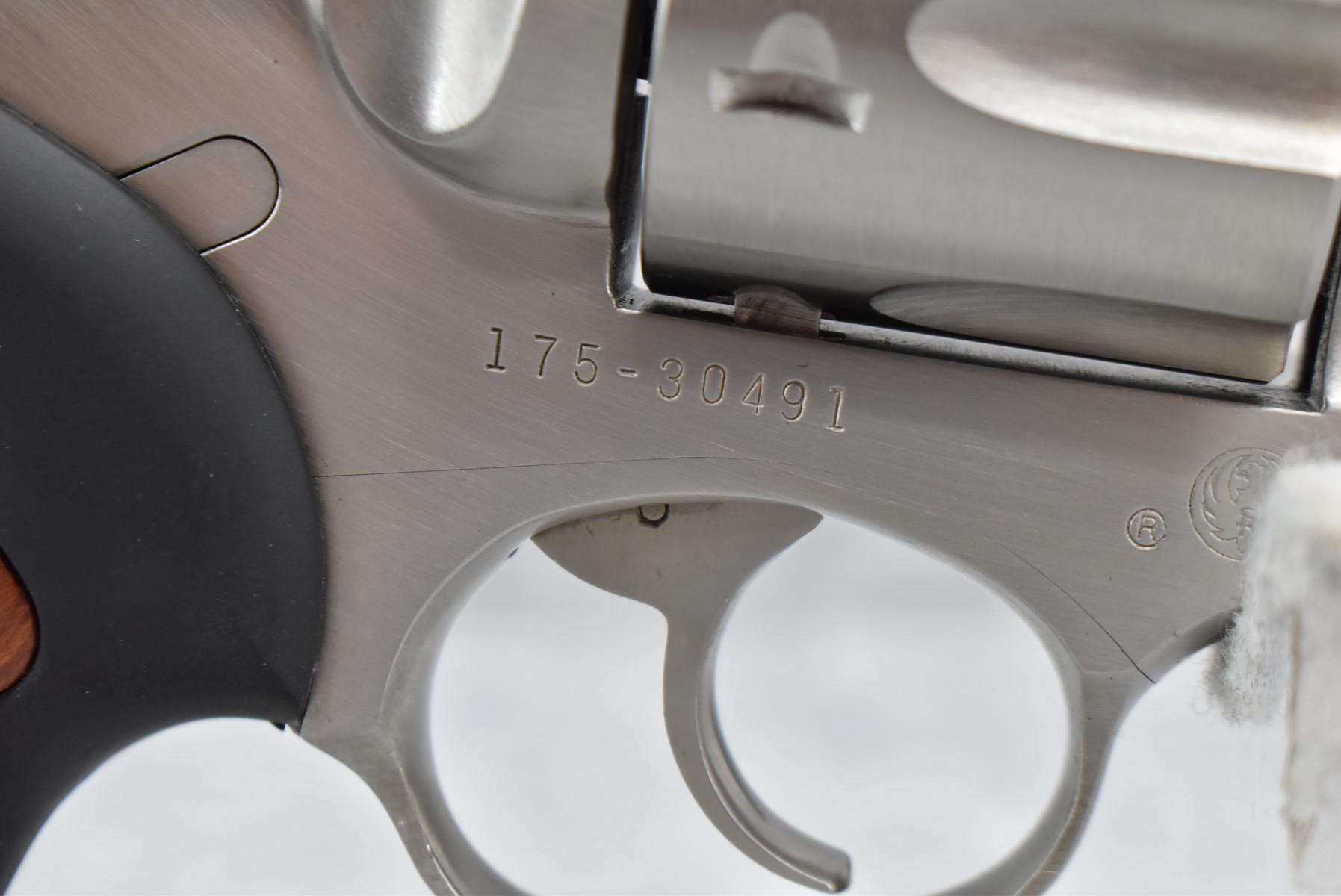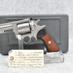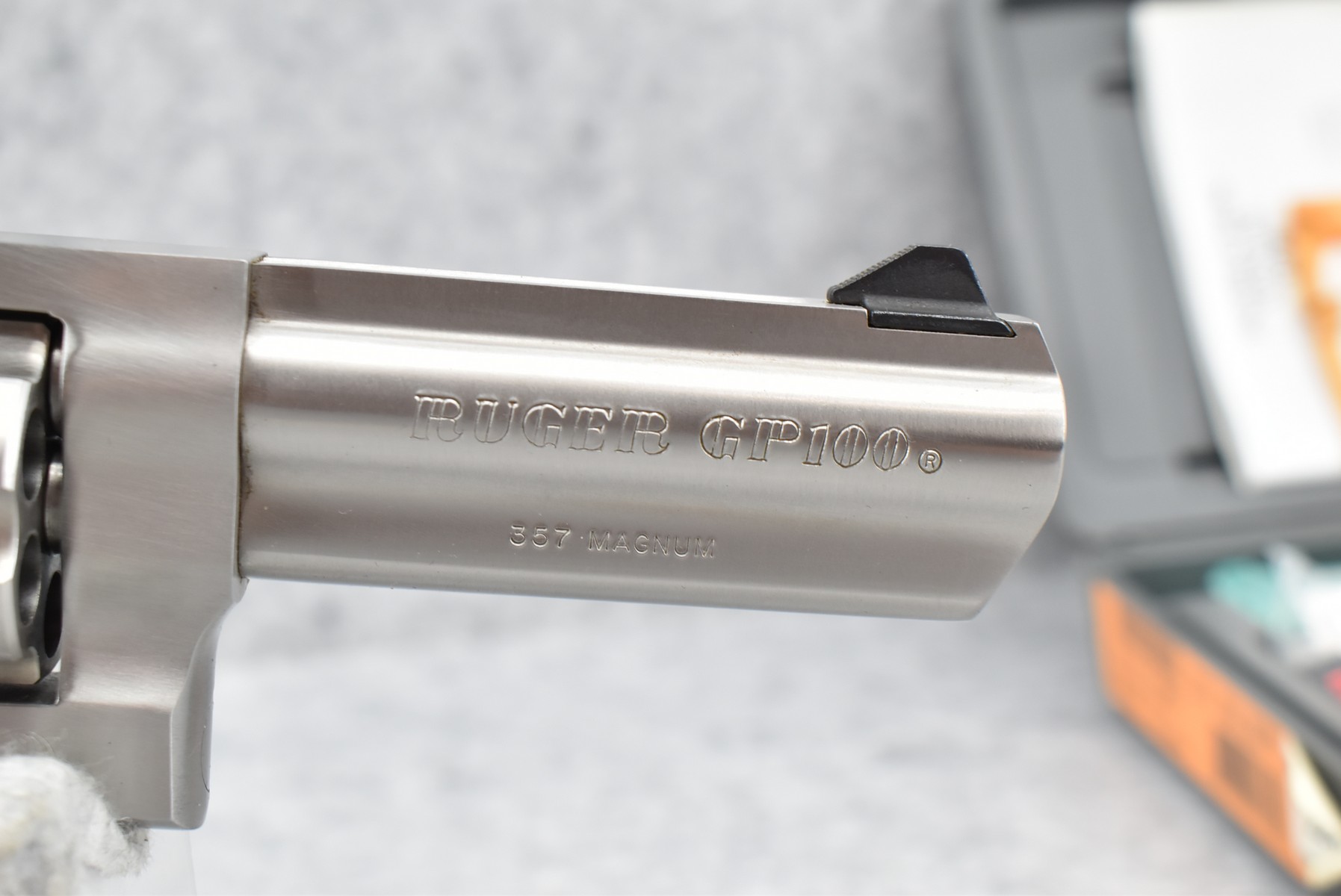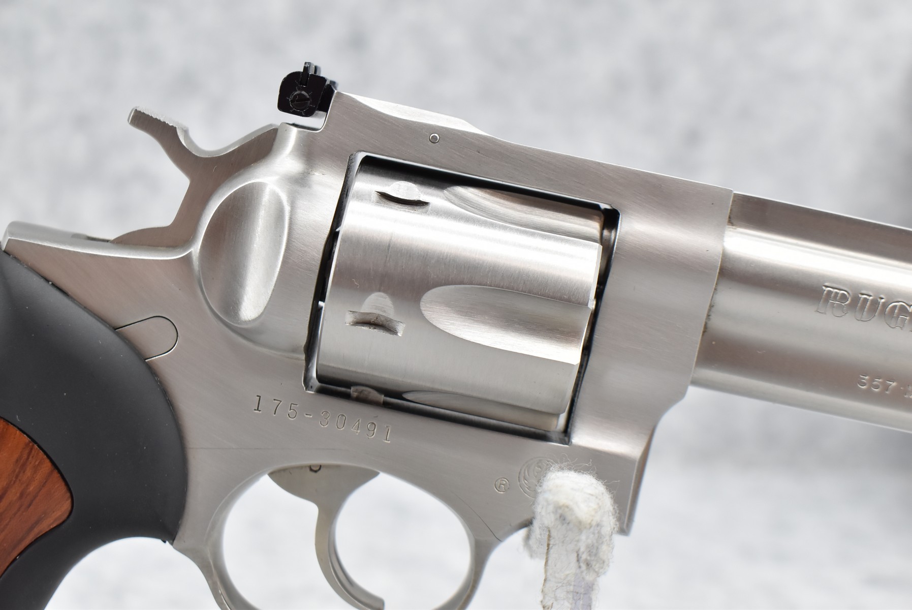440R. Ruger – Mod. GP-100 (Category No. KGP-141) – 357 Mag. Cal. Double Action Revolver – w/4” Barrel w/Factory Ramp Blade Front and White Outlined Adjustable Rear Notch Sights – Stainless Finish – w/Ruger Wood and Black Rubber Grips – Unfired w/Factory Hard Case, Manual, and Accessories