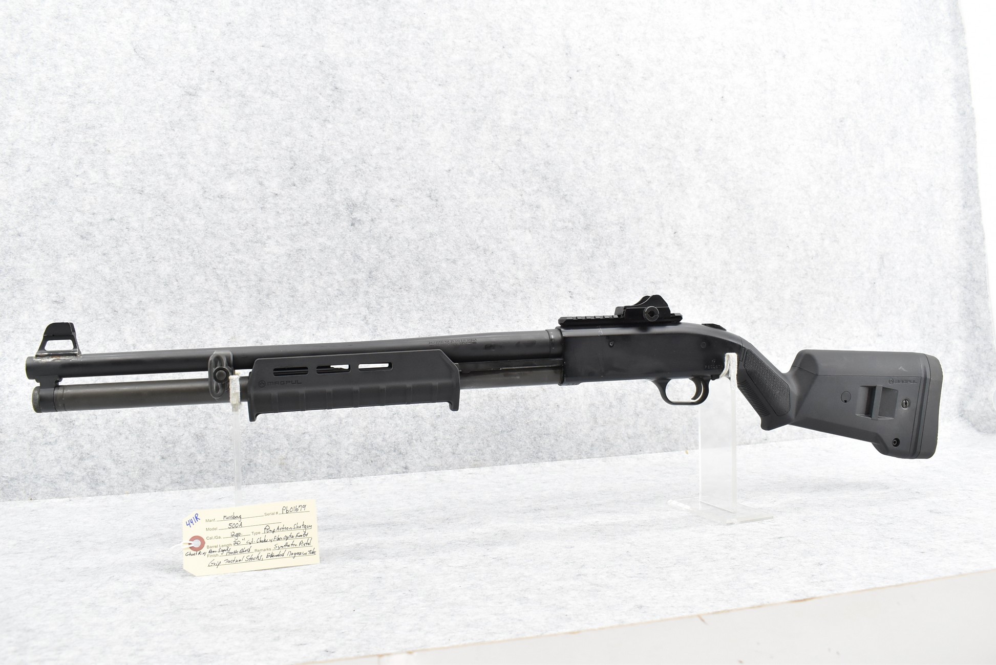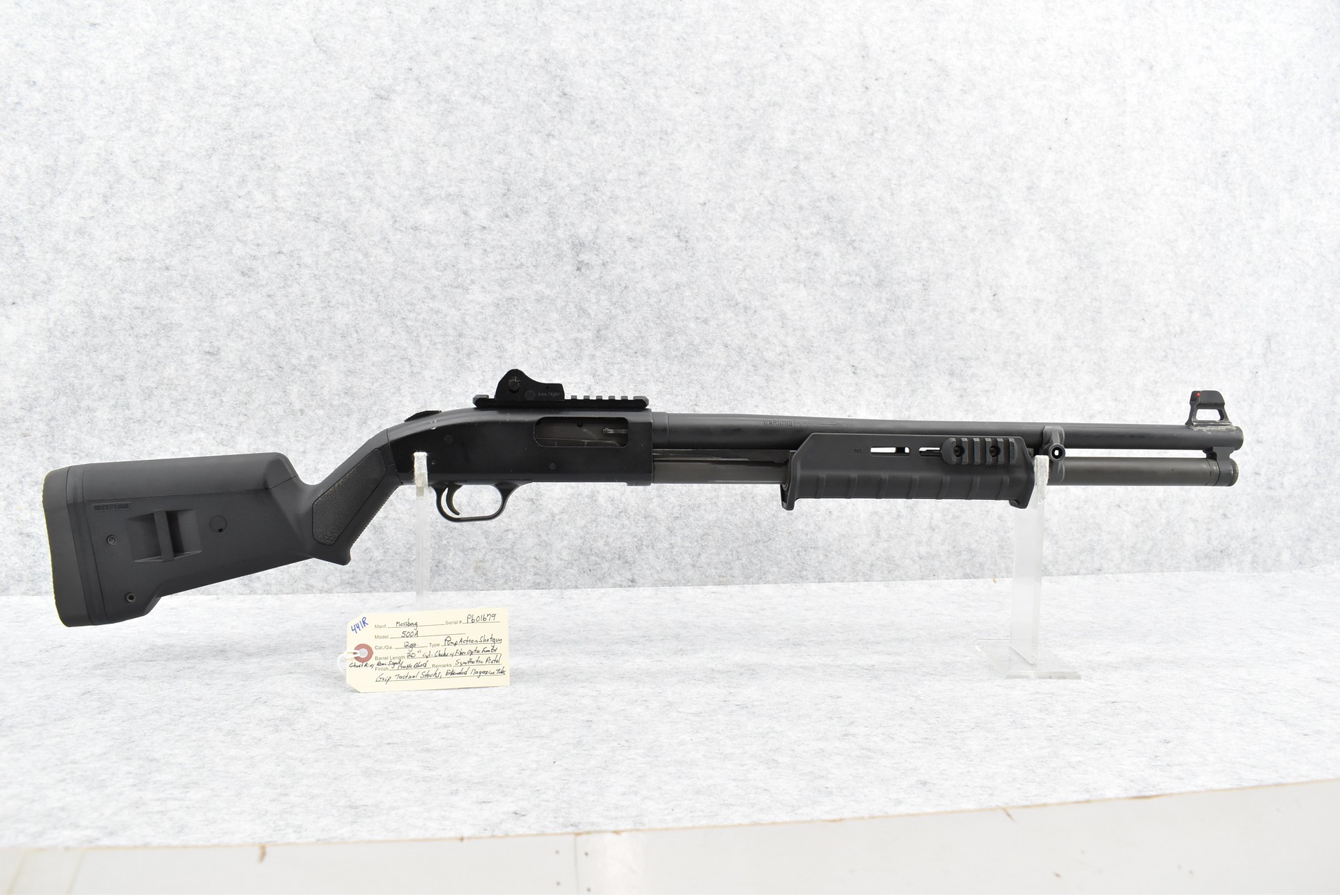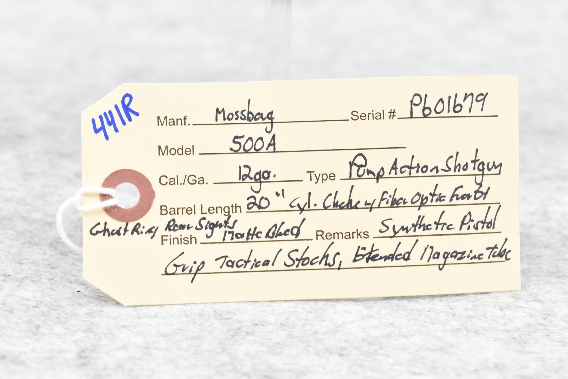 441R. Mossberg – Mod. 500A – 12ga. Pump Action Shotgun – w/20” Cyl. Choked Barrel w/Fiber Optic Front and Ghost Ring Rear Sights – Matte Blued Finish – w/Synthetic Pistol Grip Tactical Stocks – w/Extended Magazine Tube