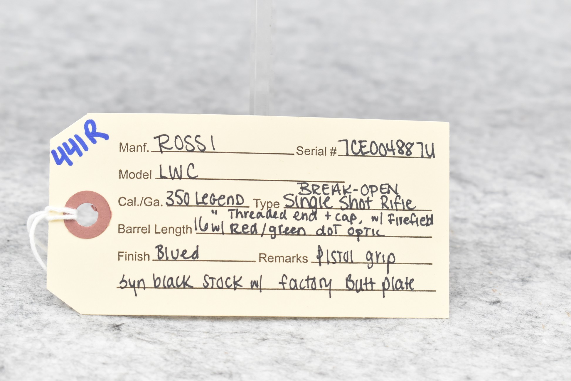 441R. Rossi – Mod. LWC – 350 Legend Cal. Single Shot Rifle – w/16” Barrel w/Threaded Muzzle & Cap – Blued Finish – w/Pistol Grip Synthetic Black Stock w/Factory Butt Plate – w/Firefield Red/Green Dot Optic