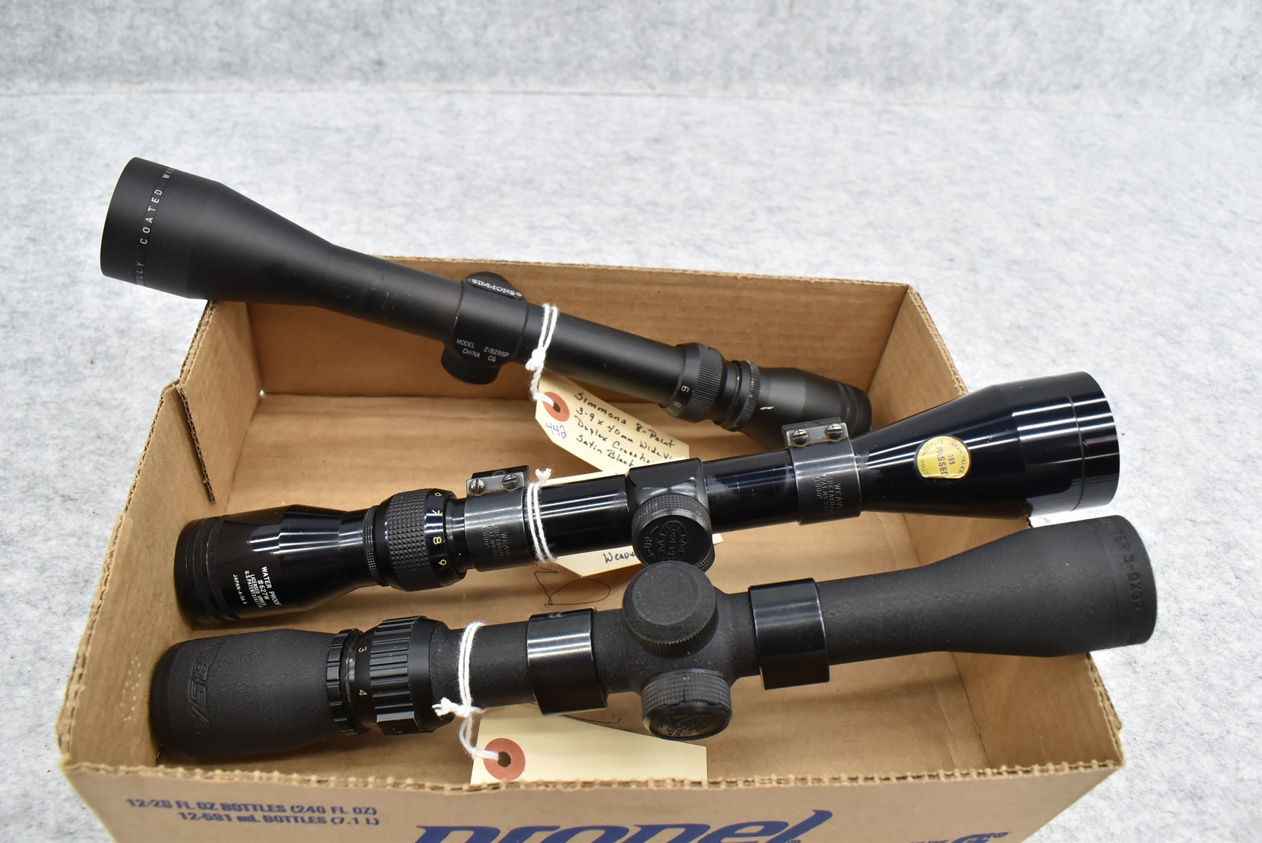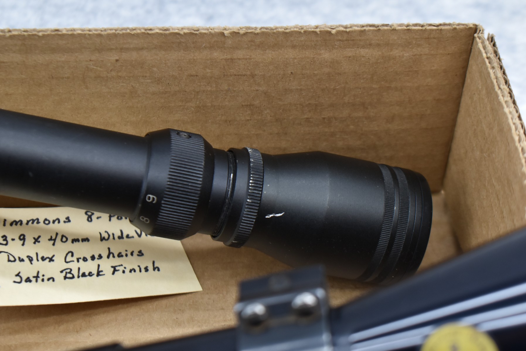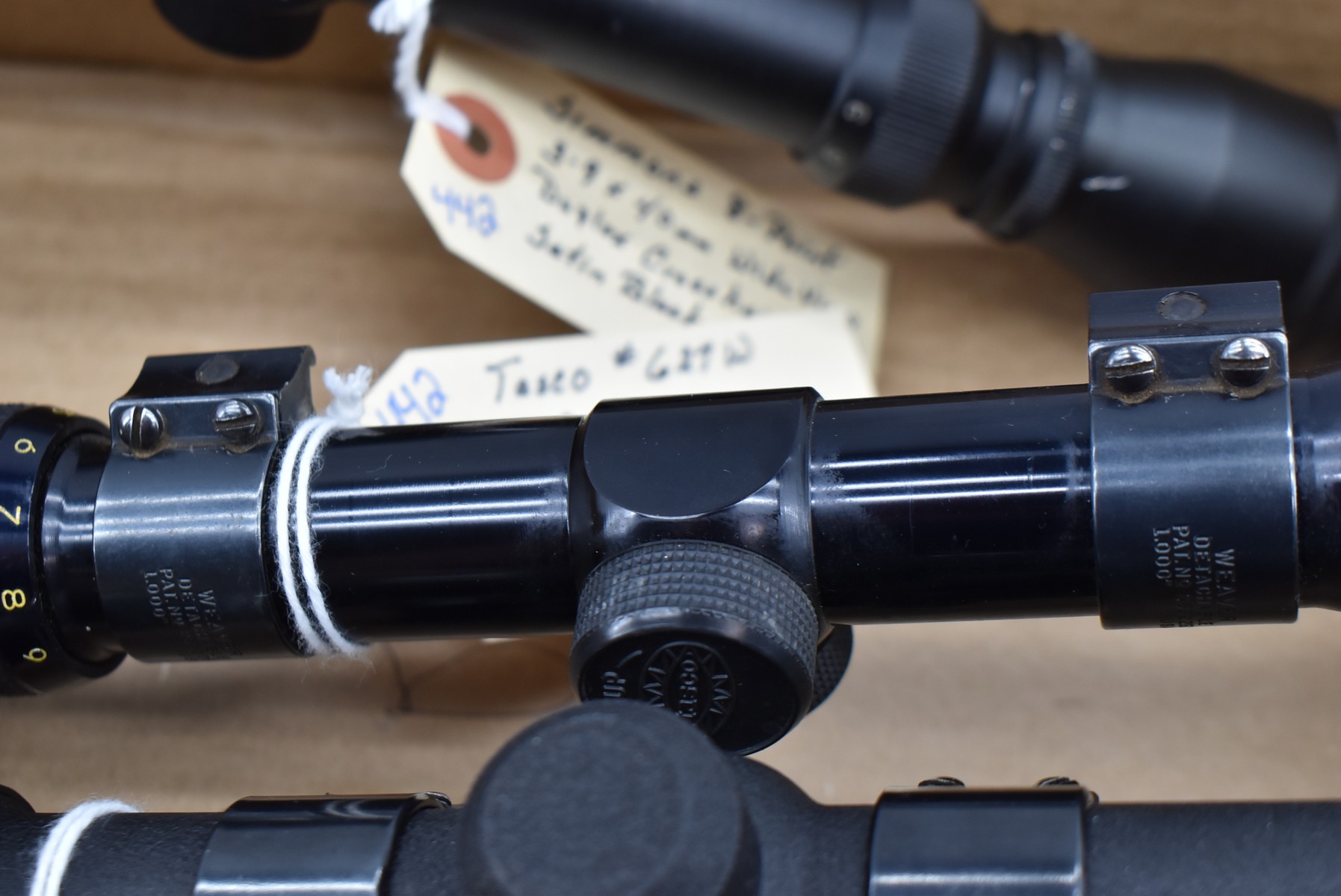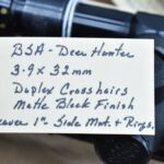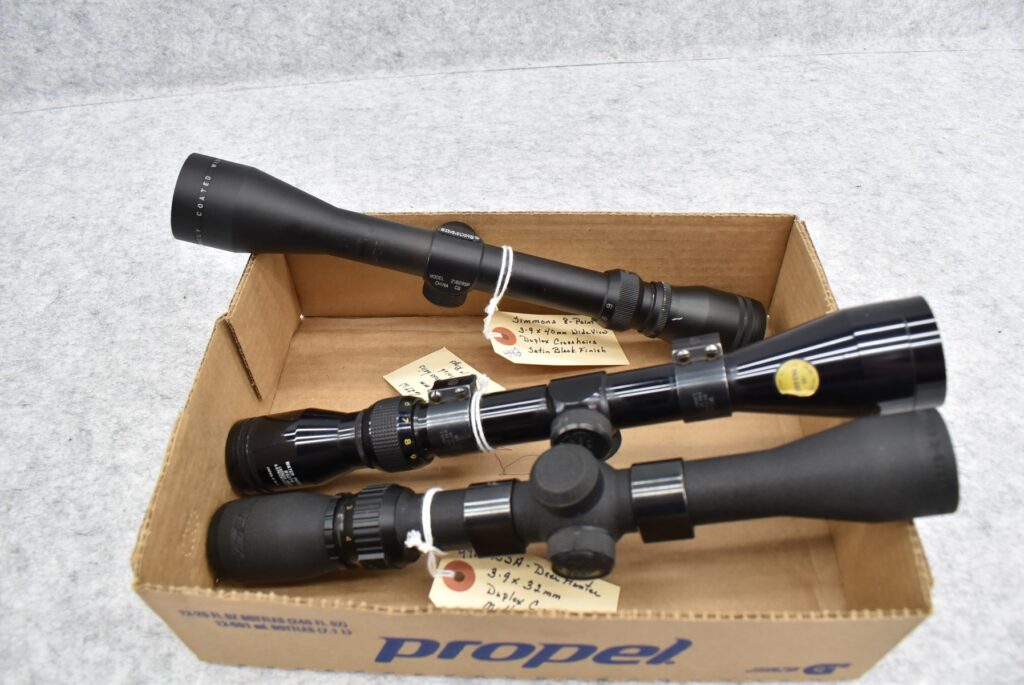 442. Lot of 3 Scopes – 1st is Simmons 8-Point – 3-9x40mm Wide View Duplex Crosshairs Scope – Satin Black Finish – 2nd is Tasco #627W – 3-9x40mm Duplex Crosshairs Scope – Black Finish – w/Weaver 1” Rings – 3rd is BSA Deer Hunter – 3-9x32mm Duplex Crosshairs Scope – Matte Black Finish – w/Weaver 1” Side Mount & Rings