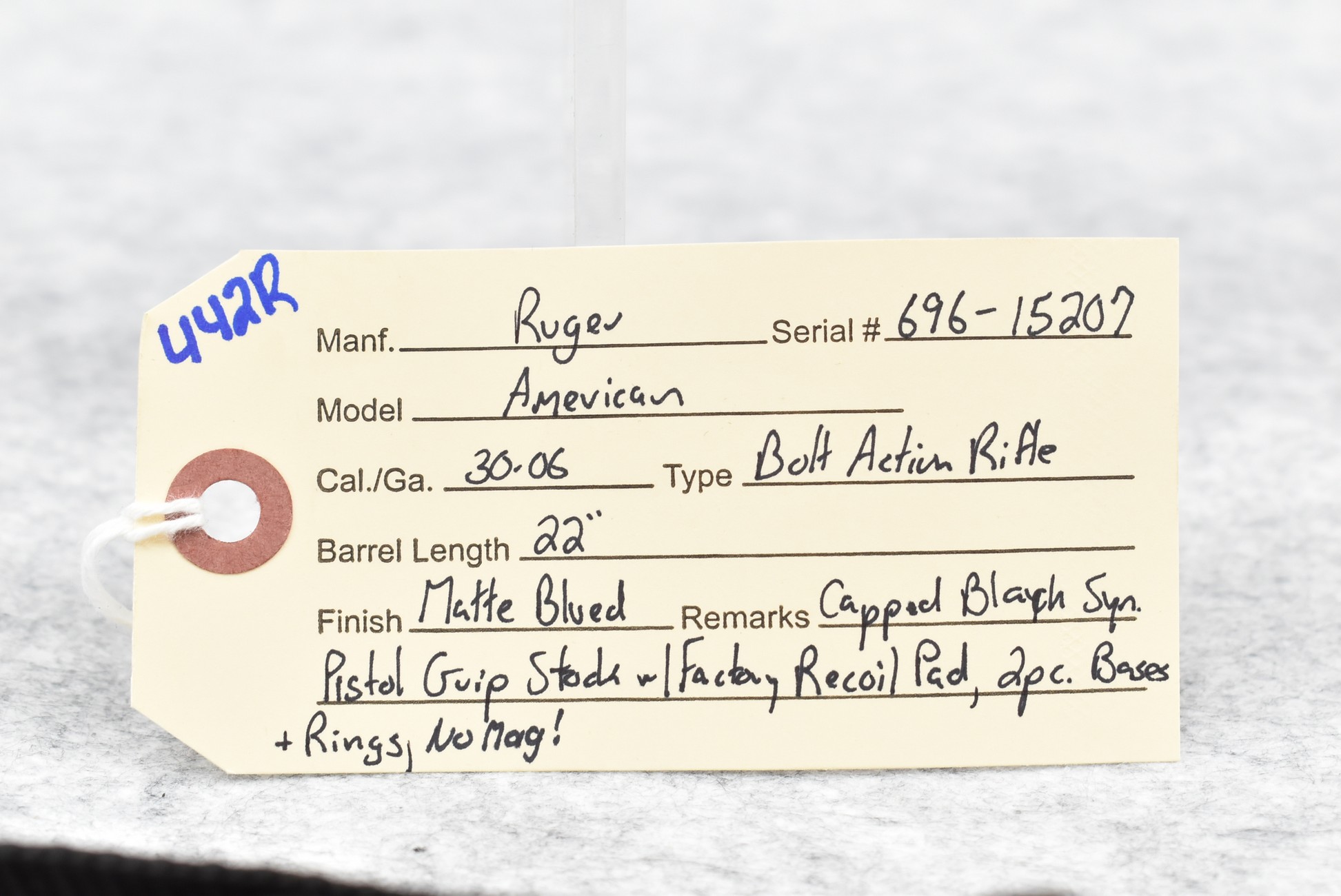 442R. Ruger – Mod. American – 30-06 Cal. Bolt Action Rifle – w/22” Barrel – Matte Blued Finish – w/Capped Black Synthetic Pistol Grip Stock w/Factory Recoil Pad – w/2-Piece Scope Rings and Bases – No Magazine