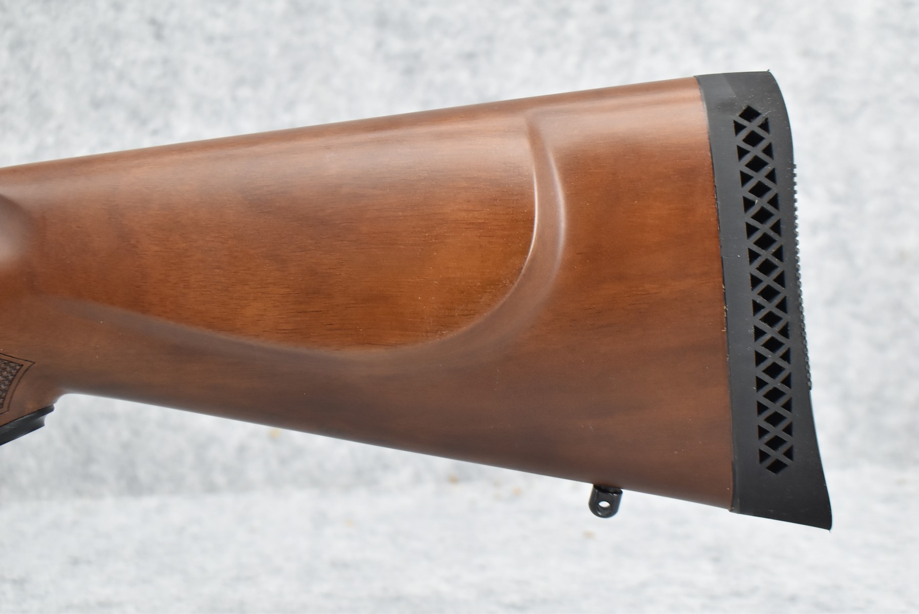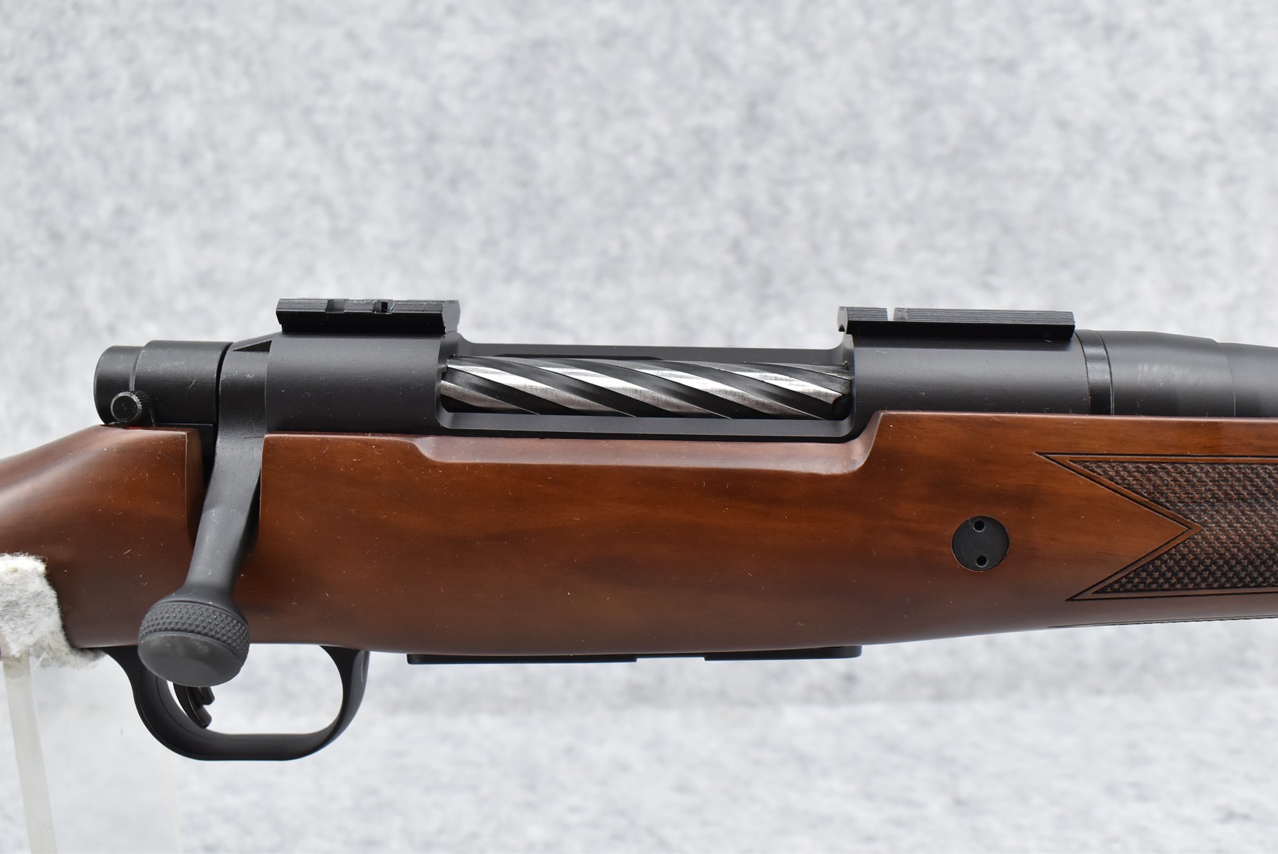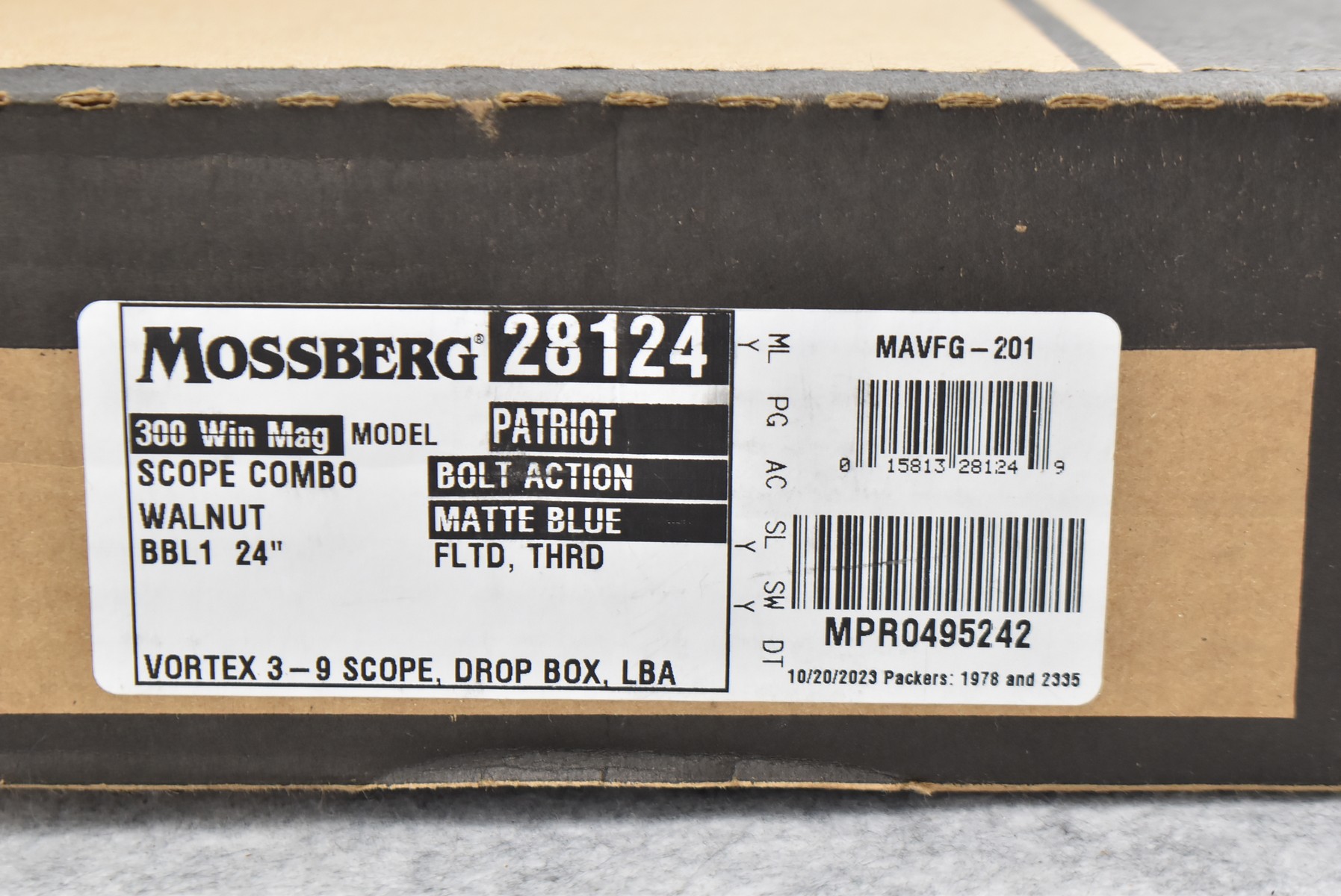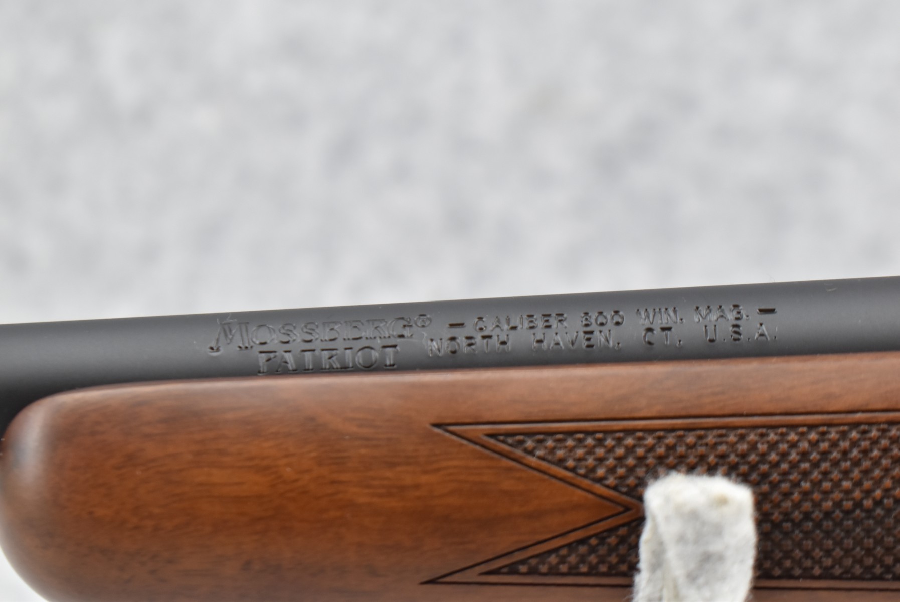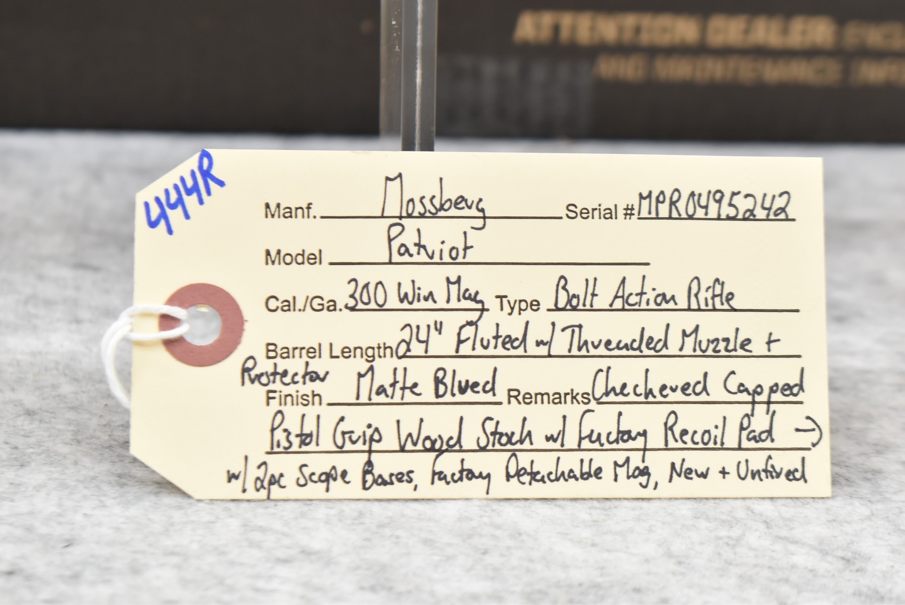 444R. Mossberg – Mod. Patriot – 300 Win. Mag. Cal. Bolt Action Rifle – w/24” Fluted Barrel w/Threaded Muzzle and Cap – Matte Blued Finish – w/Checkered Capped Pistol Grip Wood Stock w/Factory Recoil Pad – w/2-Piece Scope Bases – Unfired w/Factory Box, Manual, and Factory Detachable Magazine
