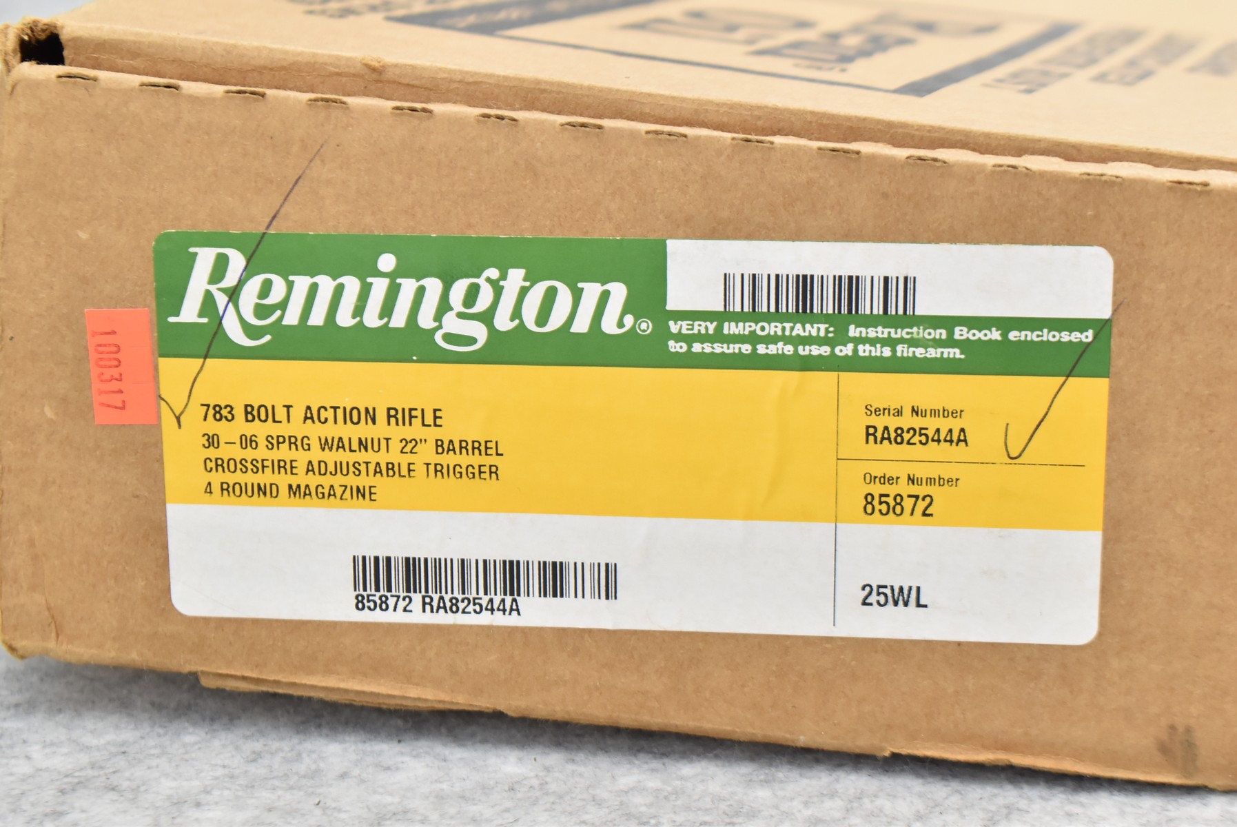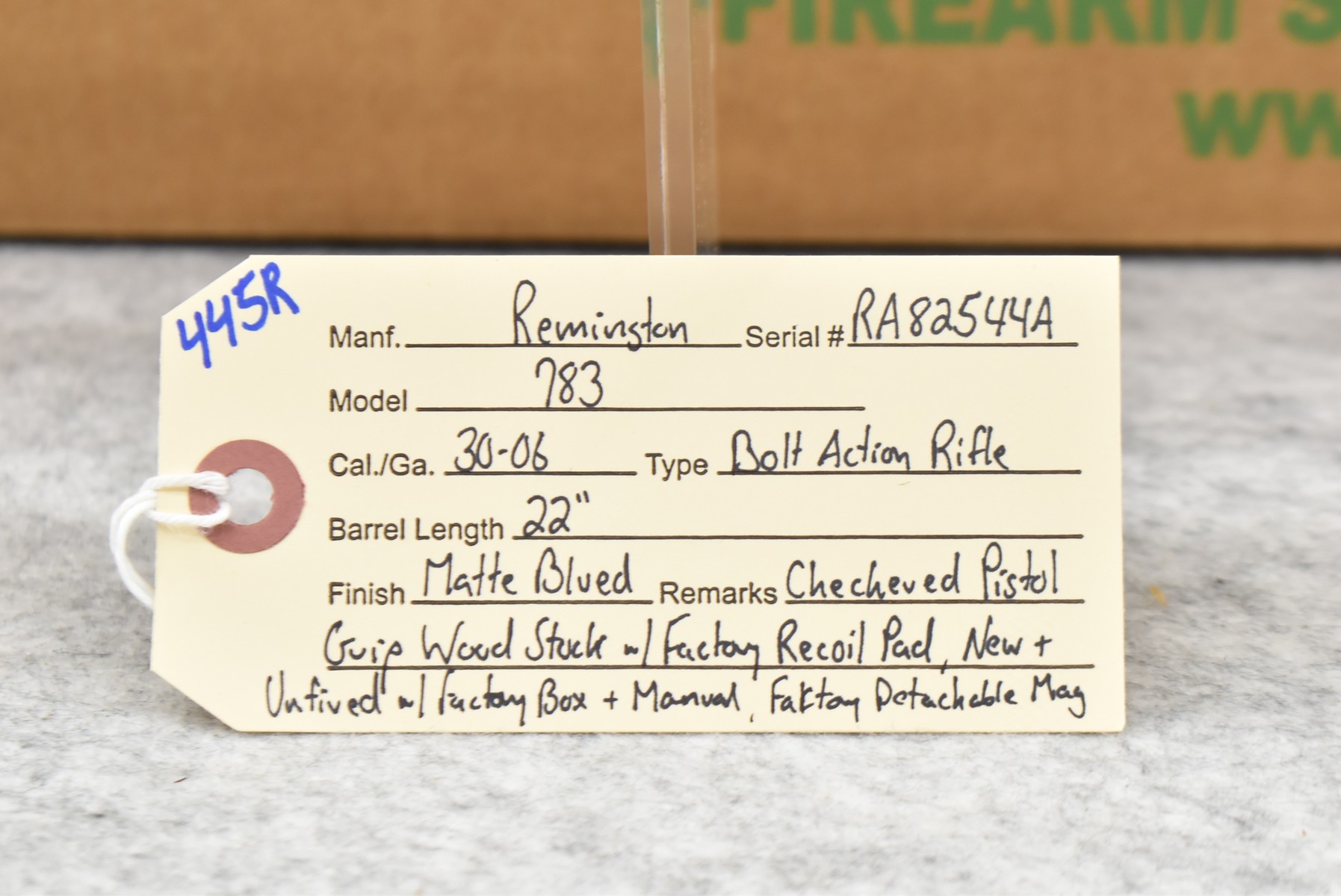 445R. Remington – Mod. 783 – 30-06 Cal. Bolt Action Rifle – w/22” Barrel – Matte Blued Finish – w/Checkered Pistol Grip Wood Stock w/Factory Recoil Pad – Unfired w/Factory Box, Manual, and Factory Detachable Magazine
