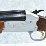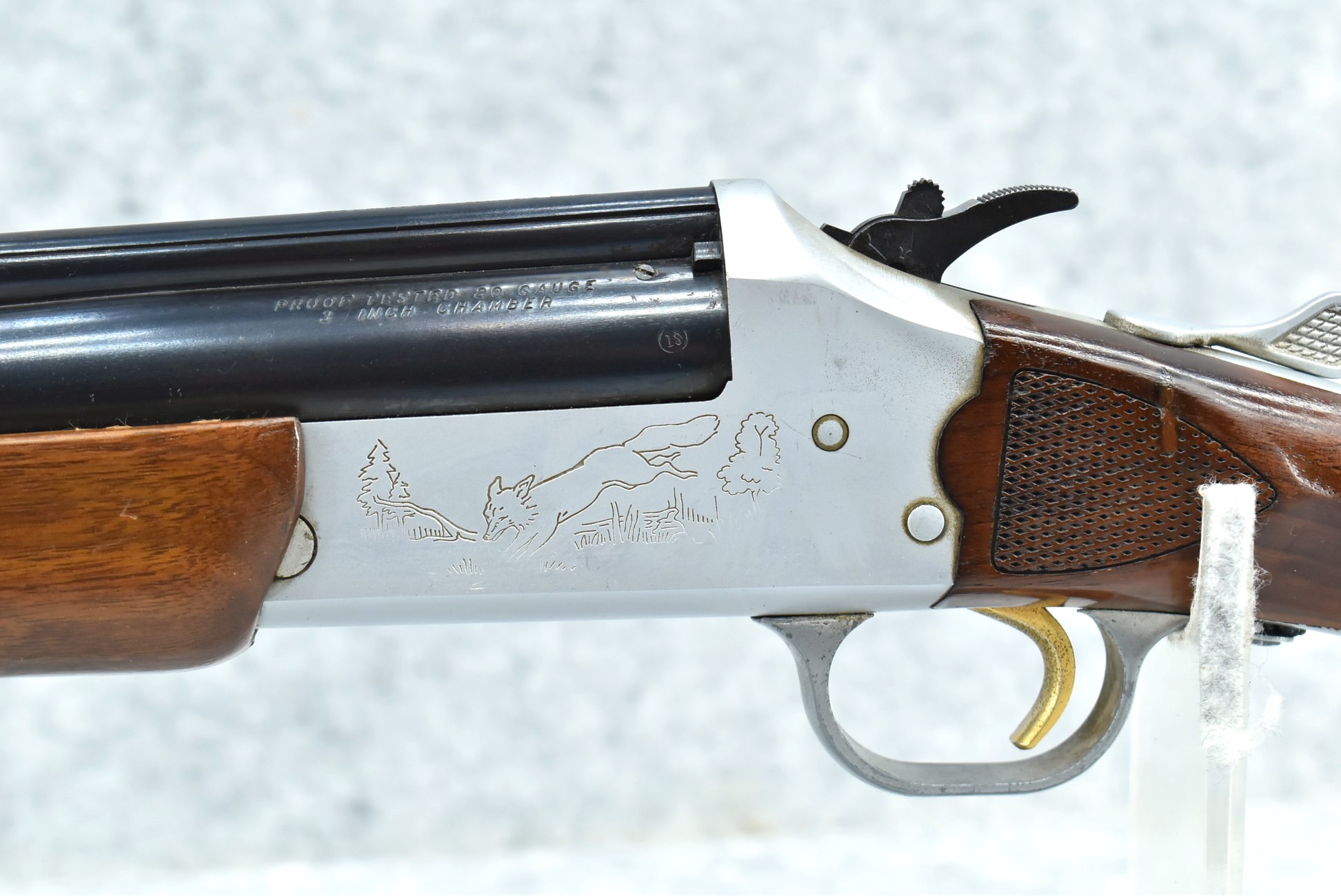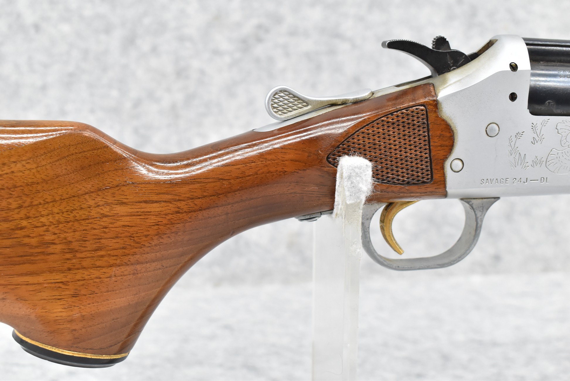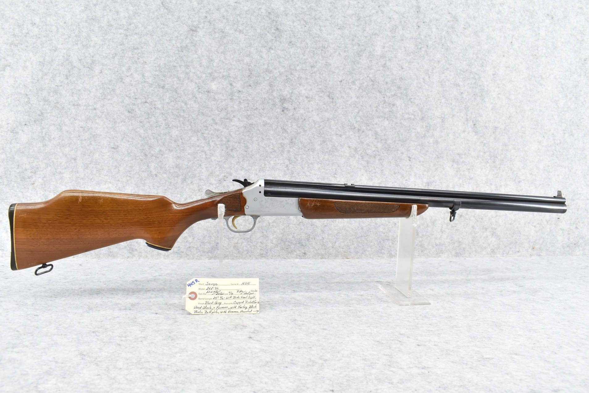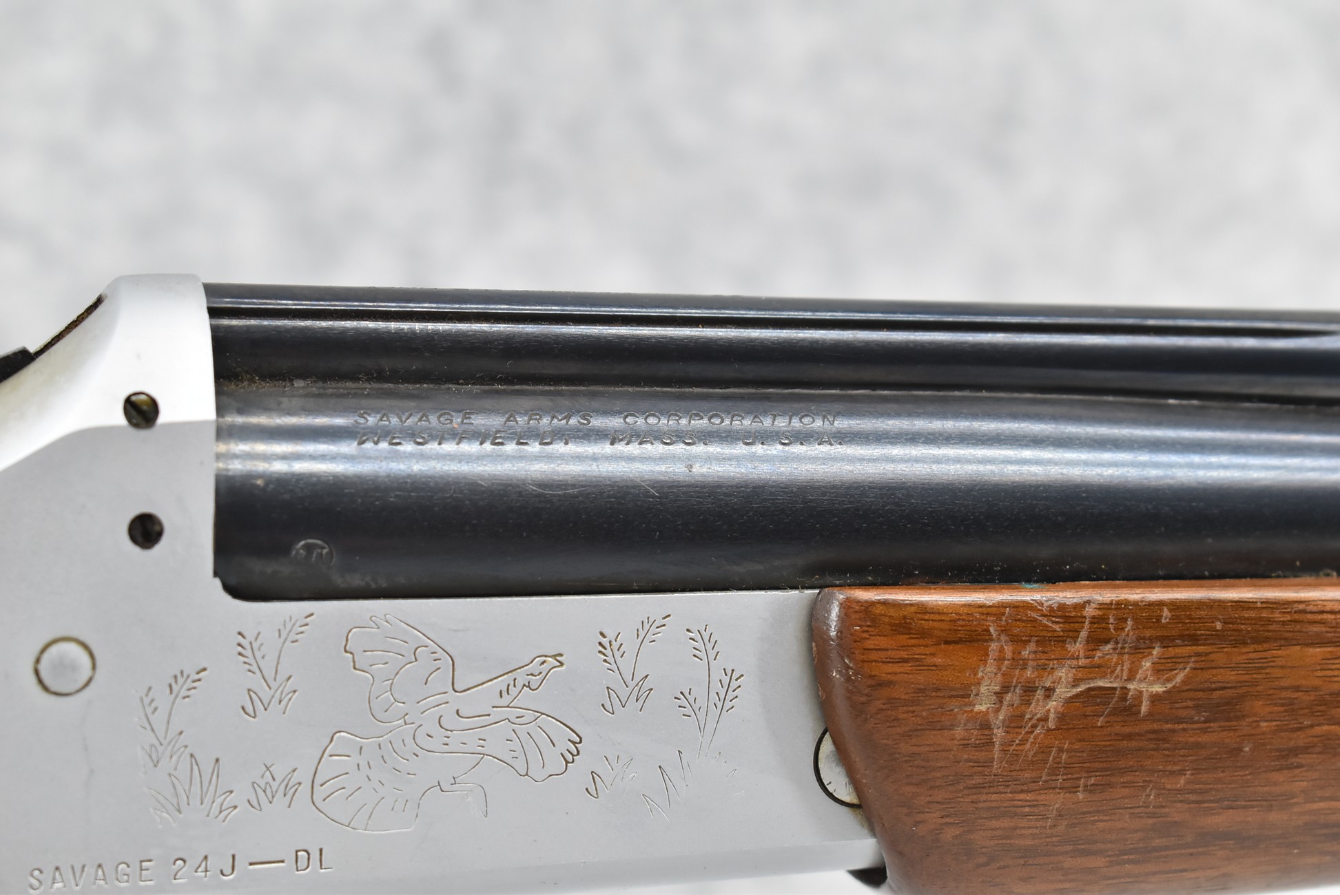 445R. Savage – Mod. 24J-DL – 22 WMR Cal. Over 20ga. Rifle/Shotgun Combo – w/24” Barrels w/Blade Front Sight – Blued/Silver Finish – w/Fox & Turkey Scenes on Sides of Frame – w/Capped Pistol Grip Wood Stocks w/Factory Butt Plate – w/Hammer Mounted Barrel Selector