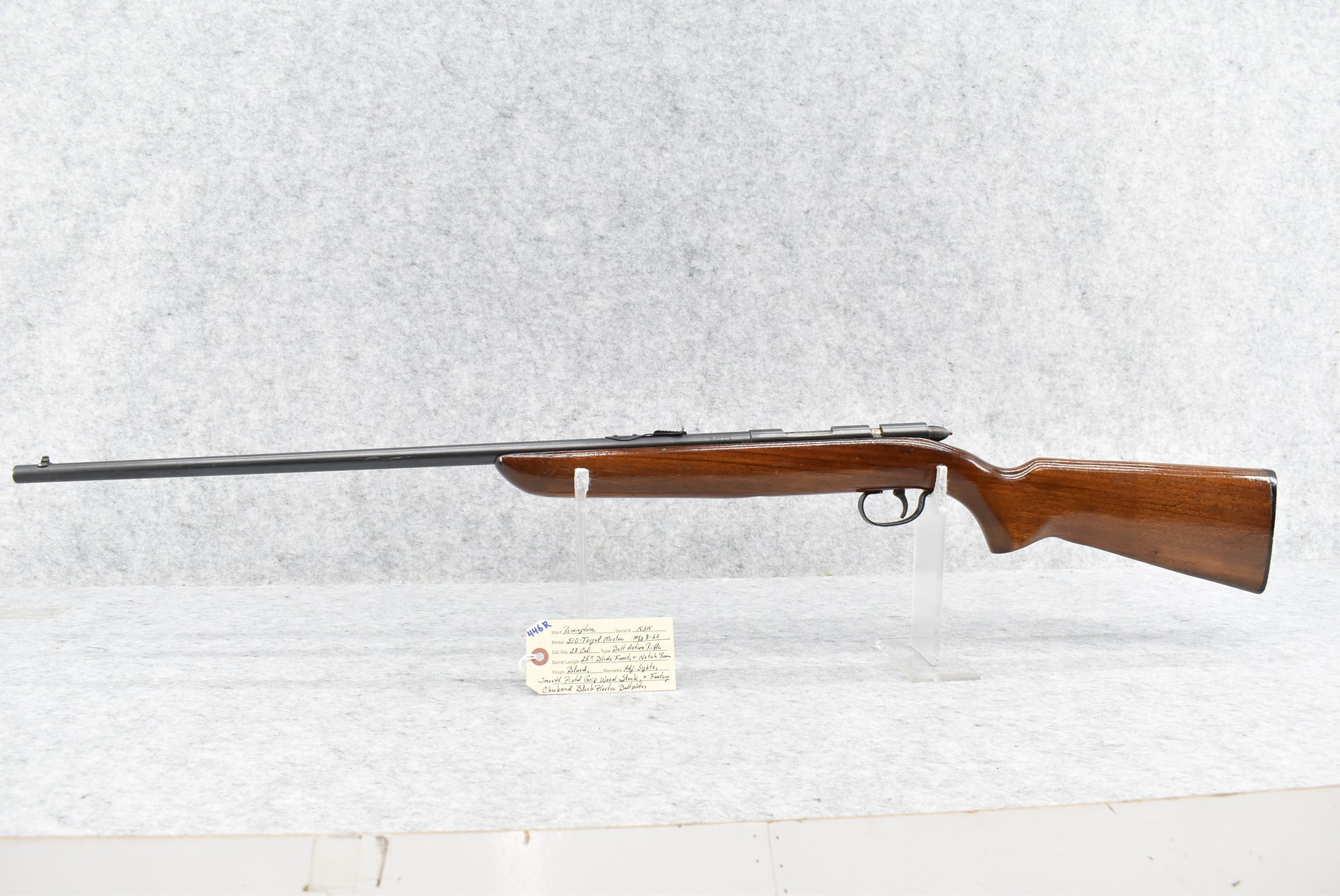 446R. Remington – Mod. 510 Target Master – 22 Cal. Bolt Action Rifle – w/25” Barrel w/Blade Front & Notch Rear Adj. Sights – Blued Finish – w/Smooth Pistol Grip Wood Stock w/Factory Butt Plate